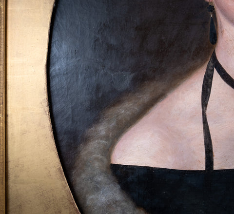 A 19th portrait of large proportions depicting a seated lady wearing a black gown and fur shawl. Oil on canvas.