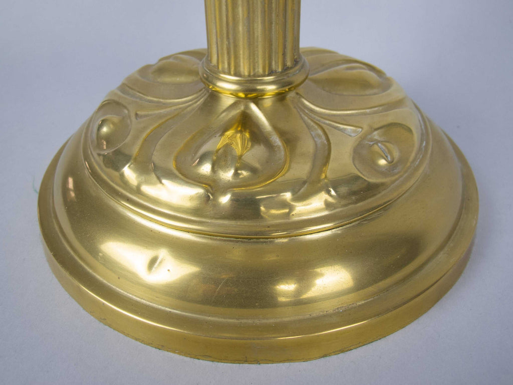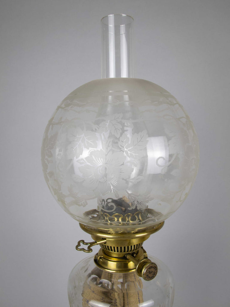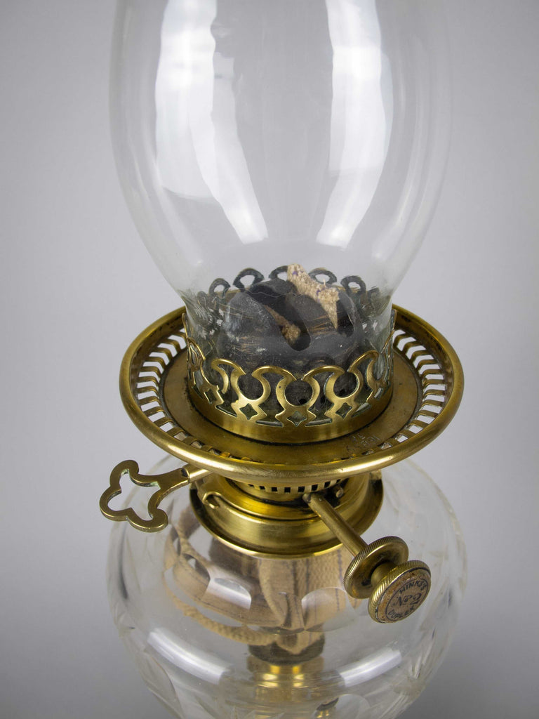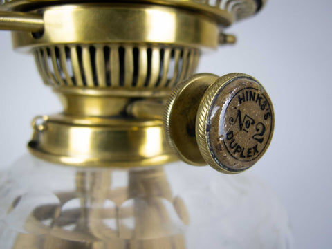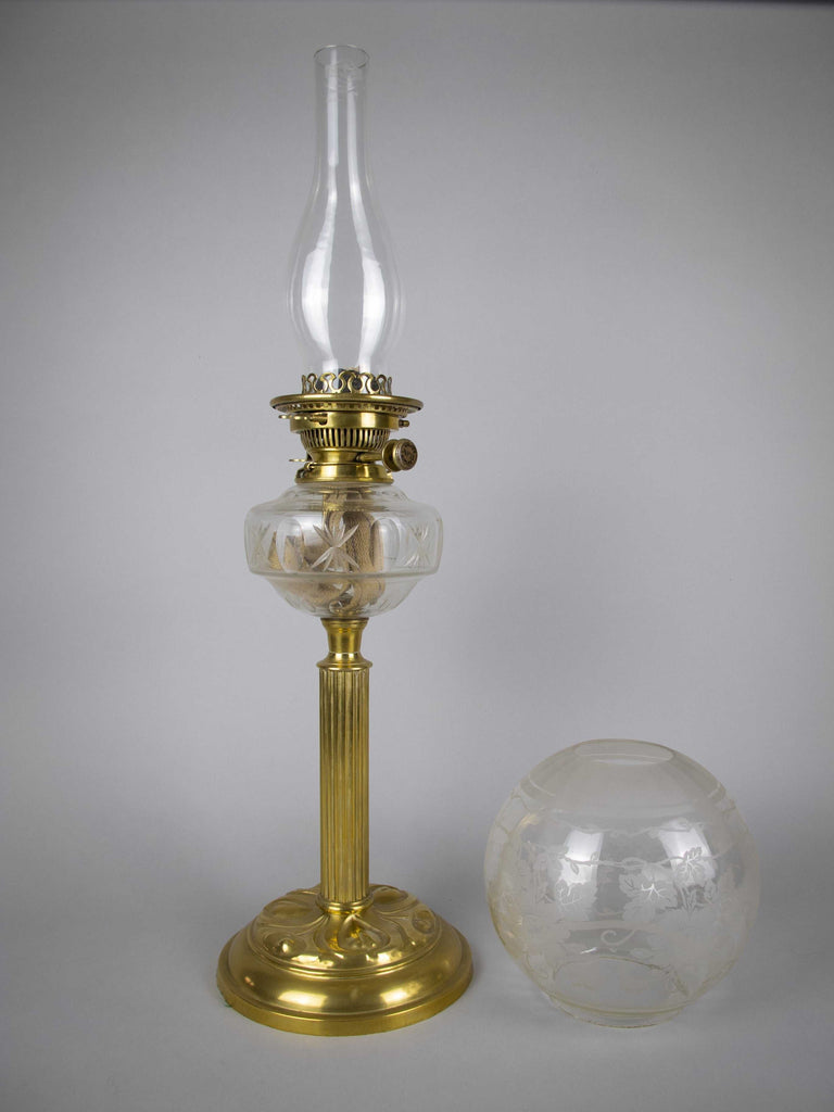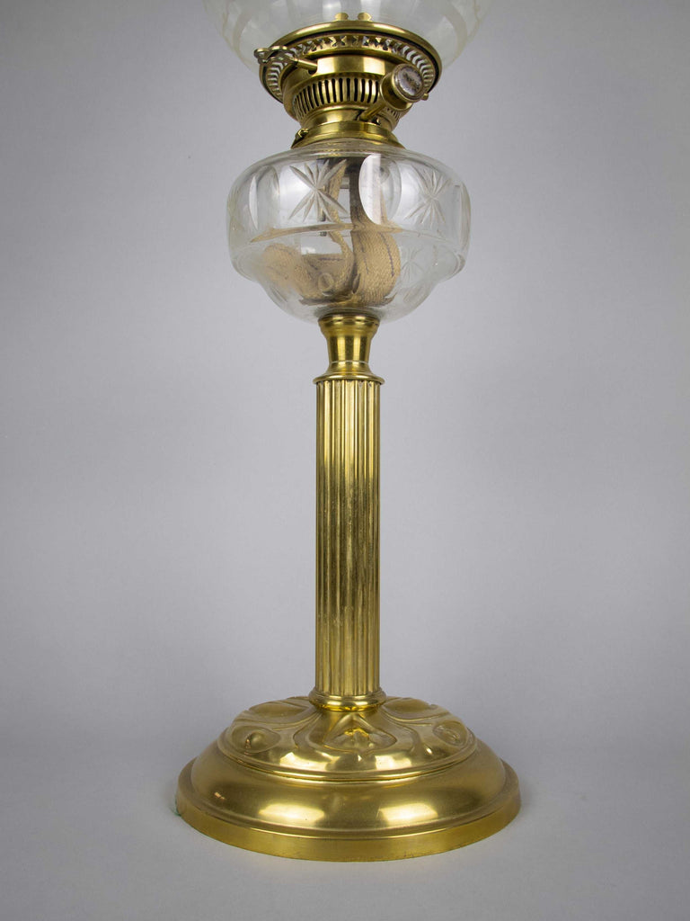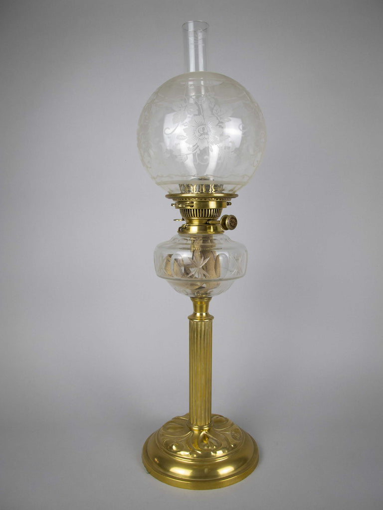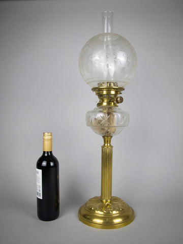 An impressive brass corinthian column oil lamp of large proportions boasting a Hinks No. 2 Duplex burner, cut glass reservoir, etched glass lamp shade, czechoslovakian fire proof chimney and green baize lined base.