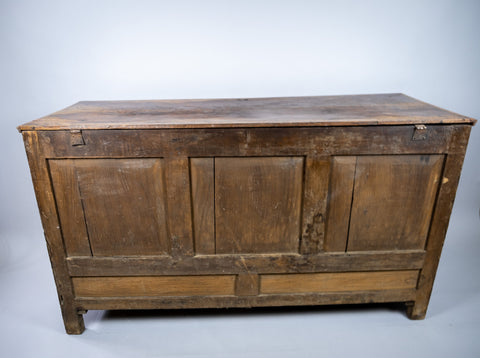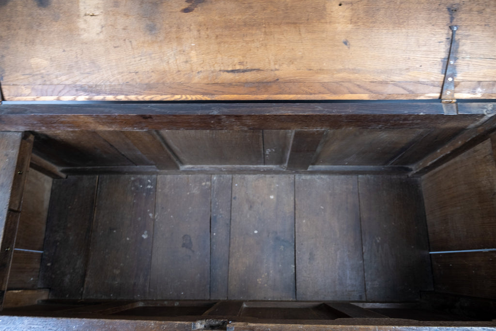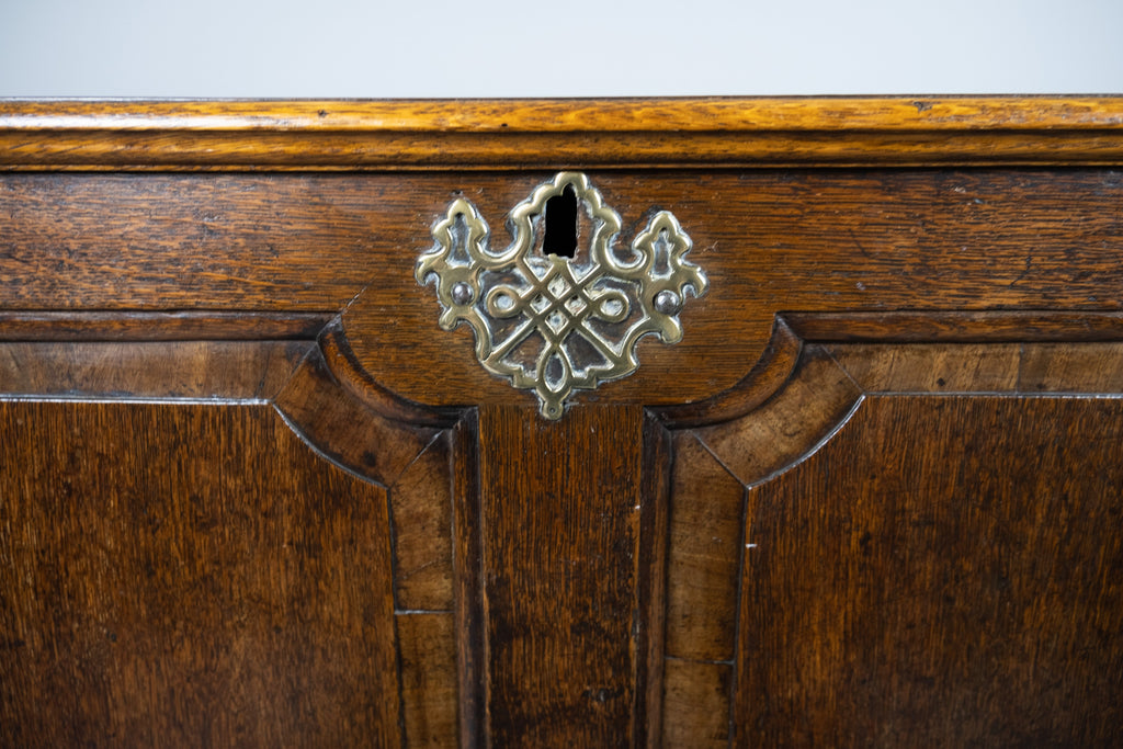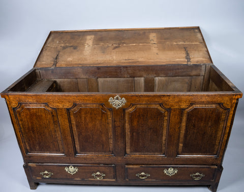 The chest has a later rectangular top with a cross banded edge above four fielded panels flanked by two columns, all above two short drawers raised on block feet. The lid opens to reveal a large oak lined compartment with an additional two drawers.