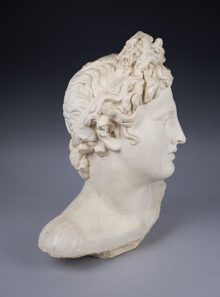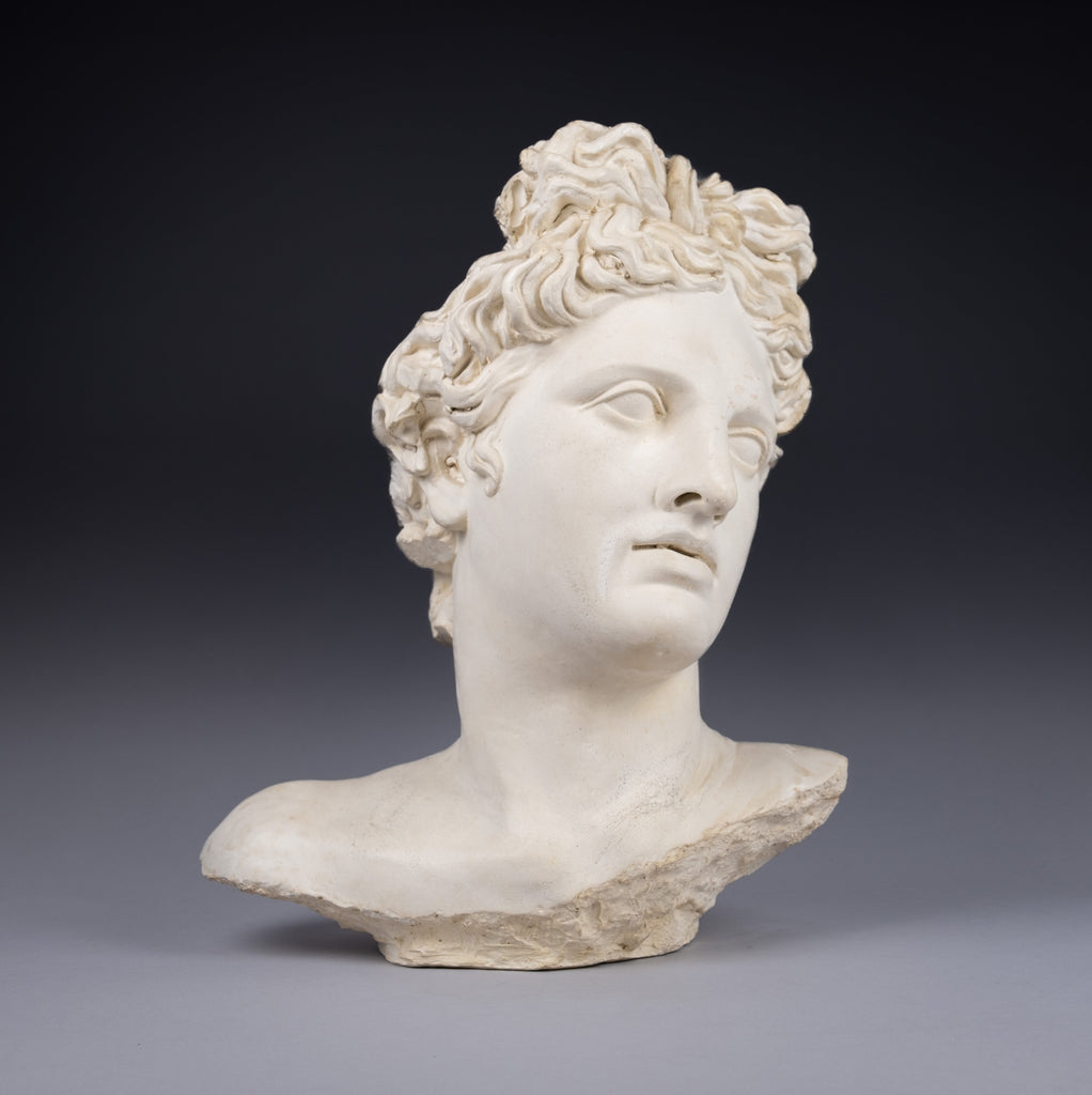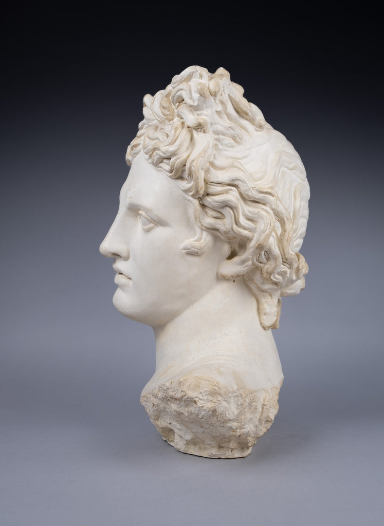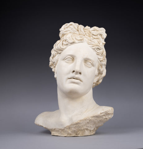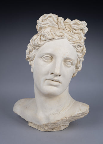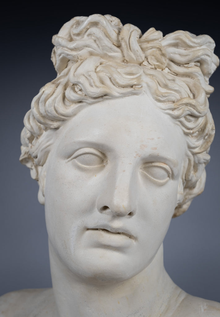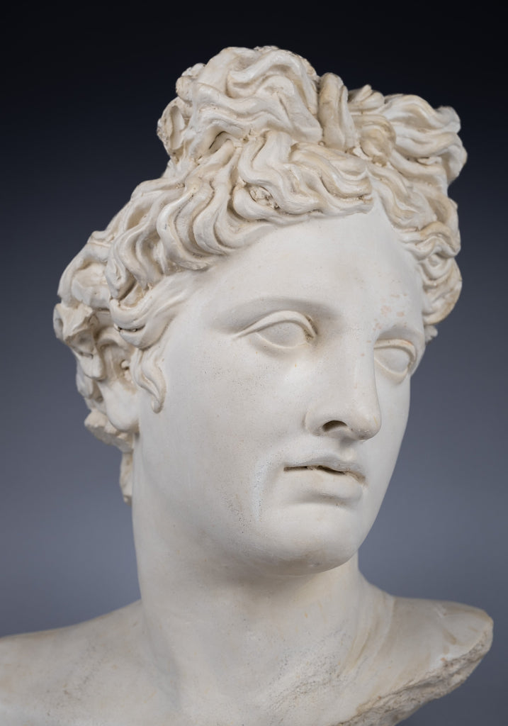 A stunning and substantial plaster bust of Apollo Belvedere, stamped 'RU-81' verso. The bust is 20th century and the '81' verso is presumed to refer to the year 1981.