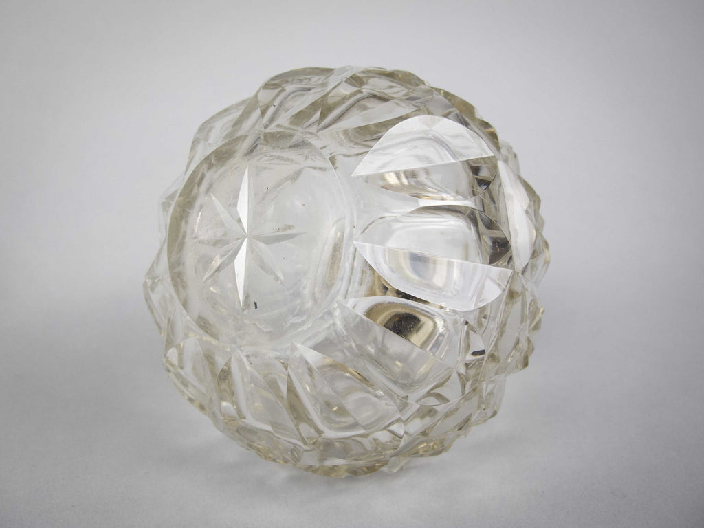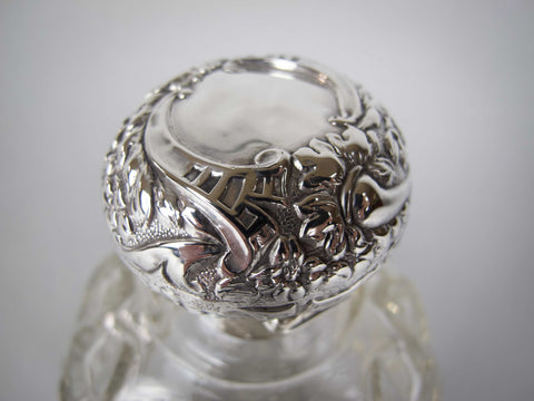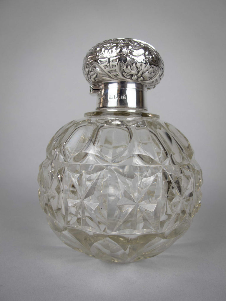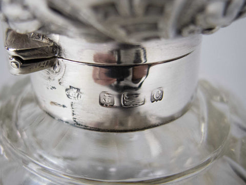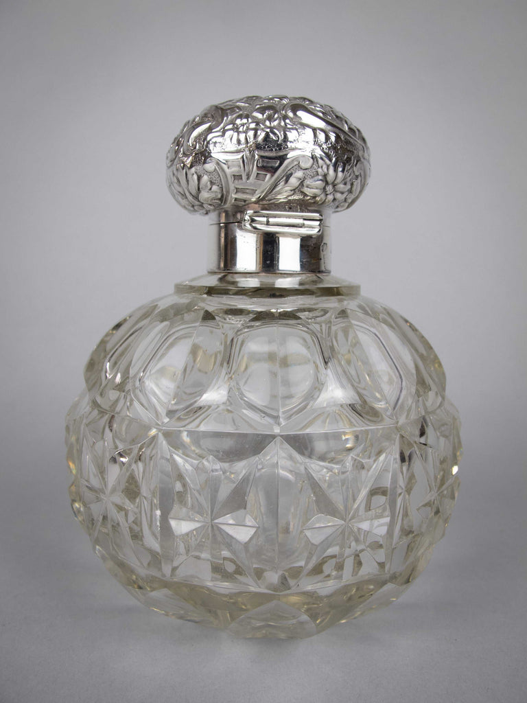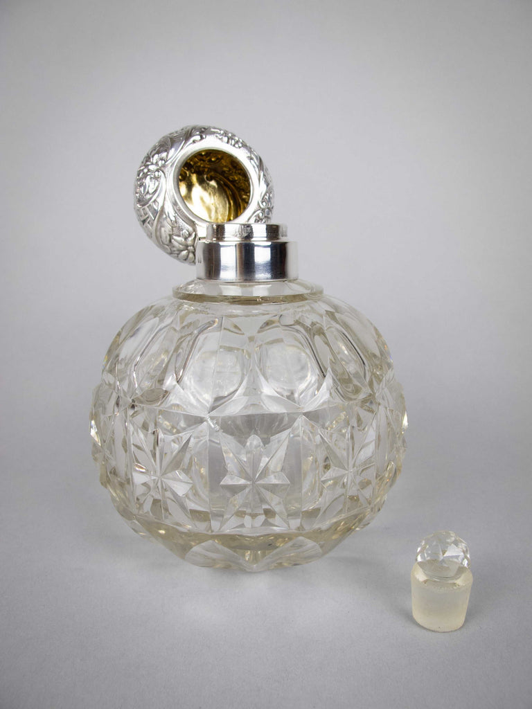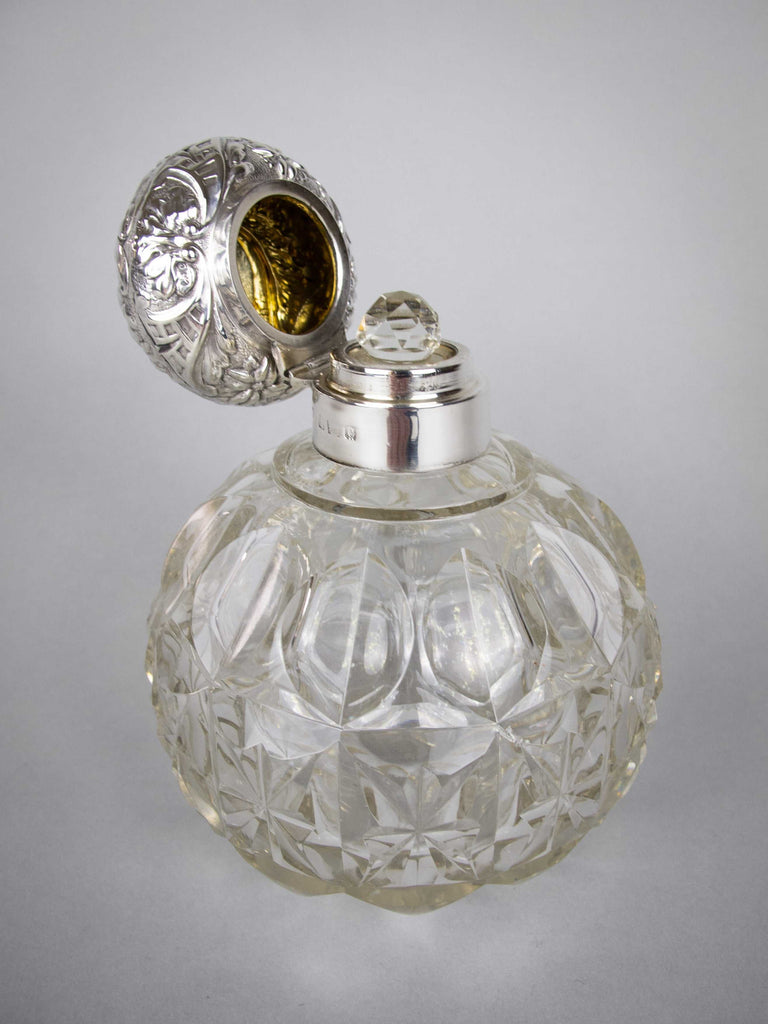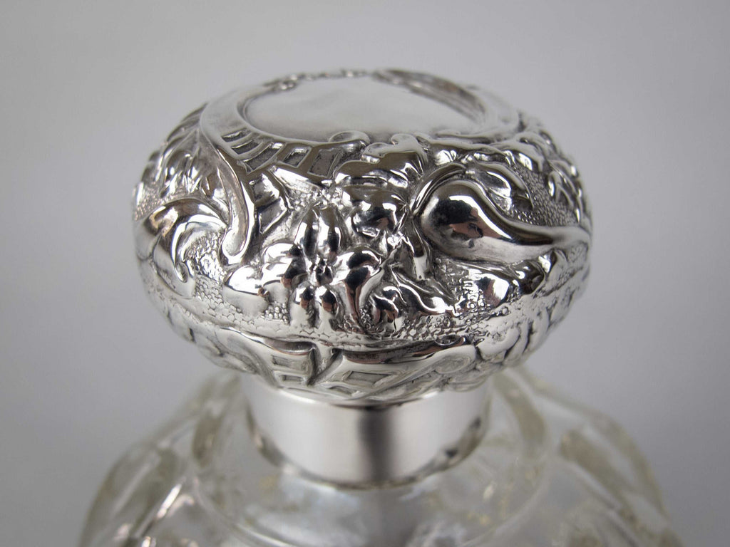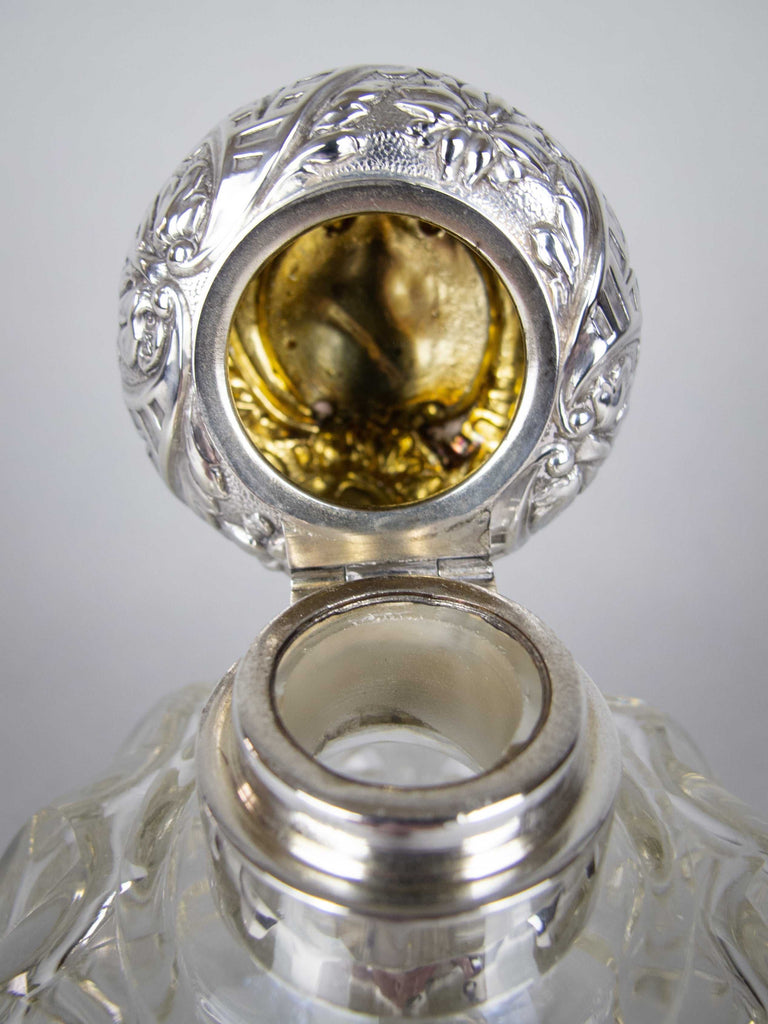 The scent bottle boasts a foliate design lid which opens to reveal a silver gilt lid interior, a sterling silver neck and glass stopper which sits firmly. The hallmarks to the neck are rubbed but remain legible. The hinge opens with ease and the lid clicks shut as it should. There is some warping/denting to the lid silver but otherwise the bottle remains in a very good condition.