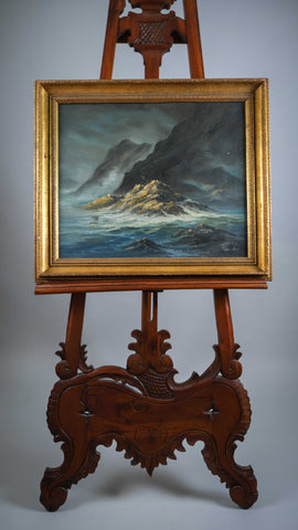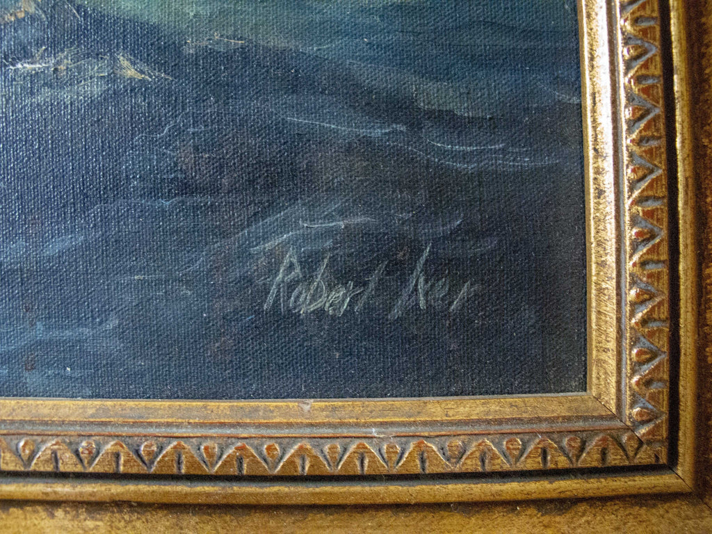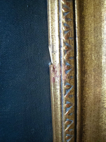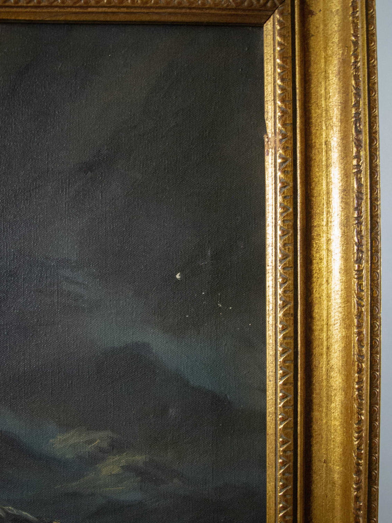 The painting does show some paint losses in places, particularly to the far right edge (please see photographs). There is also some minor damage to the frame to the inside right edge. The painting nonetheless remains striking.
