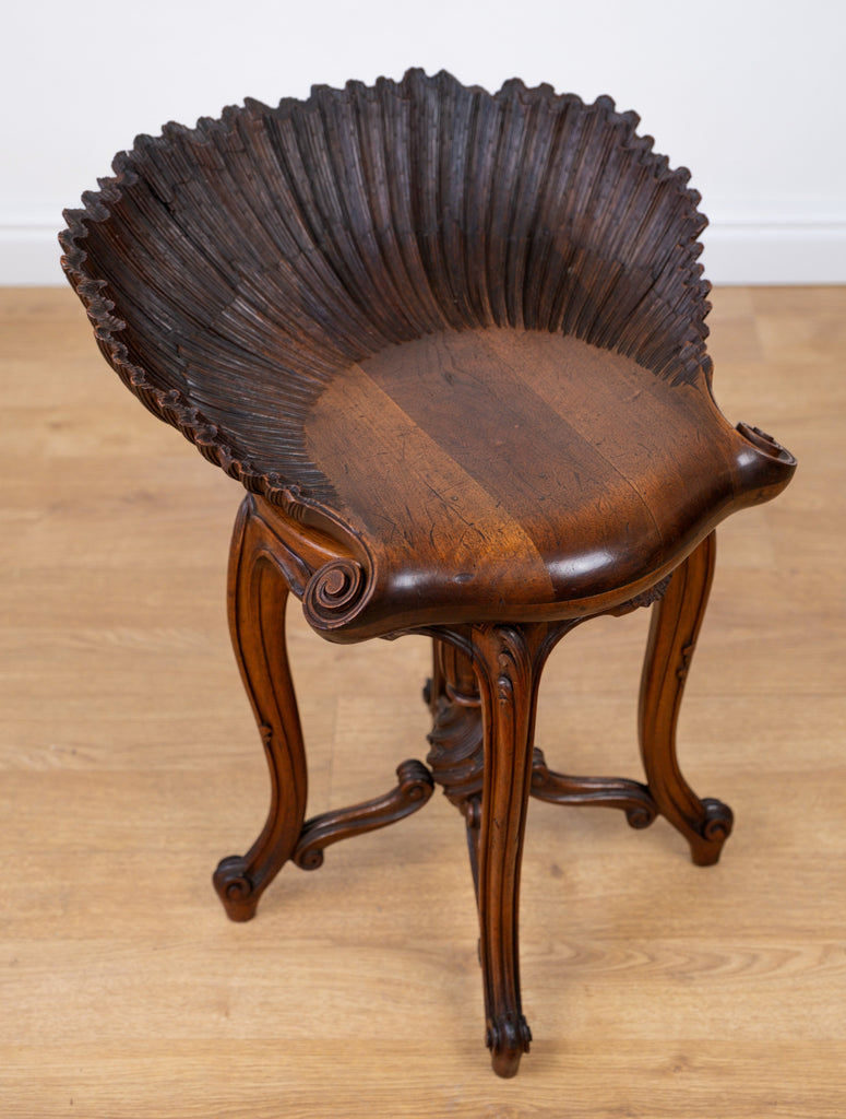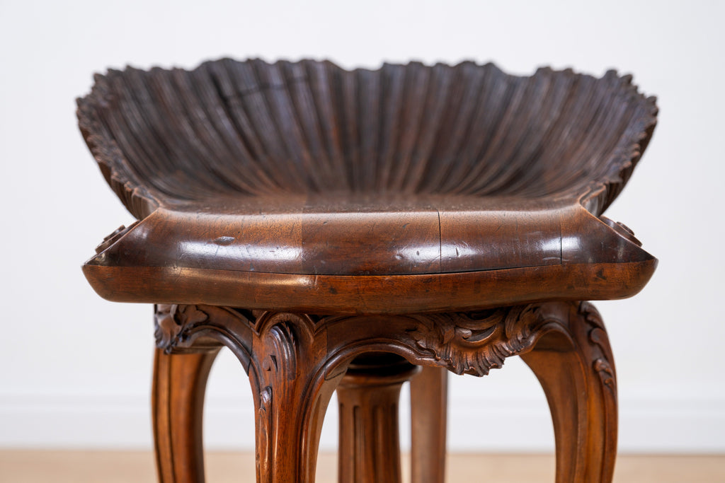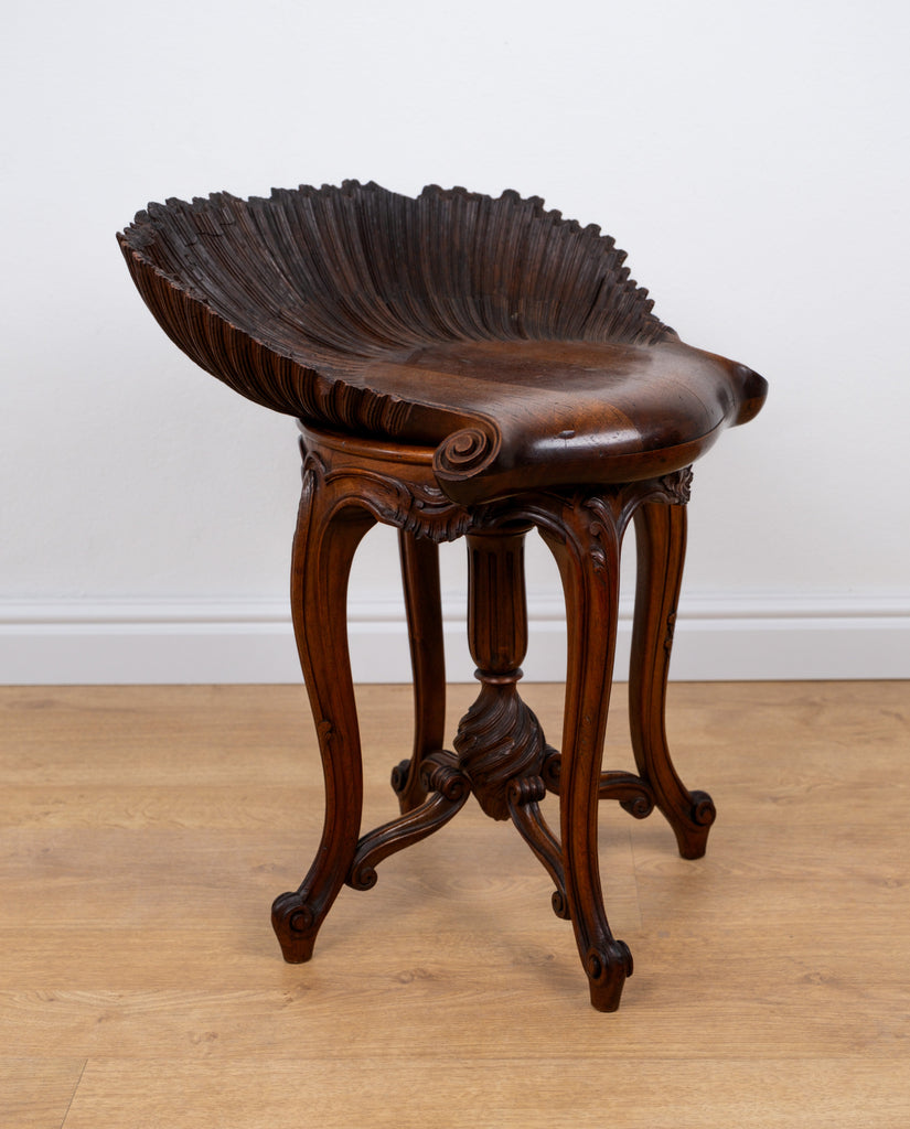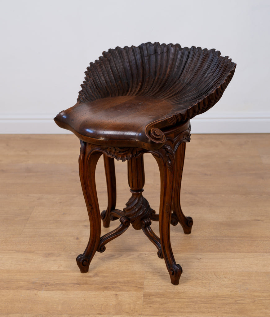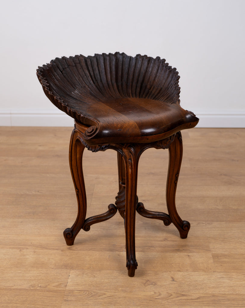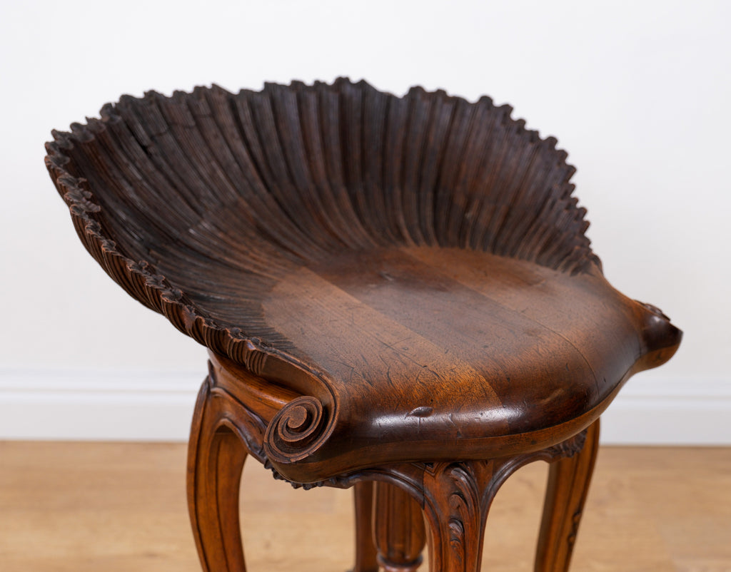 The stool seat is in the form of a scallop shell which sits atop four serpentine carved legs joined by scrolling X frame stretchers which unite at a finely carved foliate centrepiece.