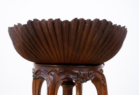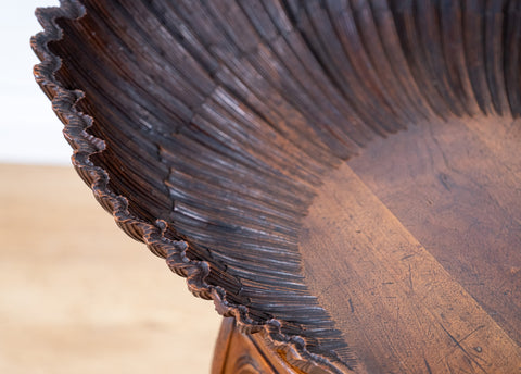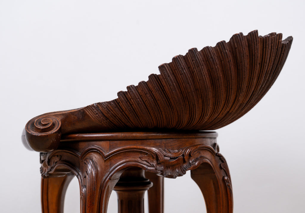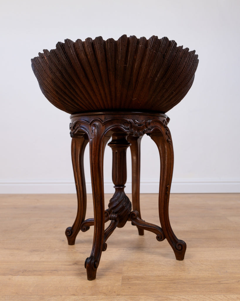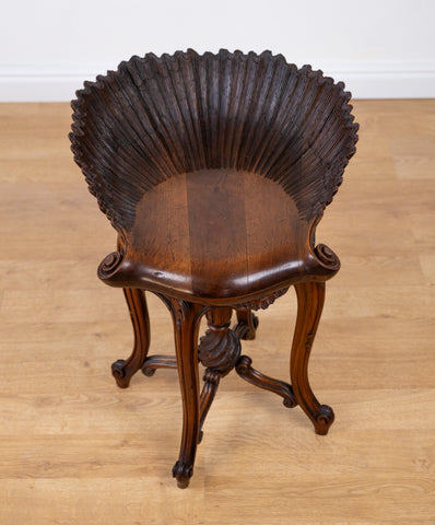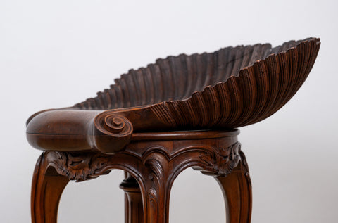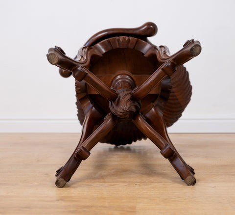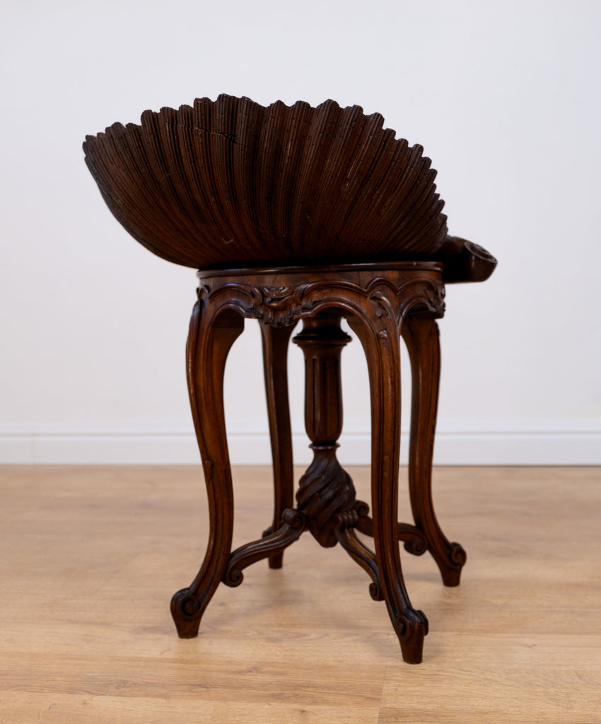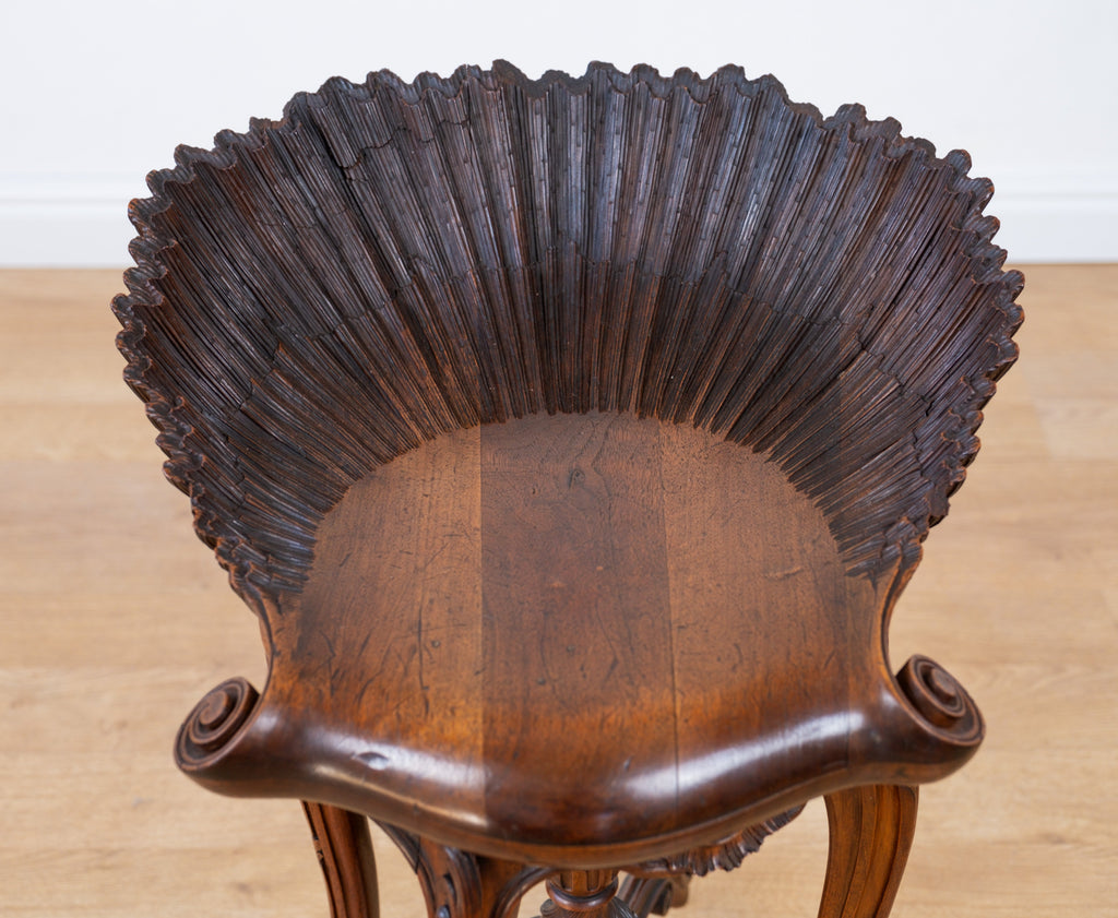 The stool seat is in the form of a scallop shell which sits atop four serpentine carved legs joined by scrolling X frame stretchers which unite at a finely carved foliate centrepiece.