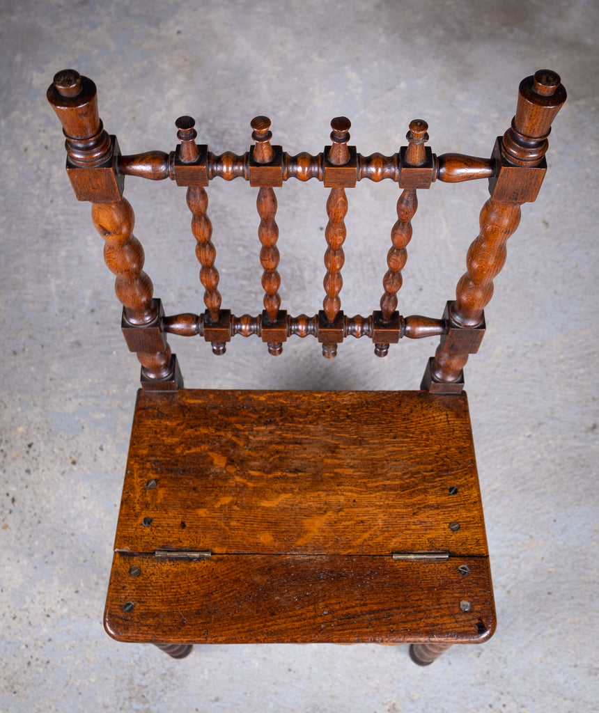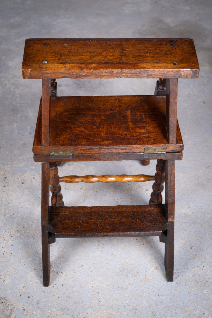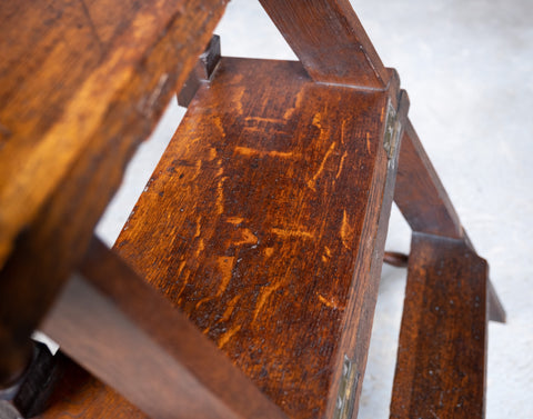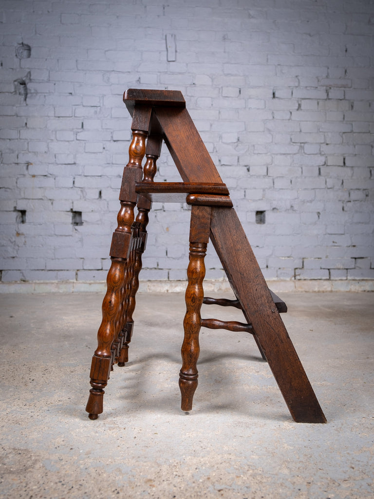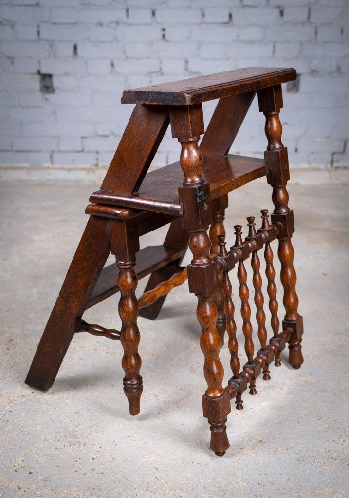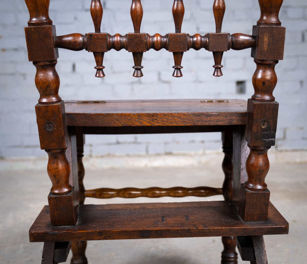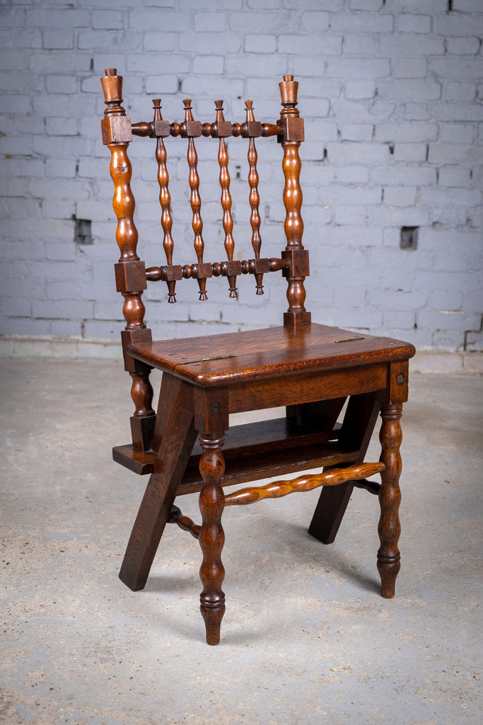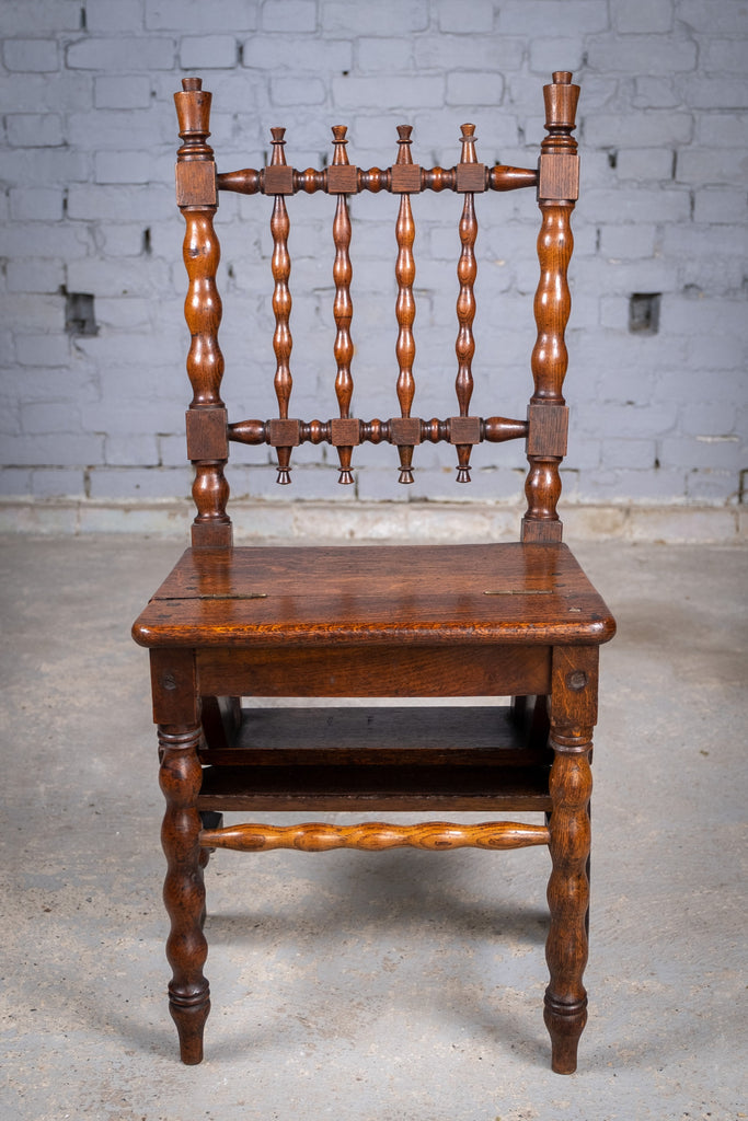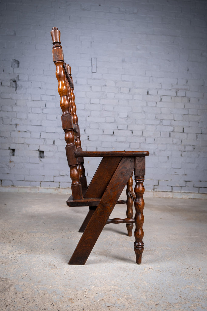 The oak has a beautiful colour throughout with a lovely well worn patina. The front stretcher is an honest sympathetic replacement and is wearing in well with the rest of the piece. There is a small loss to the top right back spindle, otherwise the chair/steps remain in a very good condition throughout with only minor wear commensurate with age.