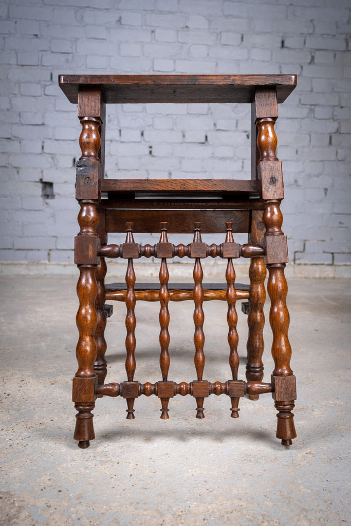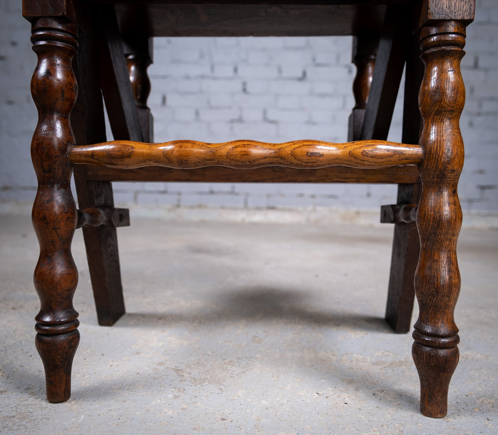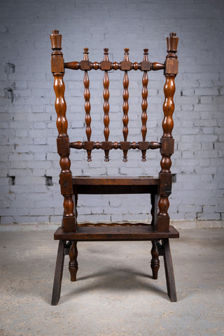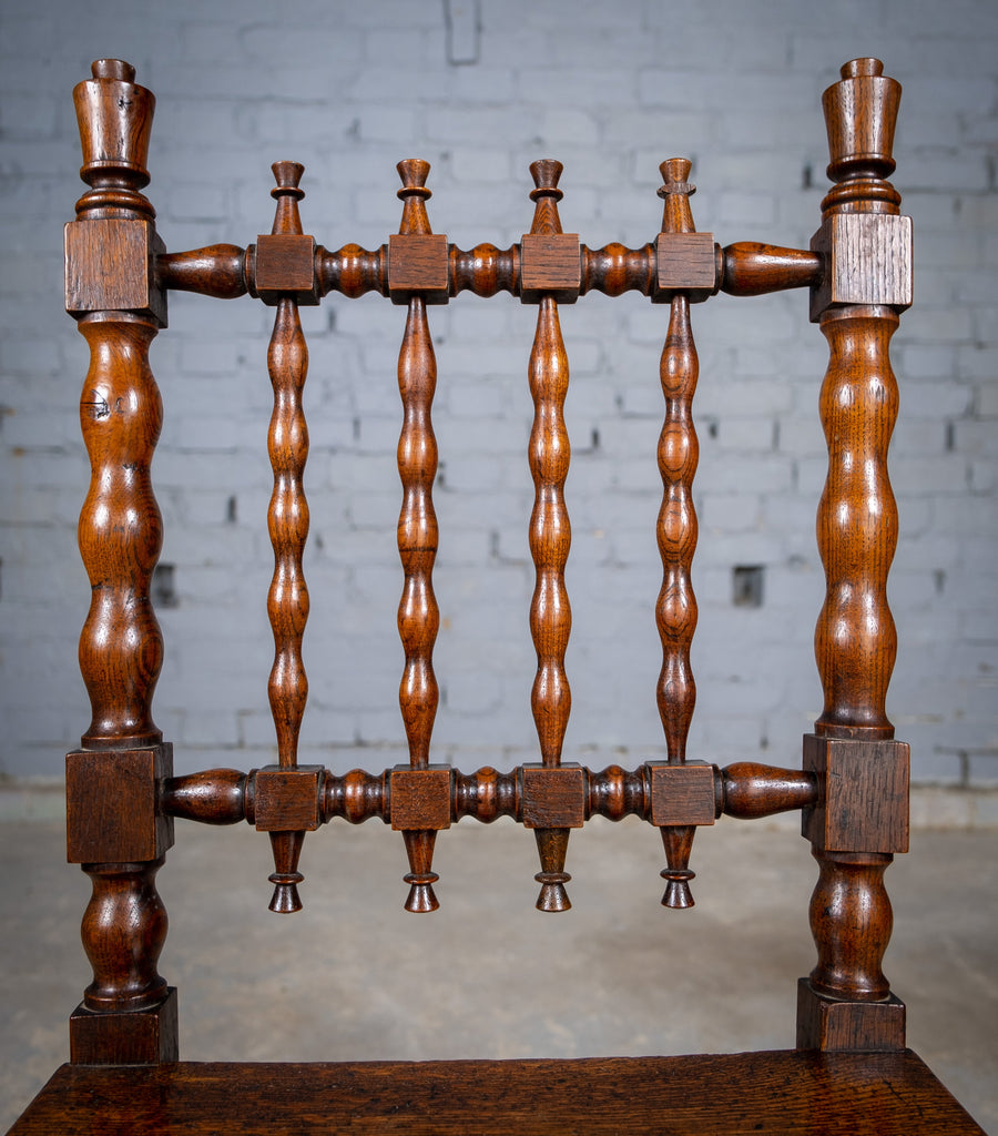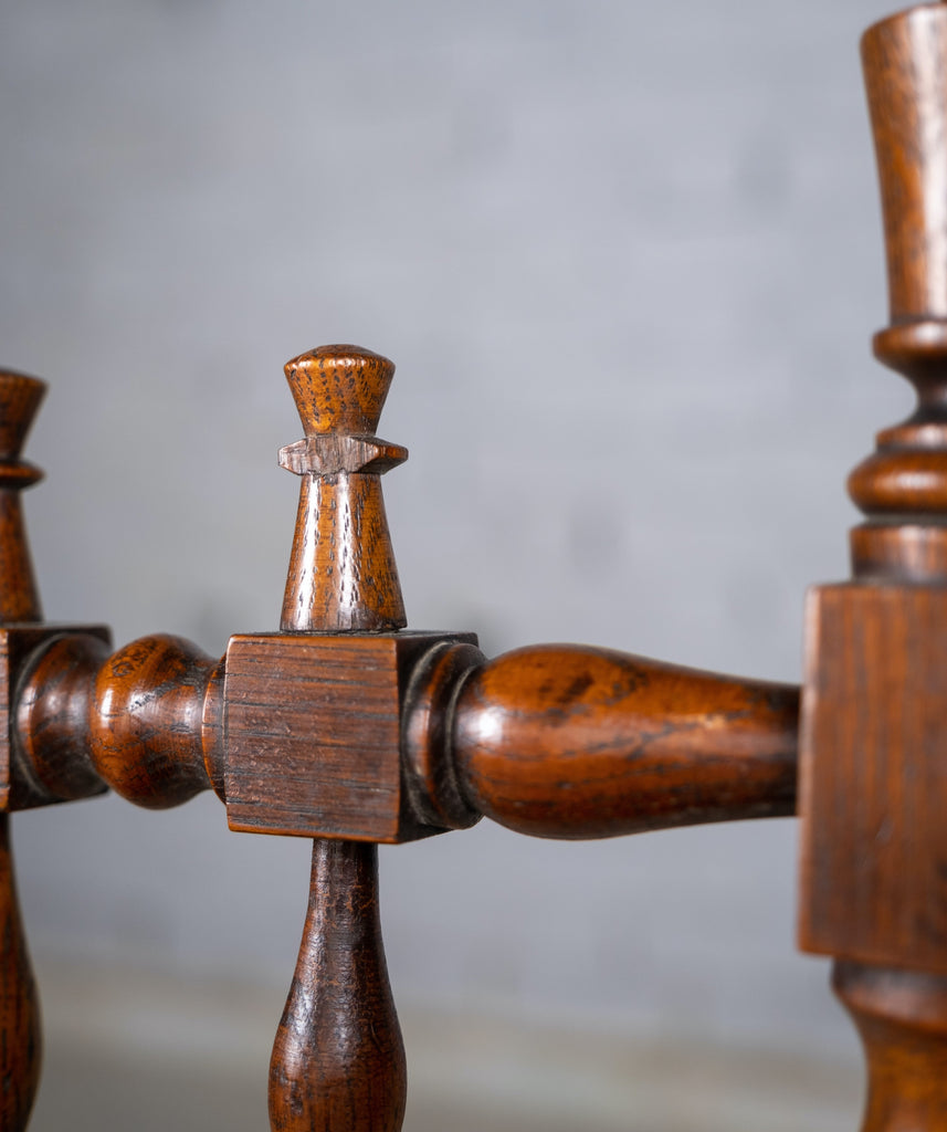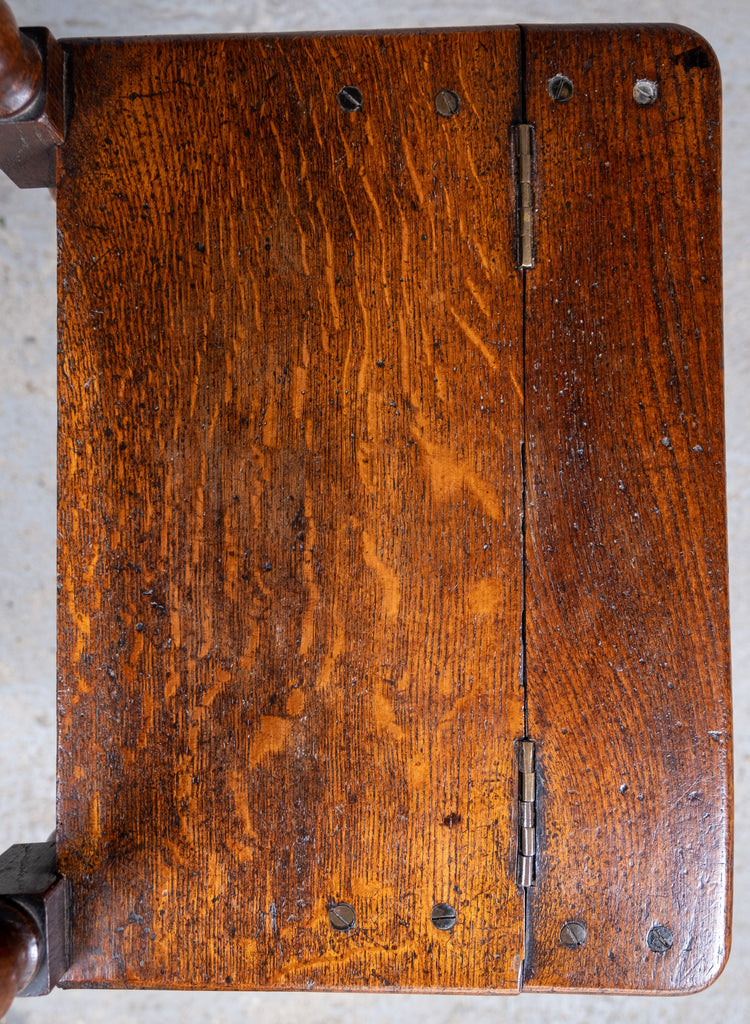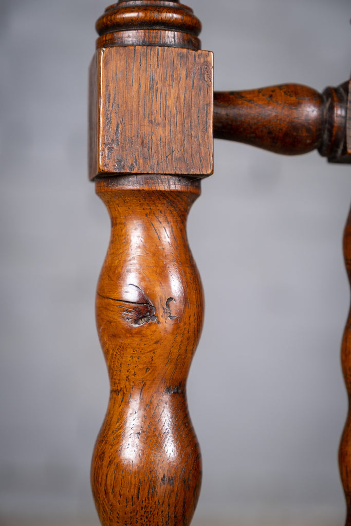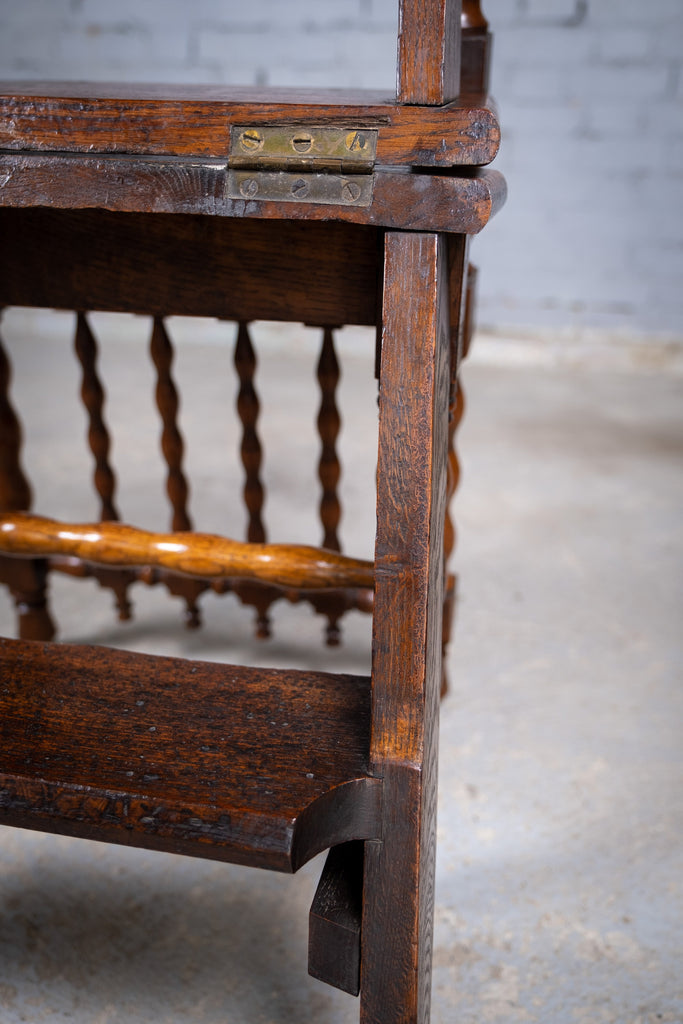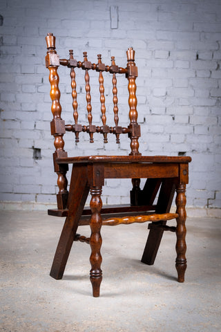 The oak has a beautiful colour throughout with a lovely well worn patina. The front stretcher is an honest sympathetic replacement and is wearing in well with the rest of the piece. There is a small loss to the top right back spindle, otherwise the chair/steps remain in a very good condition throughout with only minor wear commensurate with age.