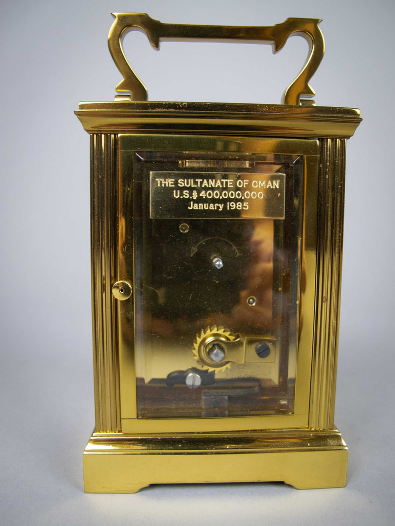 To the rear of the clock is a plaque which reads 'THE SULTANATE OF OMAN, U.S.$400,000,000, JANUARY 1985'. The military cooperation 'Access Agreement' between the United Kingdom, the United States and Oman was renewed in 1985. It is believed that this clock was commemorative of the event and presented to a figure or body involved.