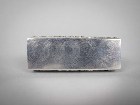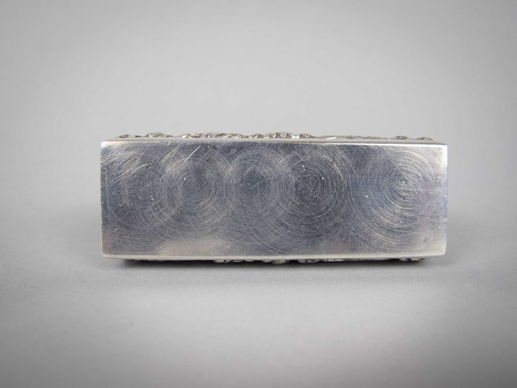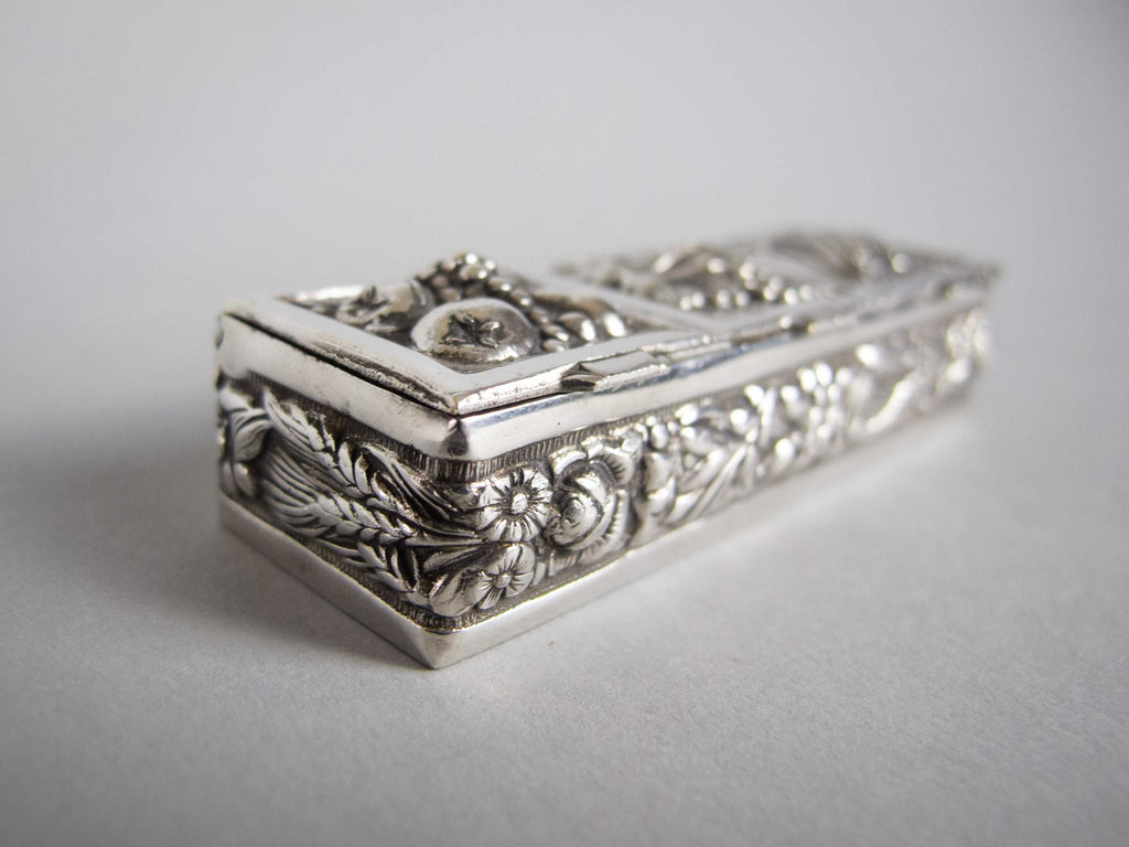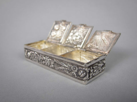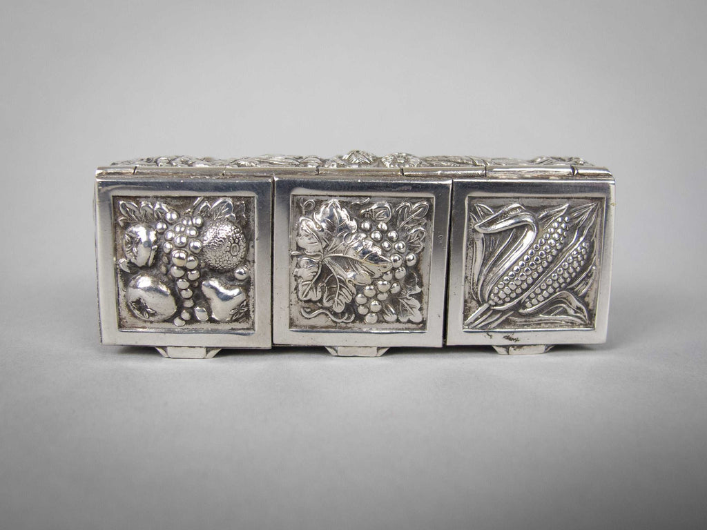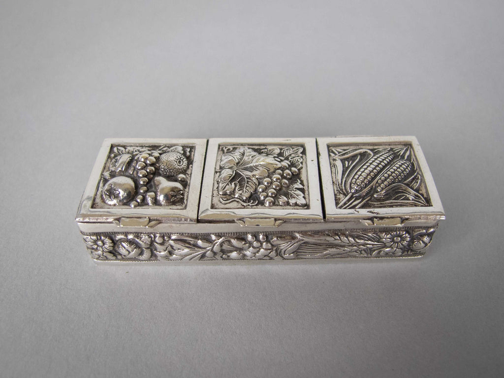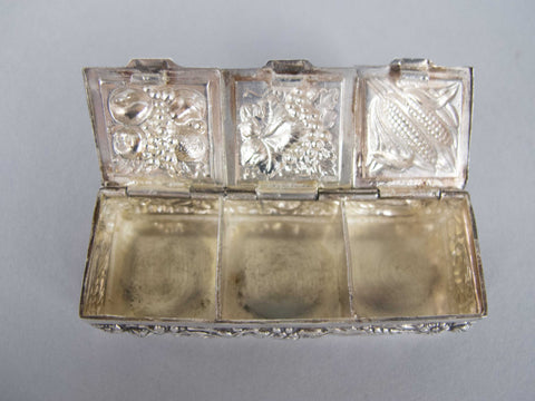 A lovely 20th century continental silver plated pill box with a wonderful harvest repousse, depicting corn, grapes, apples and pears to the lids with a foliate design to the border.