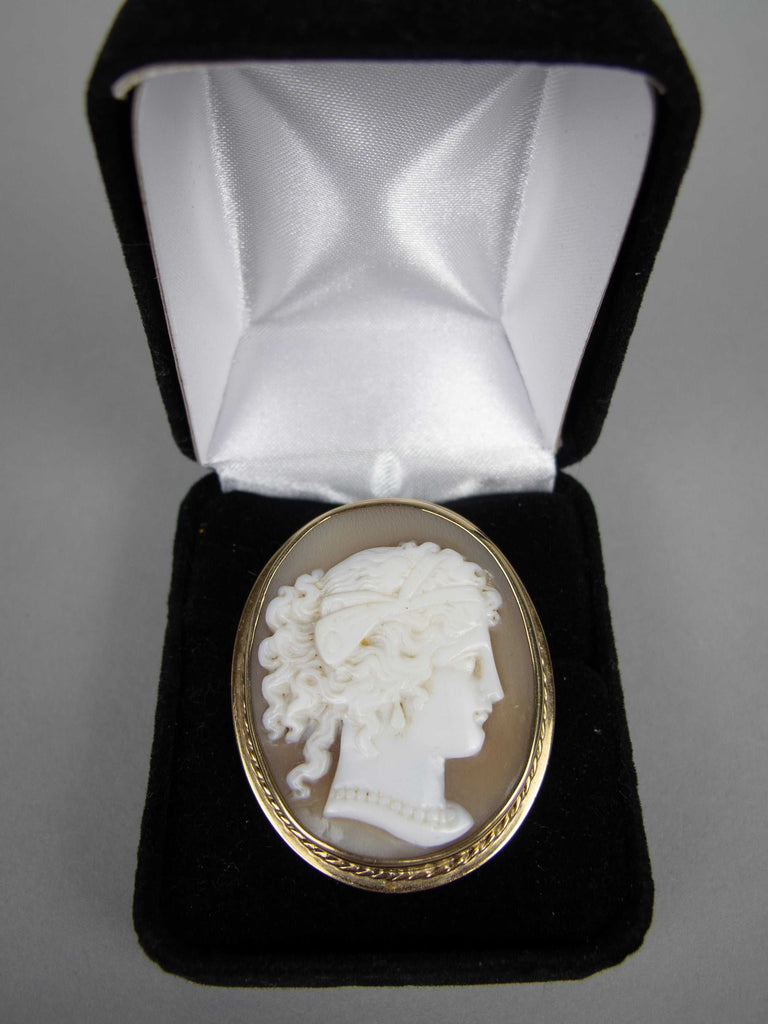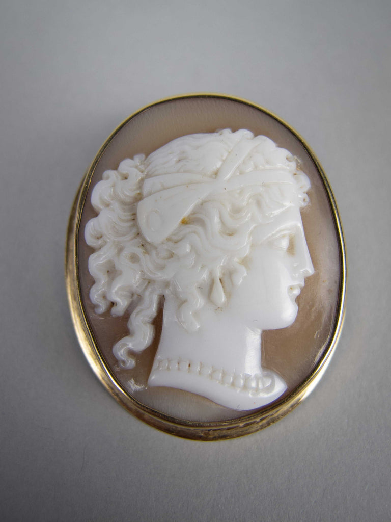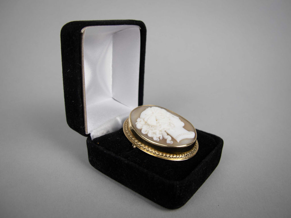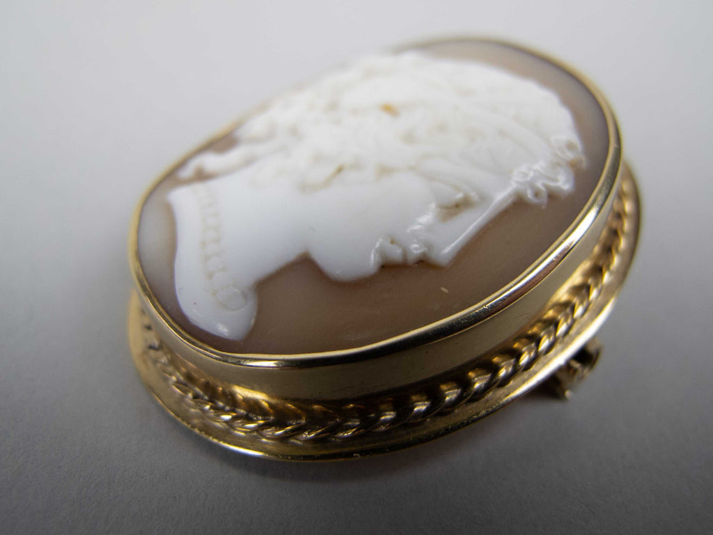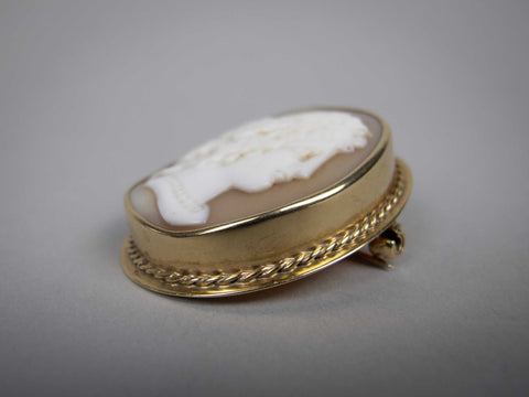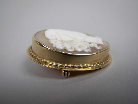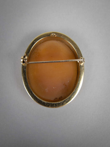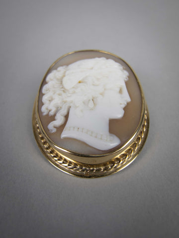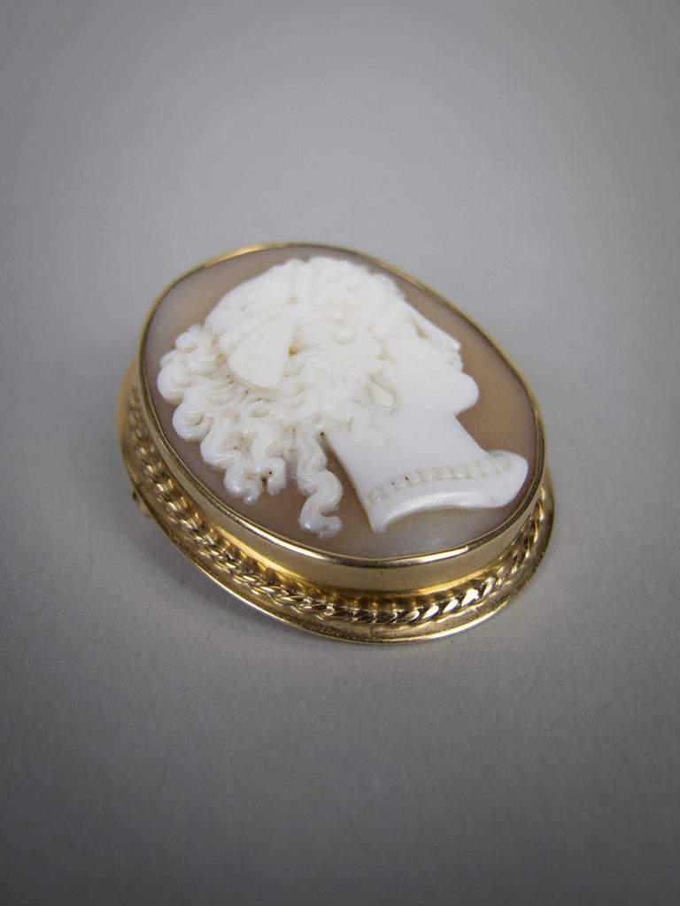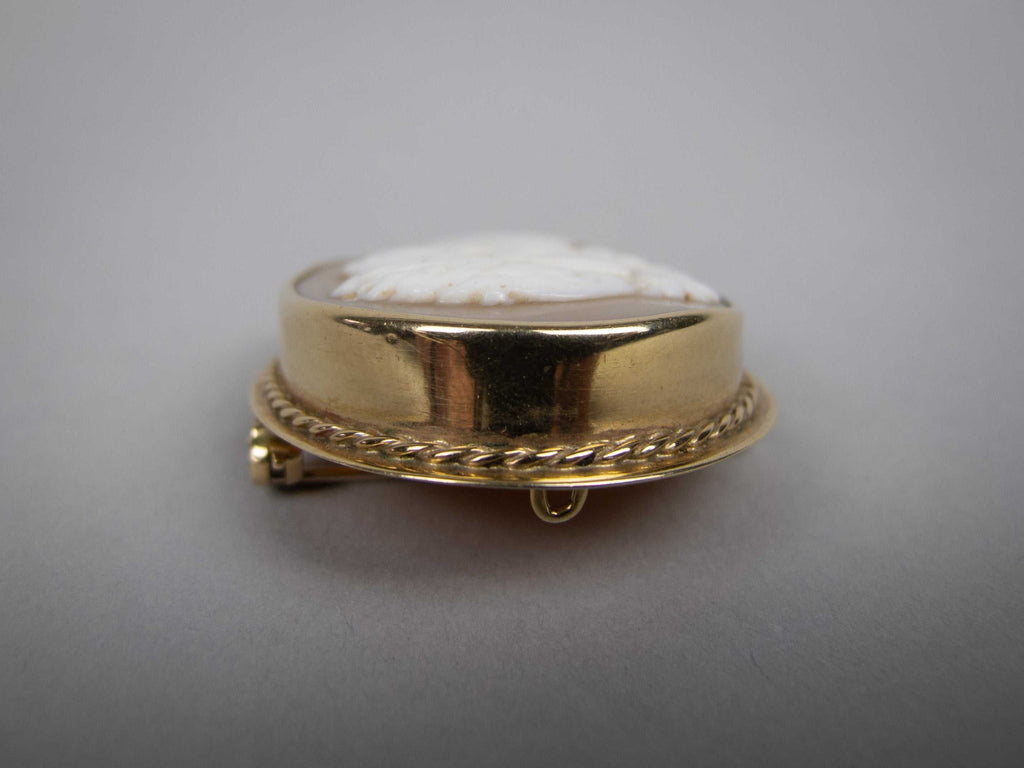 A stunning mid-century 9 carat gold bullmouth shell cameo brooch, with a loop at the top for use as a pendant.