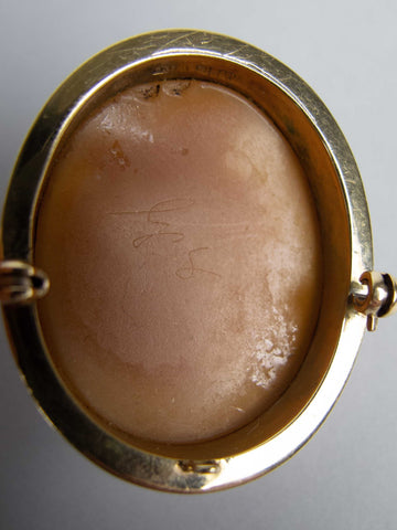 The brooch is artist signed to the rear of the cameo and stamped '9CT' and 'PHT' (likely a maker's mark) to the rear of the gold frame.