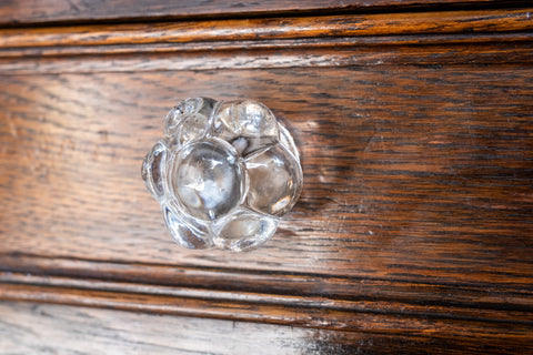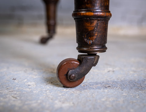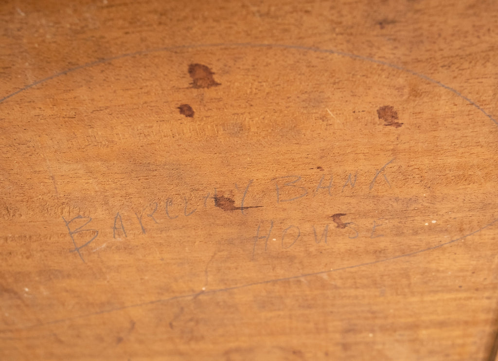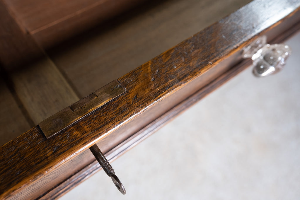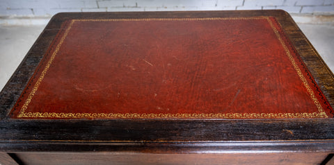 There are some light scuffs to the tooled leather and handles and there is evidence of a small historic repair to the top (please see photographs) but overall the desk remains in a very good condition and is extremely attractive. The desk has its key and a working lock. The ceramic castors all remain in a very good condition and function perfectly. 'Barclay Bank House' is written in pencil to the underside of the drawer.
