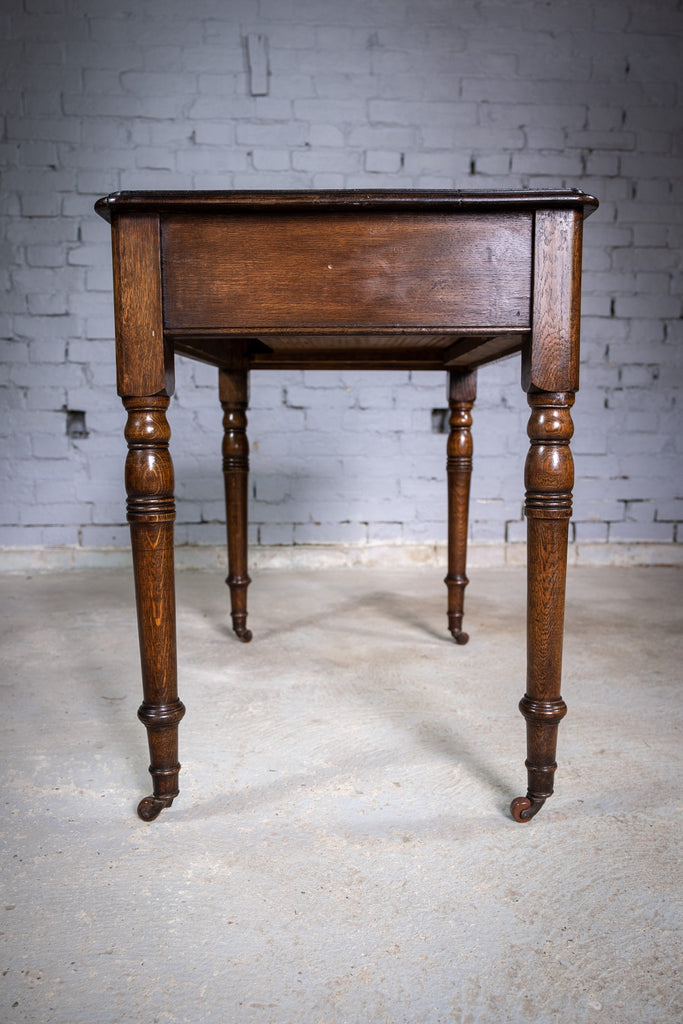 A charming mid-Victorian oak writing desk with a tooled maroon leather inset above a single frieze drawer with glass handles and key, sitting above four turned legs with ceramic castors.