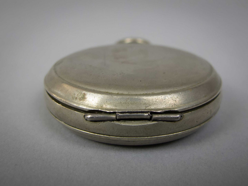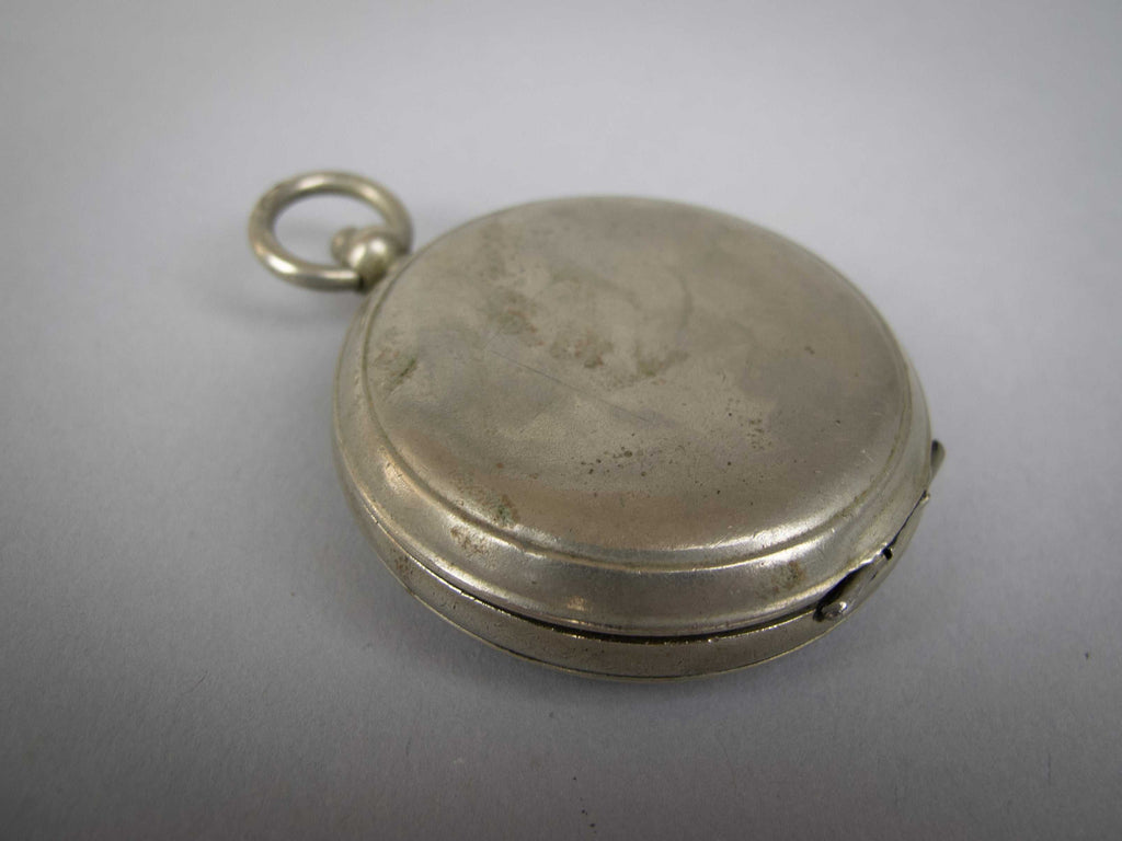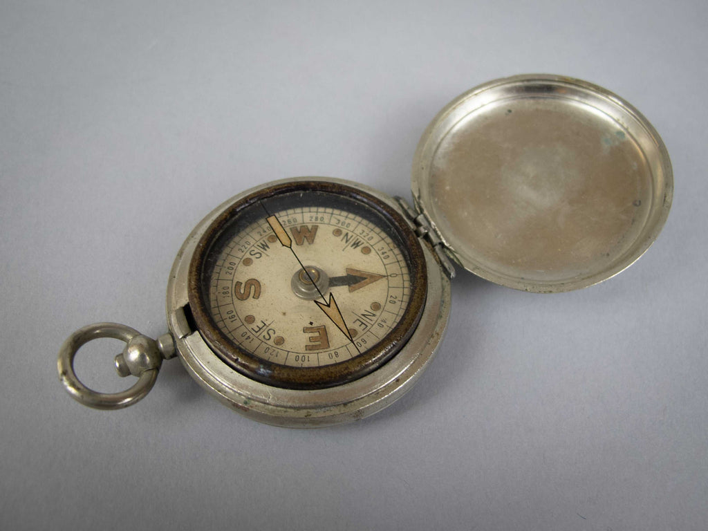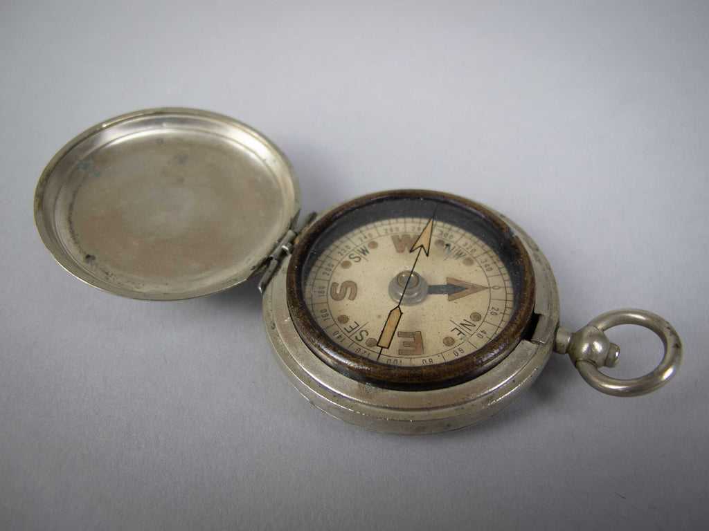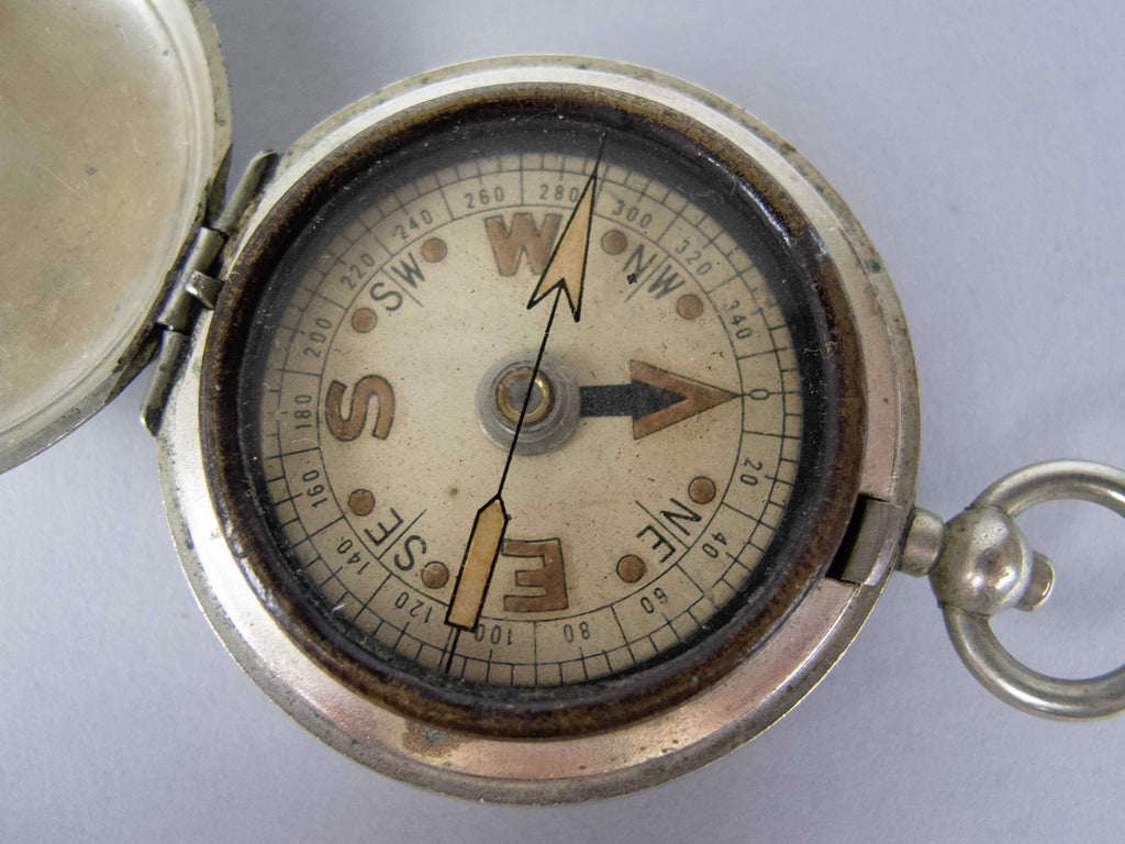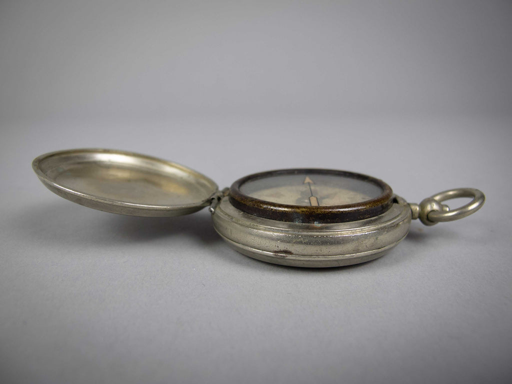 The compass sits in a nickel case which shows some wear. The sprung lid operates perfectly and springs open as it should when the button to the top of the compass is pressed. The hinge moves freely without issue.