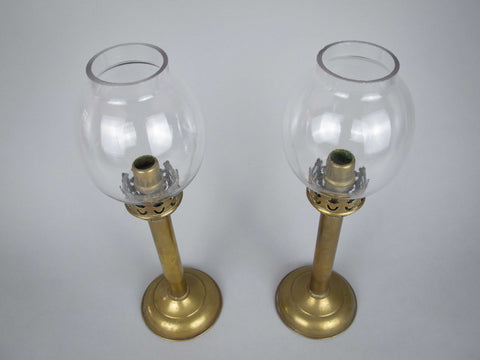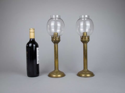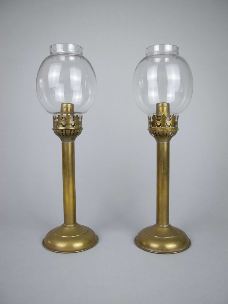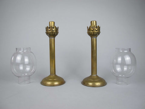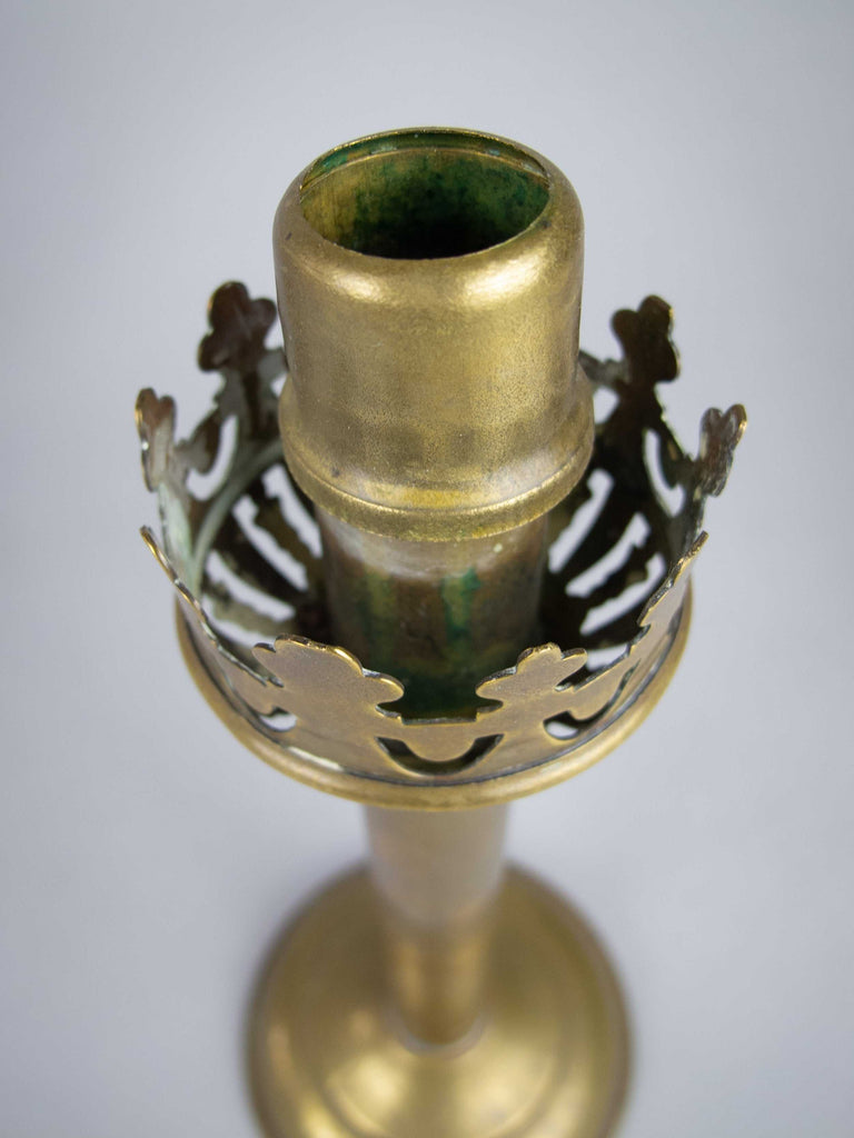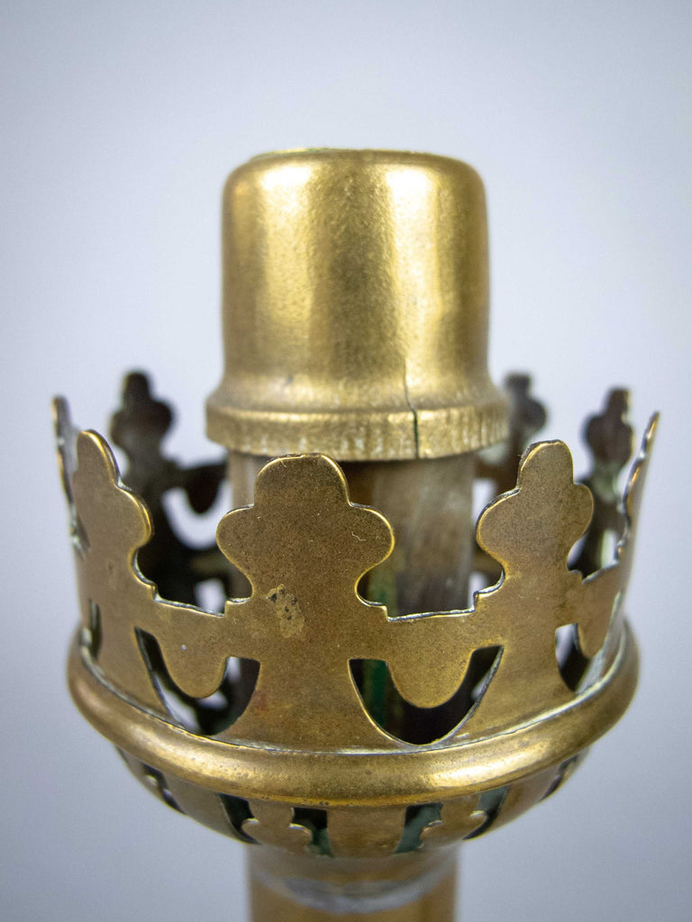 A pair of late 19th century french gothic / ecclesiastical candlesticks, with matching glass shades. 'Made In France' is stamped to the base of each candlestick.