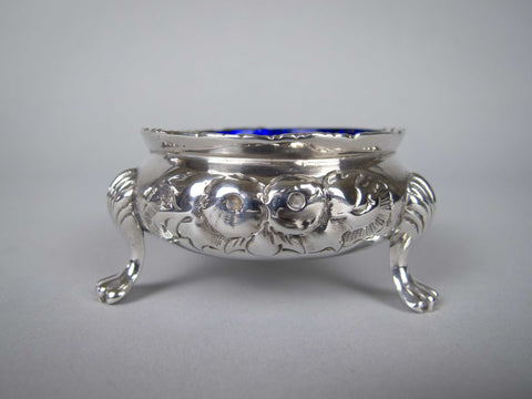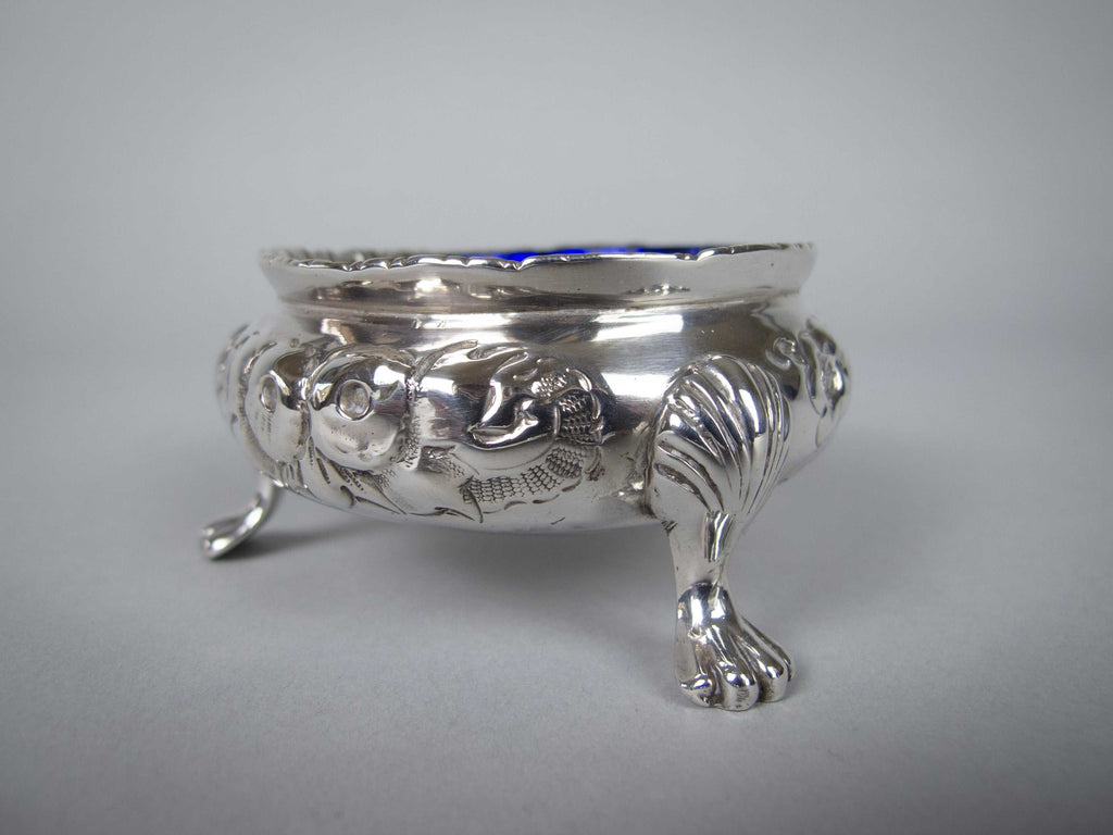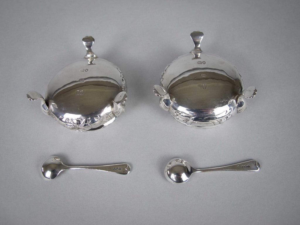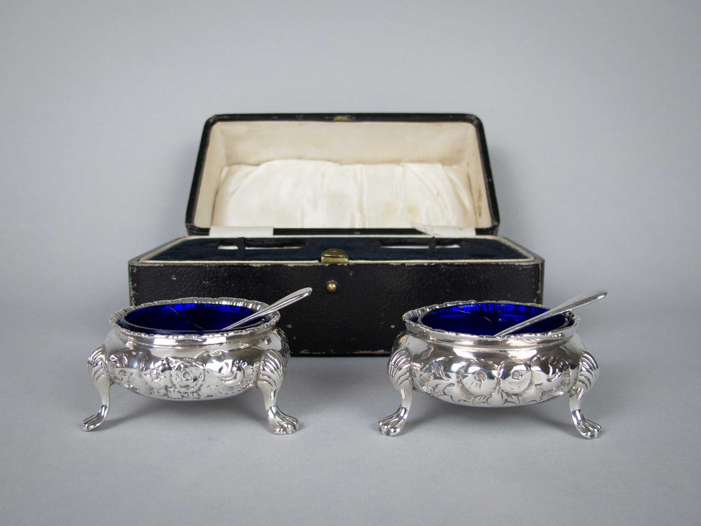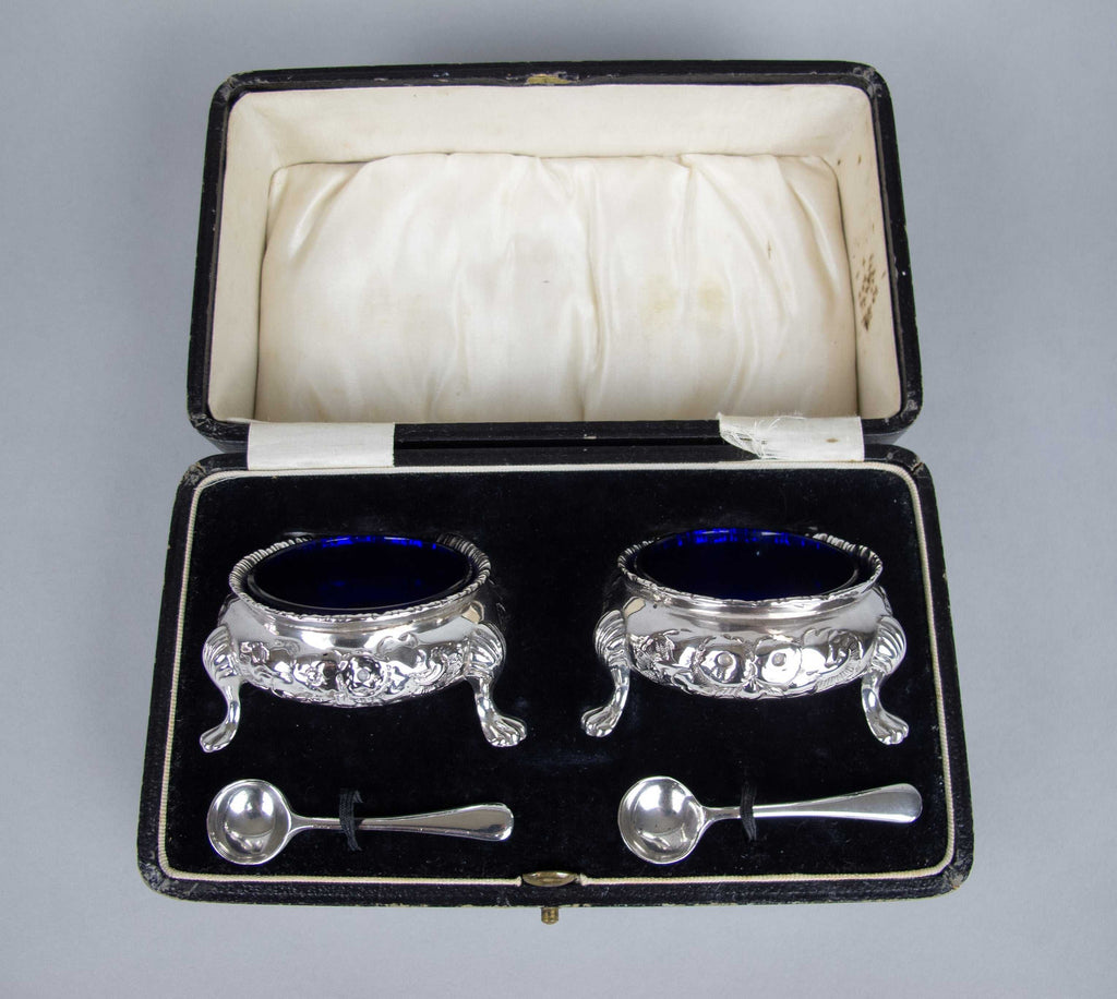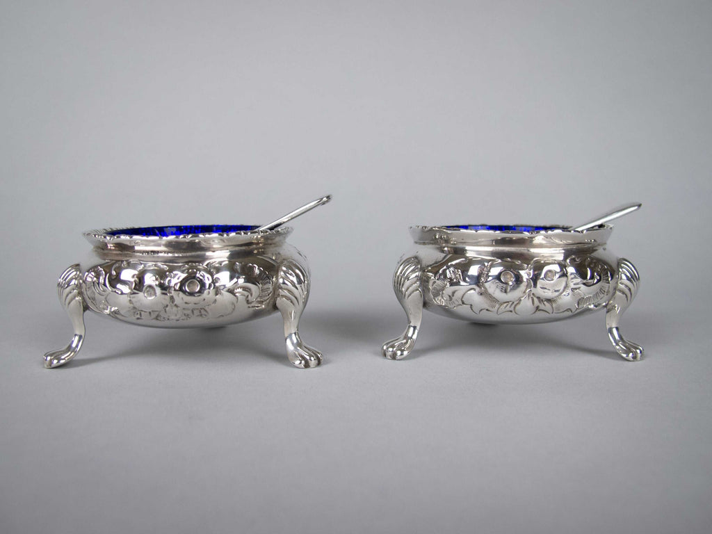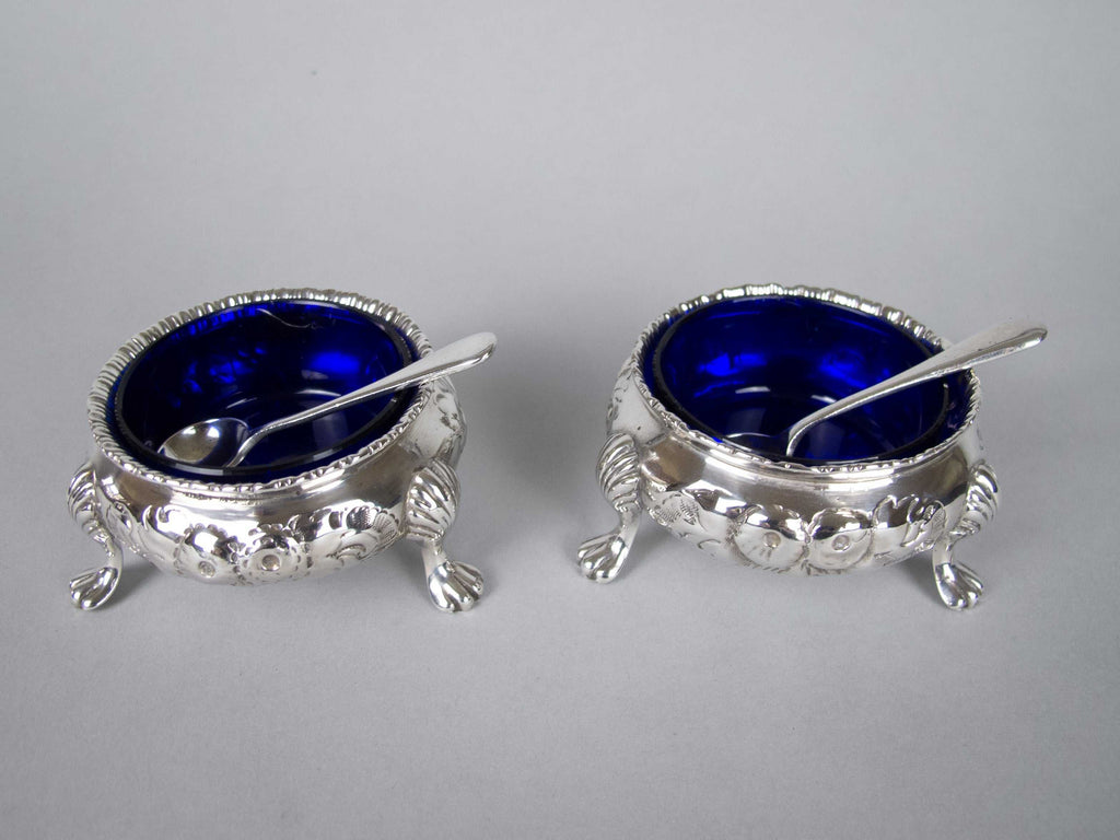 A pair of large sterling silver salt cellars with paw feet by Robert Harper, London, 1865. The salt cellars are housed in their original case. The spoons are by Adie Bros and hallmarked for Birmingham, 1929; they are substantial in themselves weighing 8 grams each.