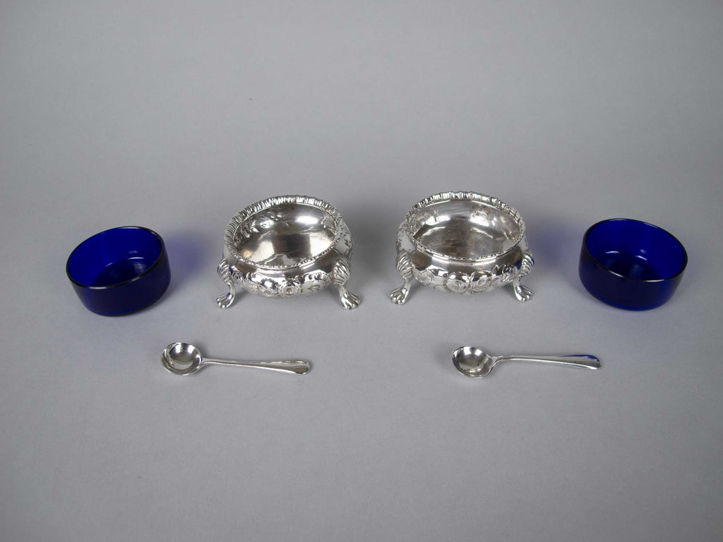 The salt cellars remain in an excellent condition with blue glass liners. The spoons also remain in an excellent condition.