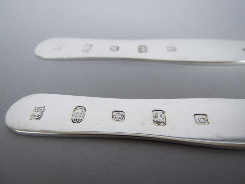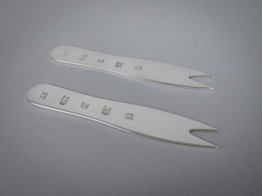 A wonderful, and quintessentially English, pair of sterling silver chip forks, both fully hallmarked for Camelot Silver Ltd, Sheffield, 2001.