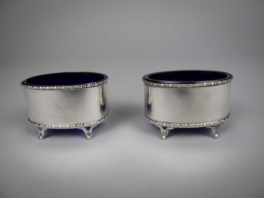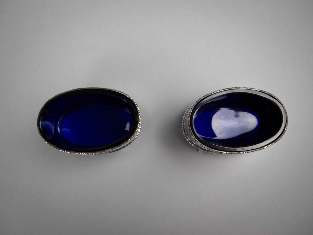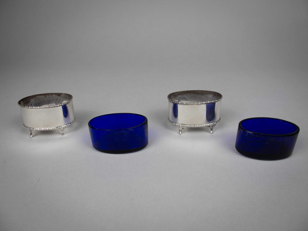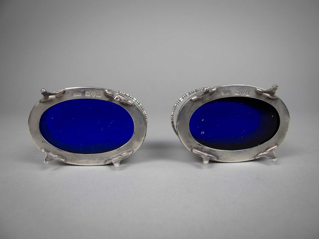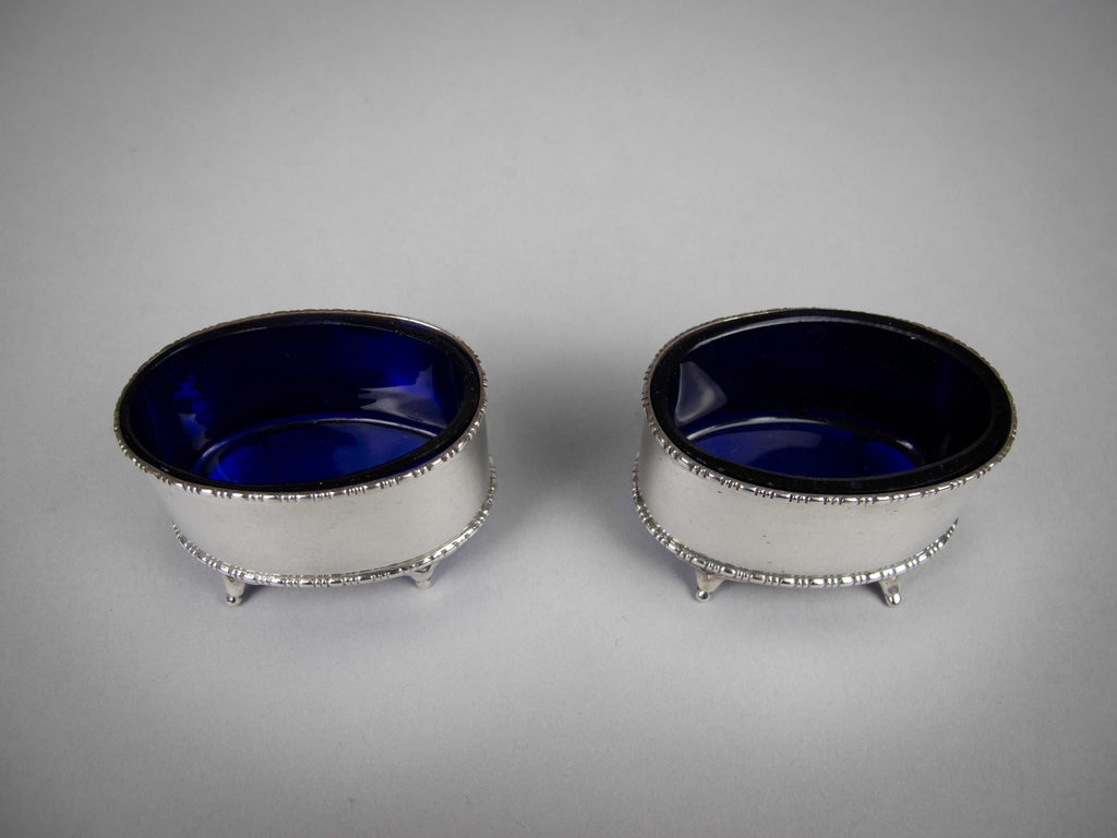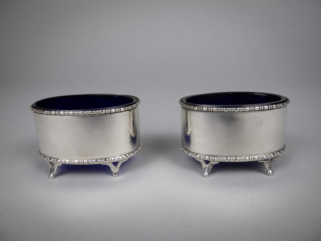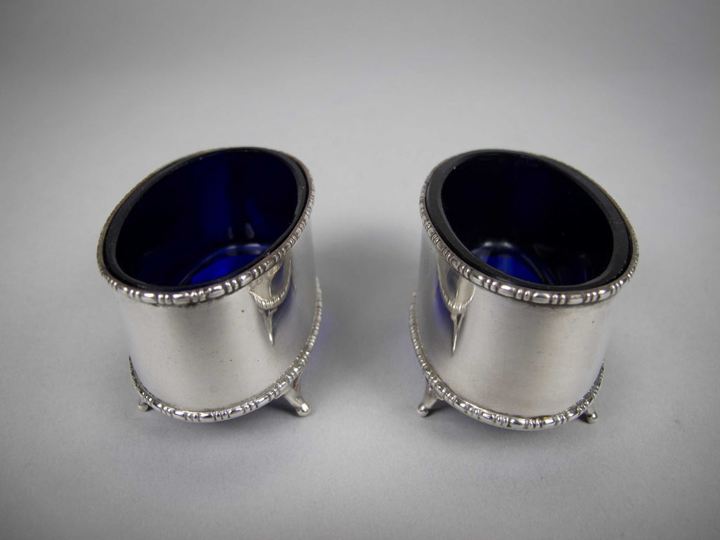 The salt cellars show some minor wear consistent with age, to include a very slightly turned in leg to one of the cellars (please see photographs). Note both cellars still stand firm.