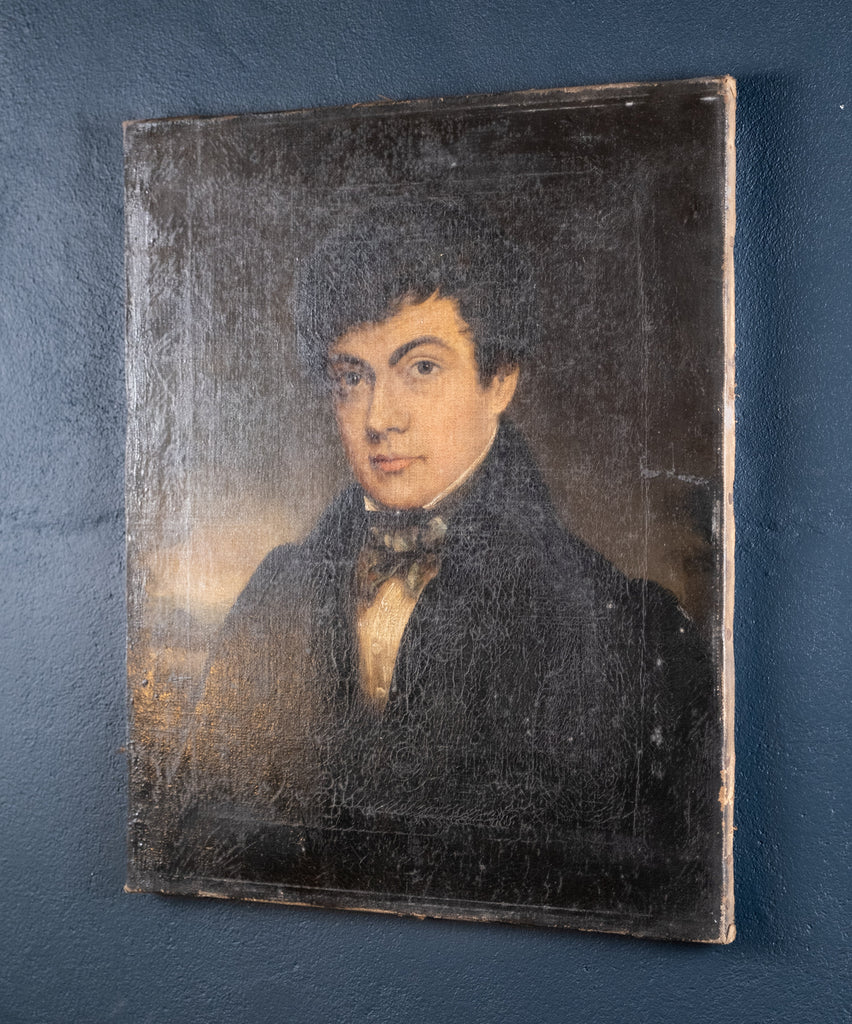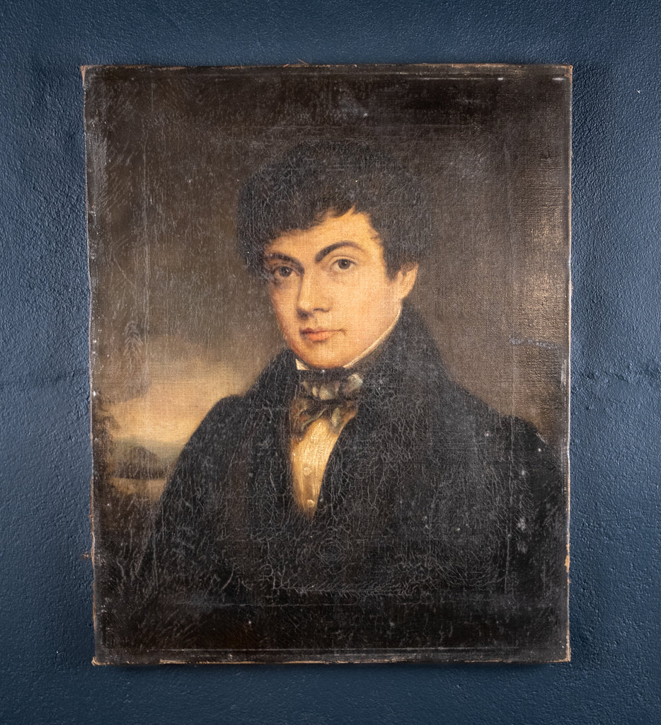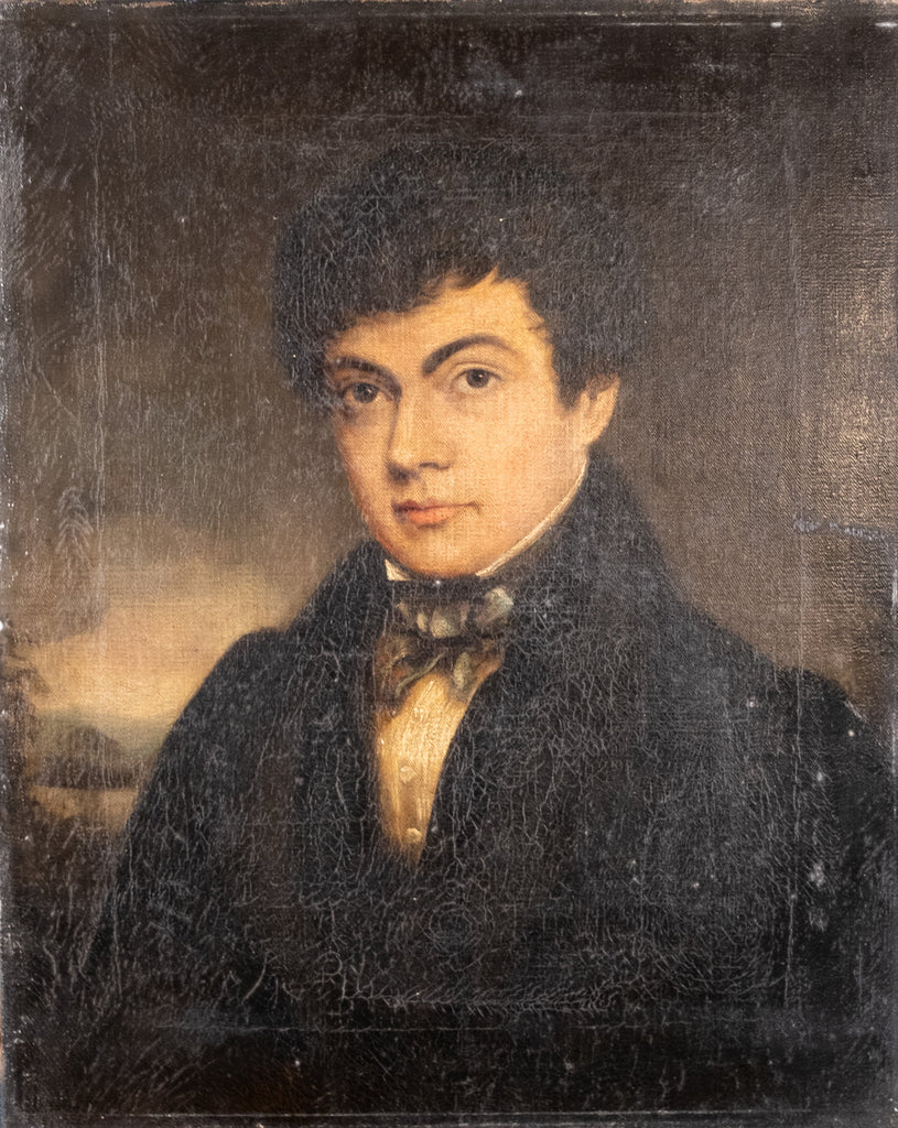 The gentleman sitter is wearing a black jacket and white shirt with a stiff high collar typical of the Regency era with a silk cravat, before a background of moody skies, mountains and a lake.