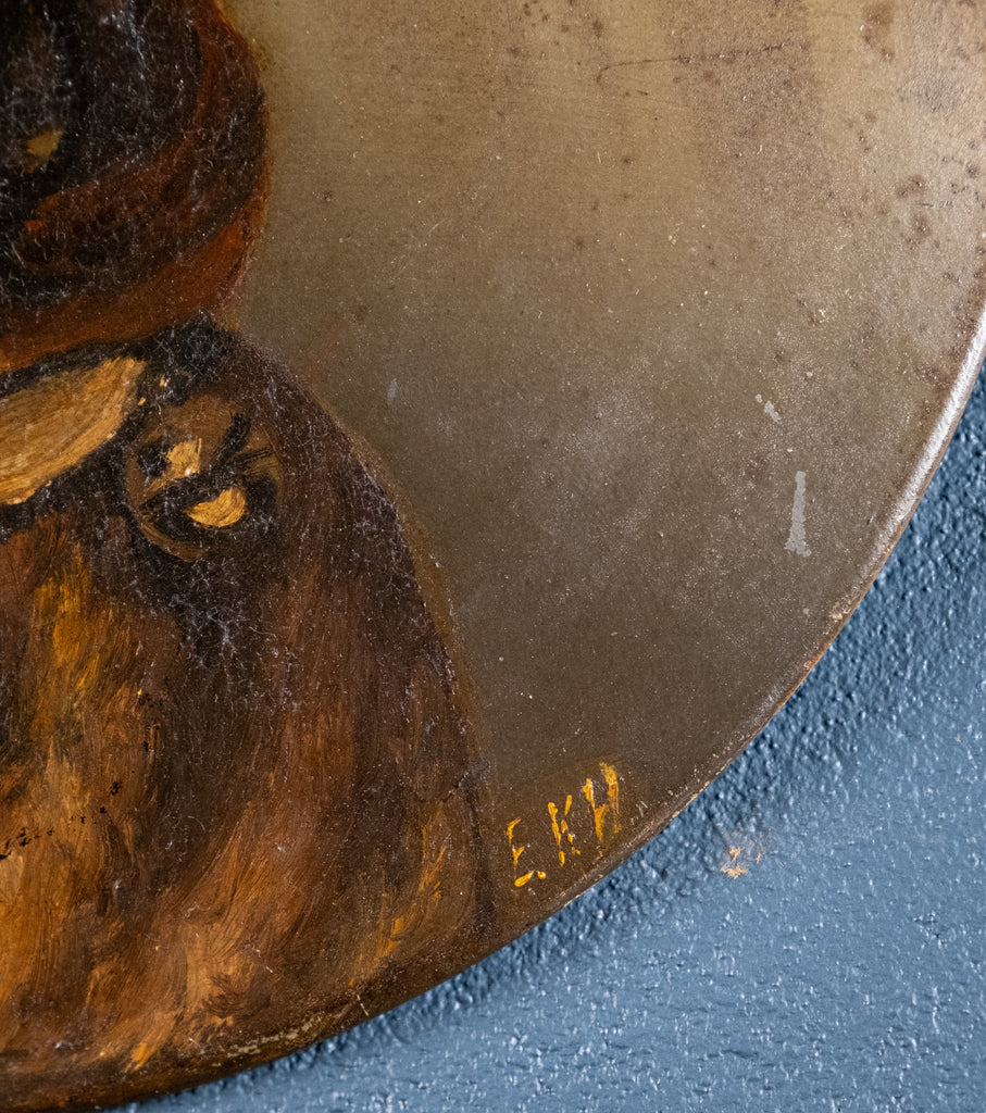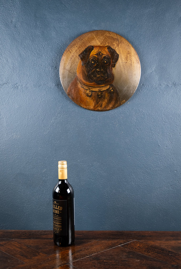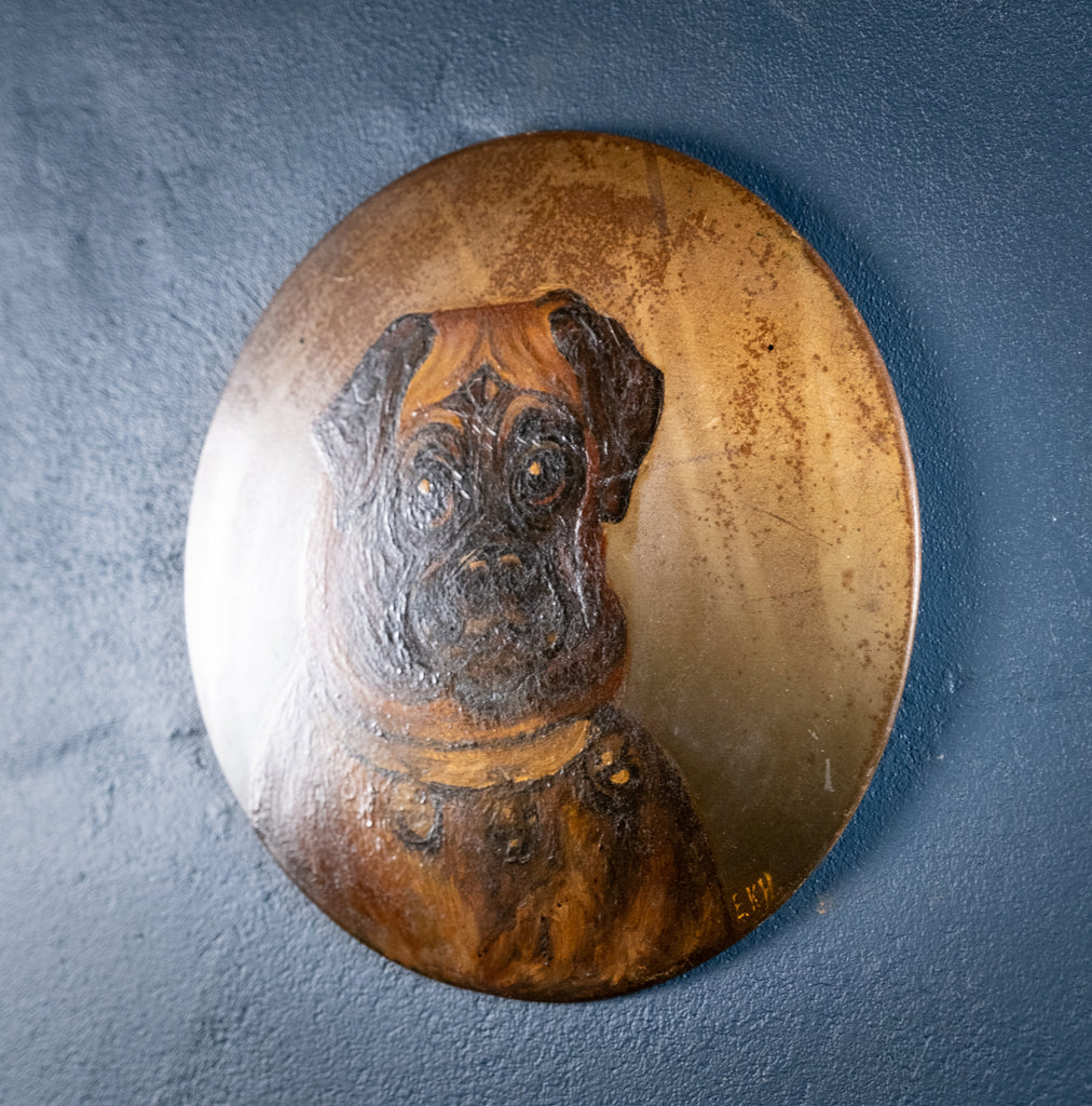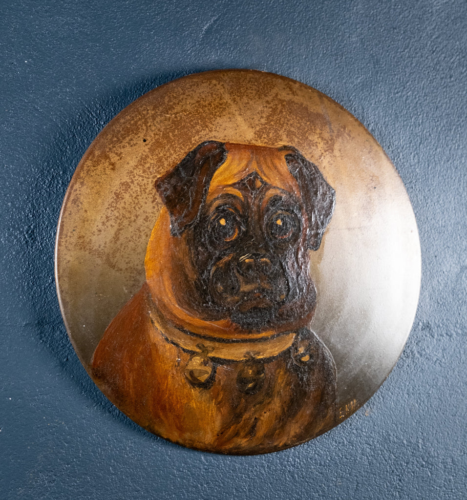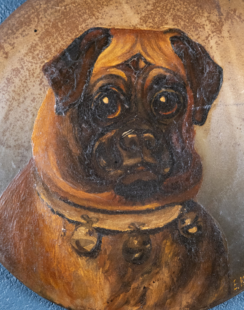 A charming naive oil on tin of a pug with a bell collar. Initialled 'E.K.H' to the lower left.