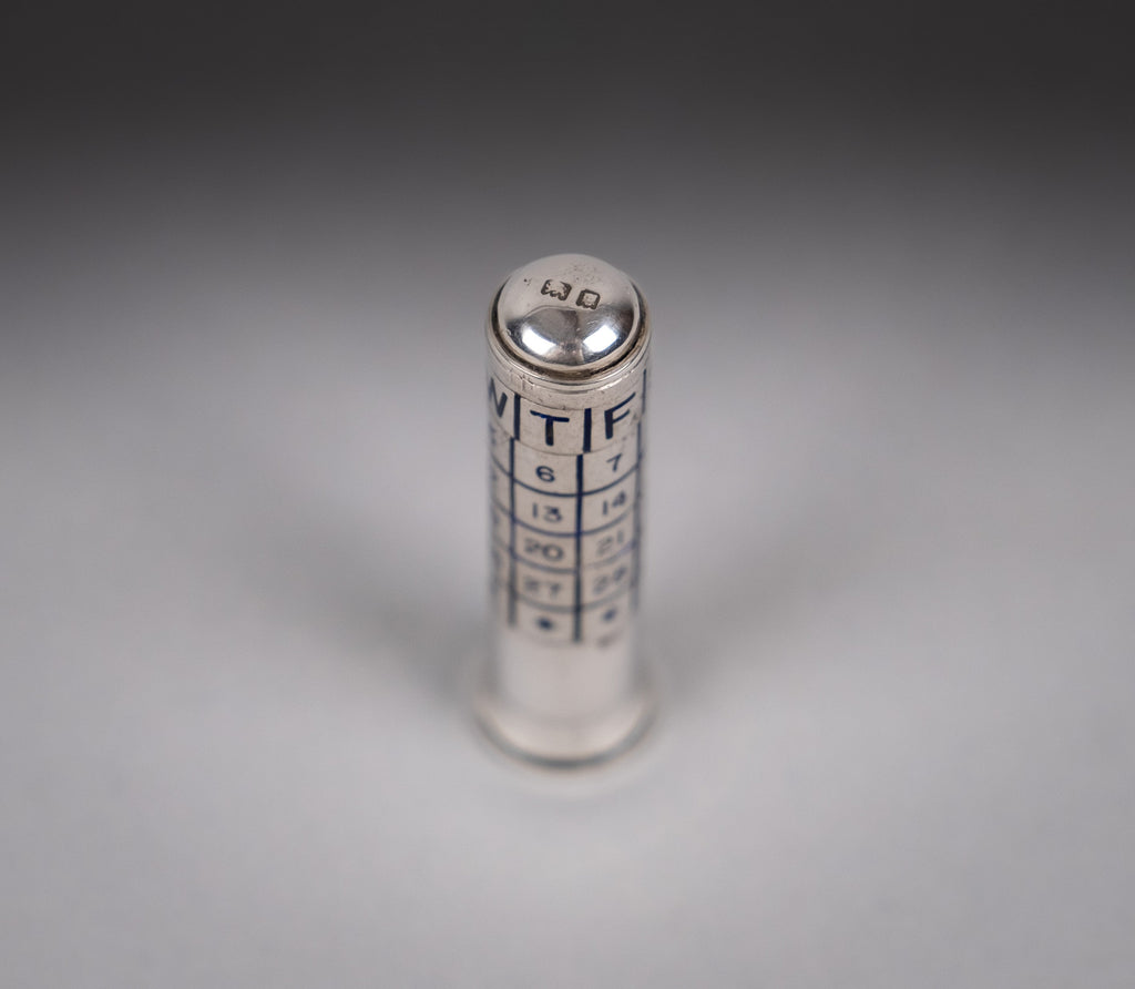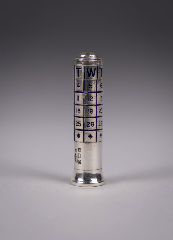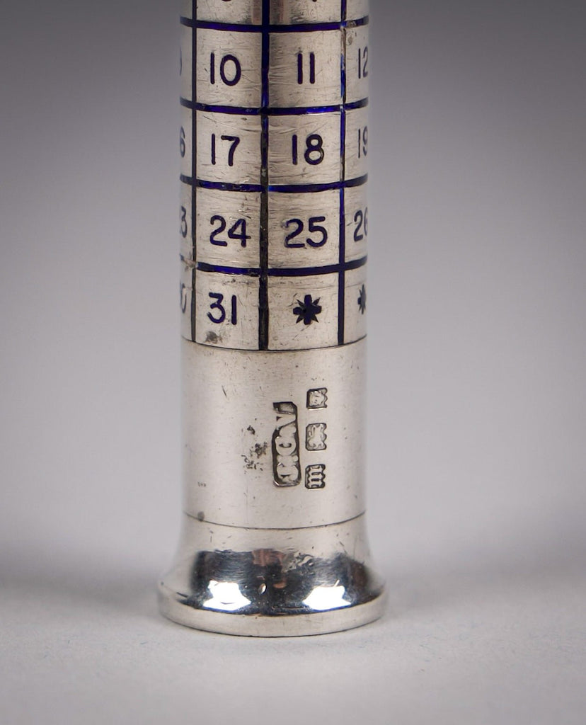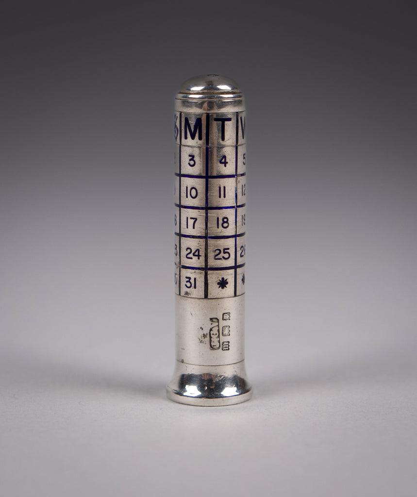A very scarce sterling silver and blue enamel perpetual calendar, fully hallmarked for John Collard Vickery, London, 1927.
