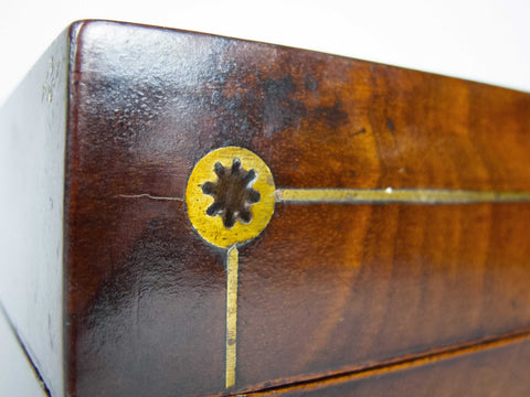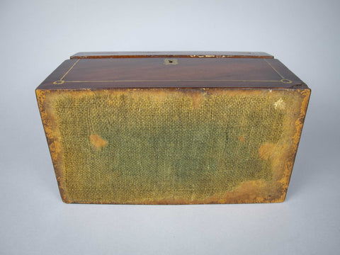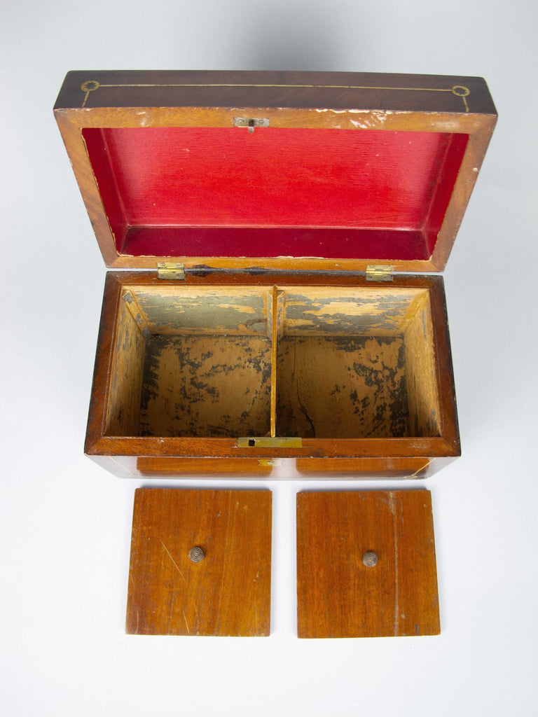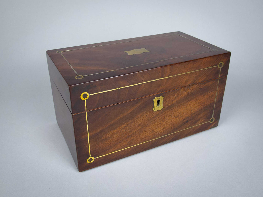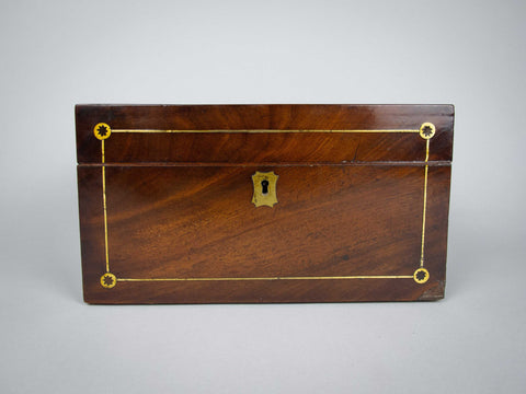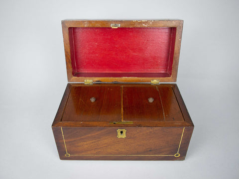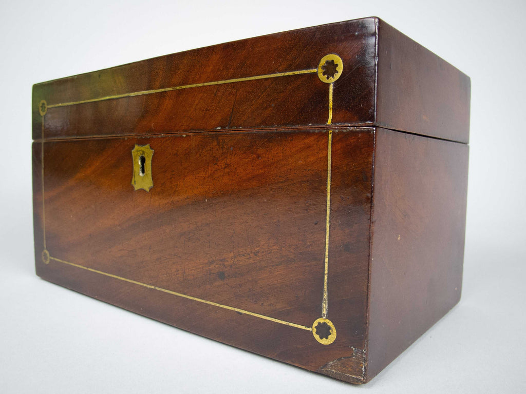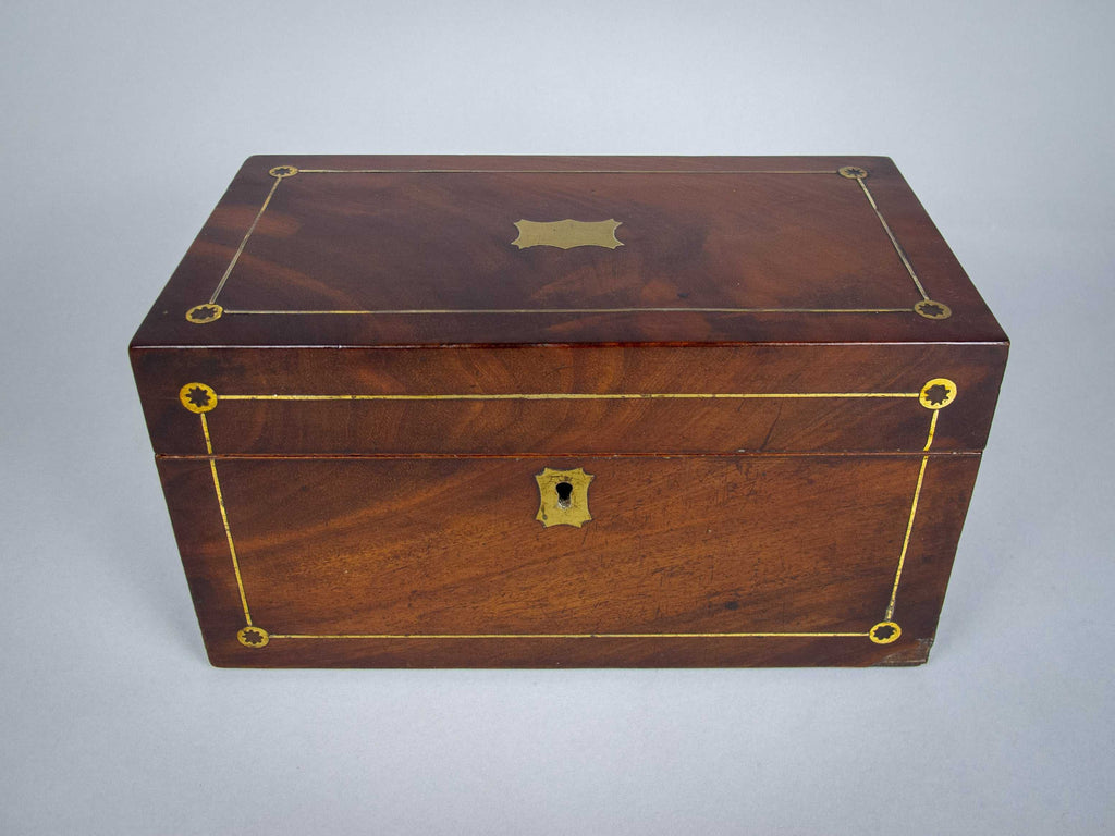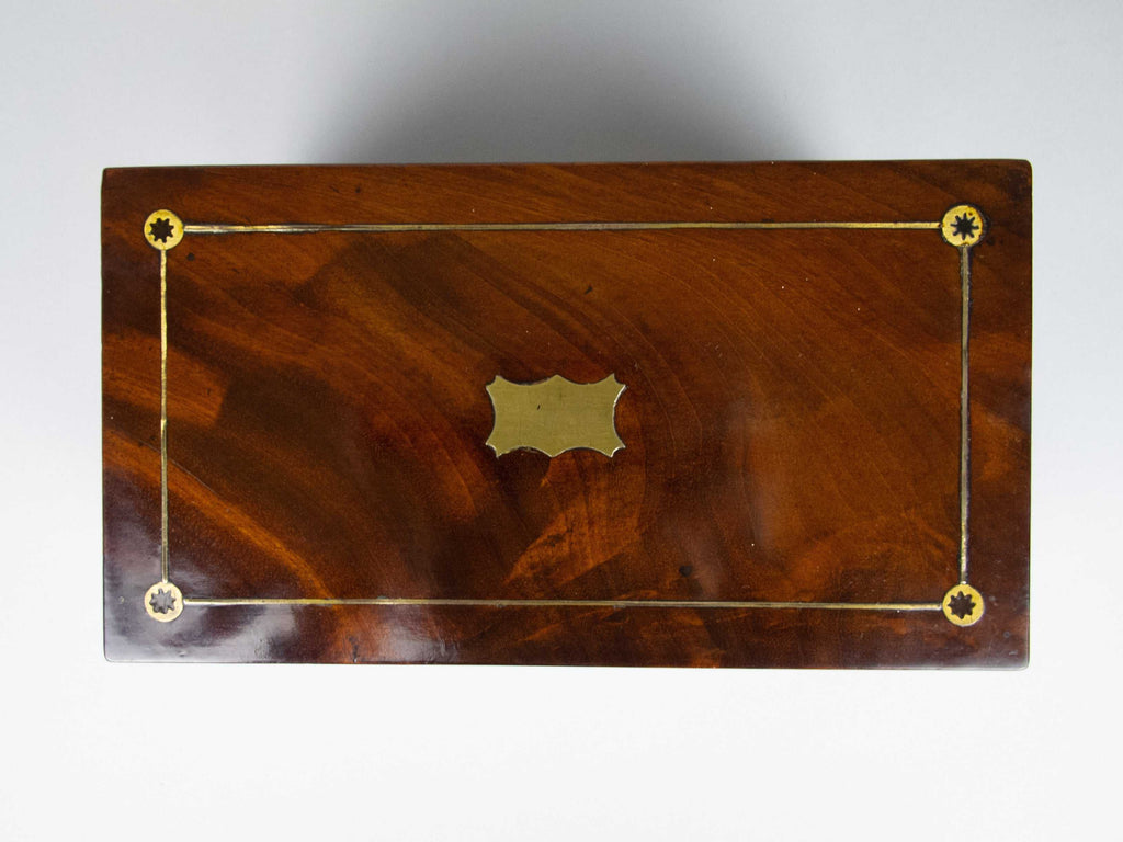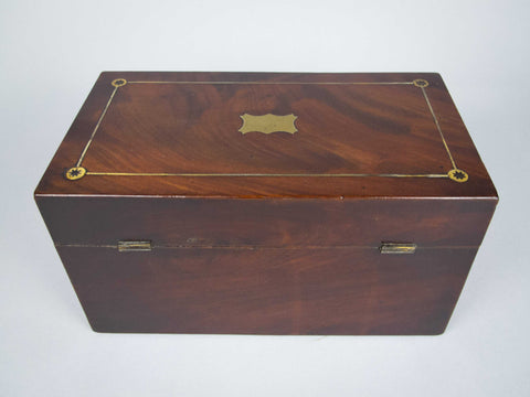 A George IV mahogany and brass inlaid tea caddy with two interior lidded compartments.