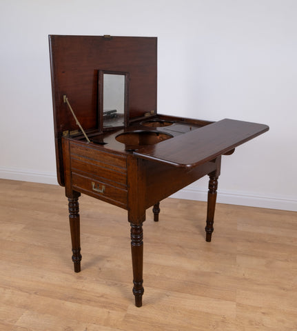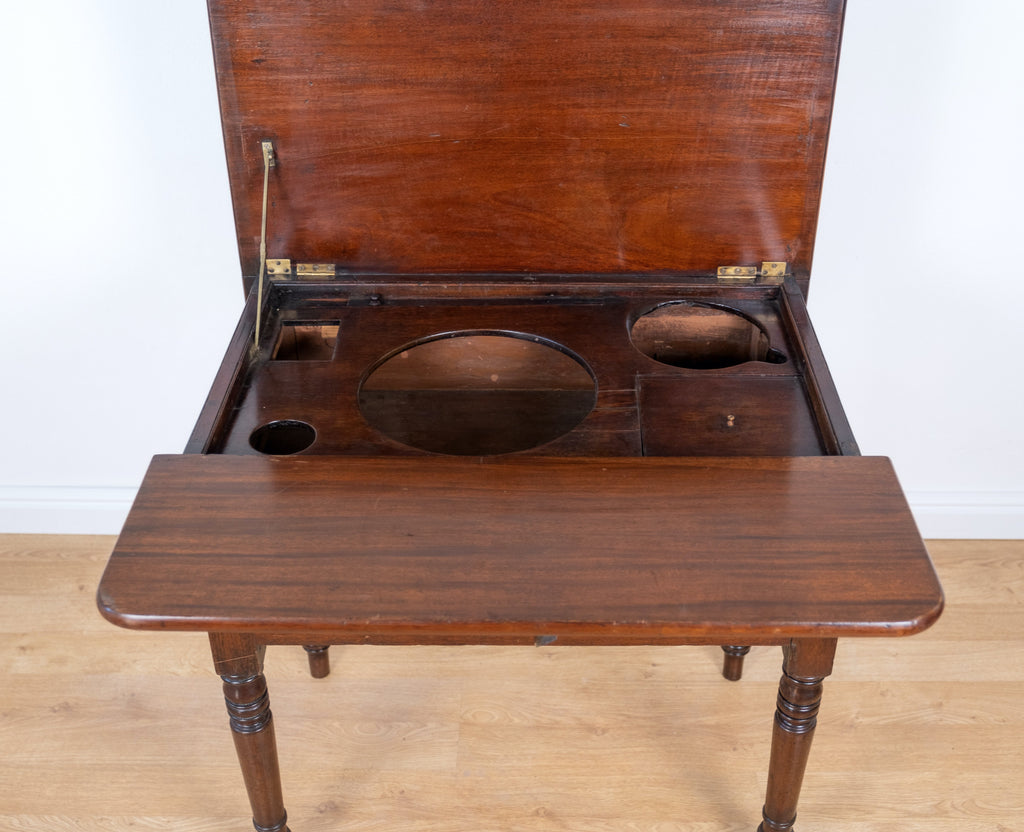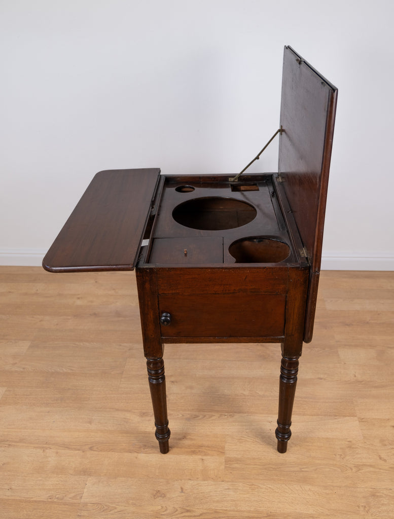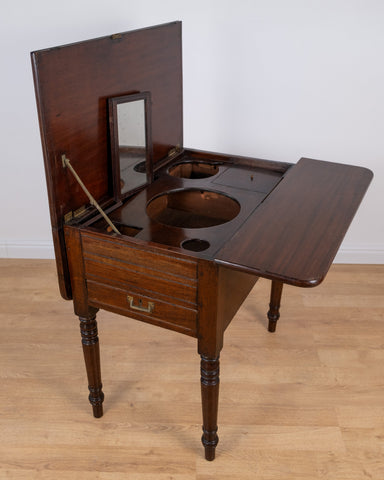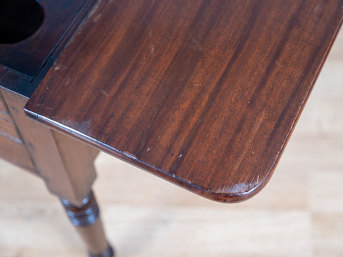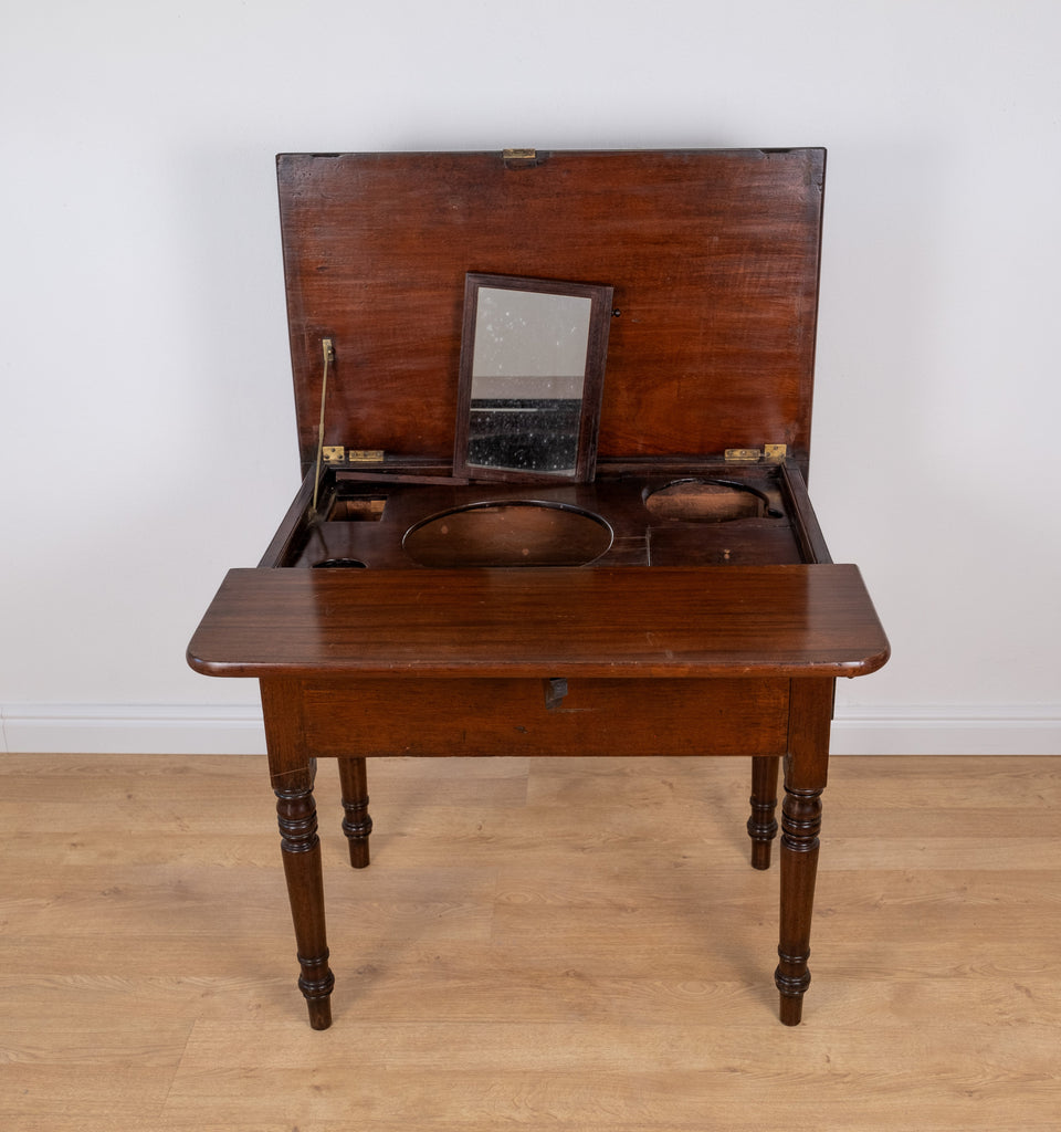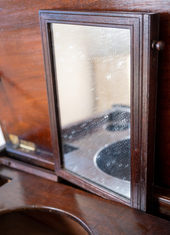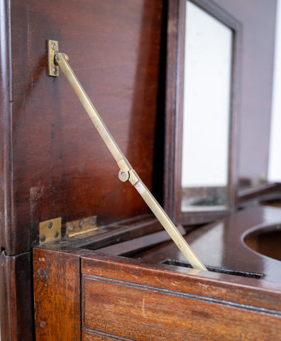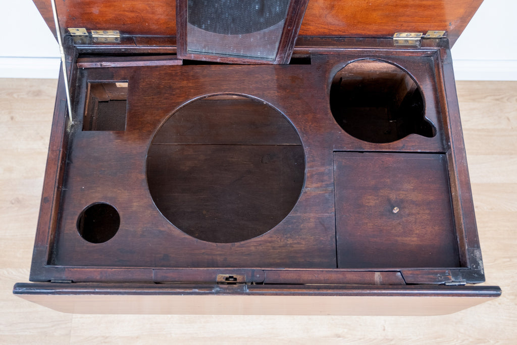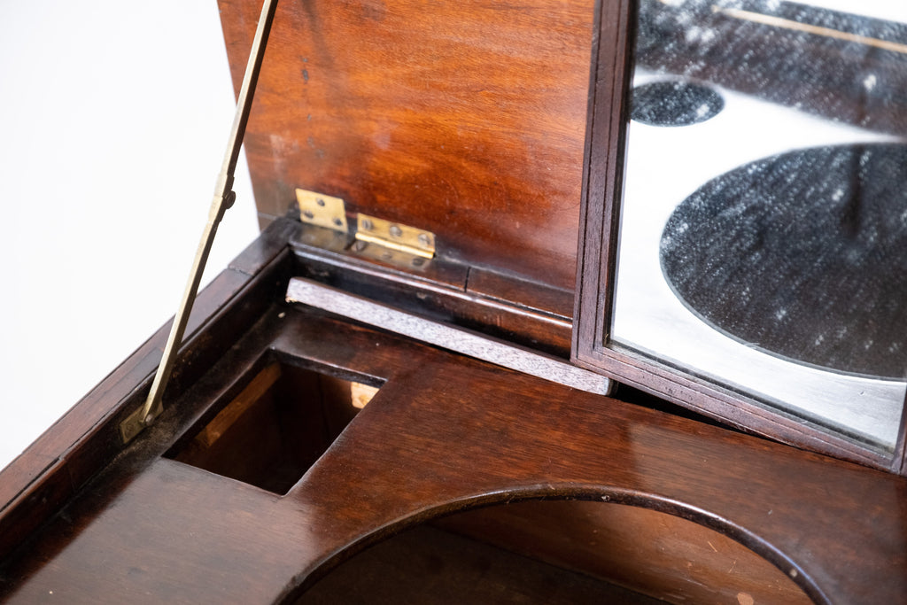 When in the washstand position, a mirror can be lifted from the back. The original hinge is present but broken which prevents the mirror from automatically standing on its own when lifted - it currently has to be rested upon the attachment manually. The washstand has recesses for various dressing pots, wash bowl and jug. A small cupboard is revealed to the rear when the knob is twisted, revealing a double compartment.