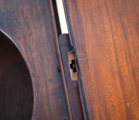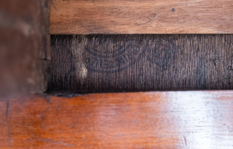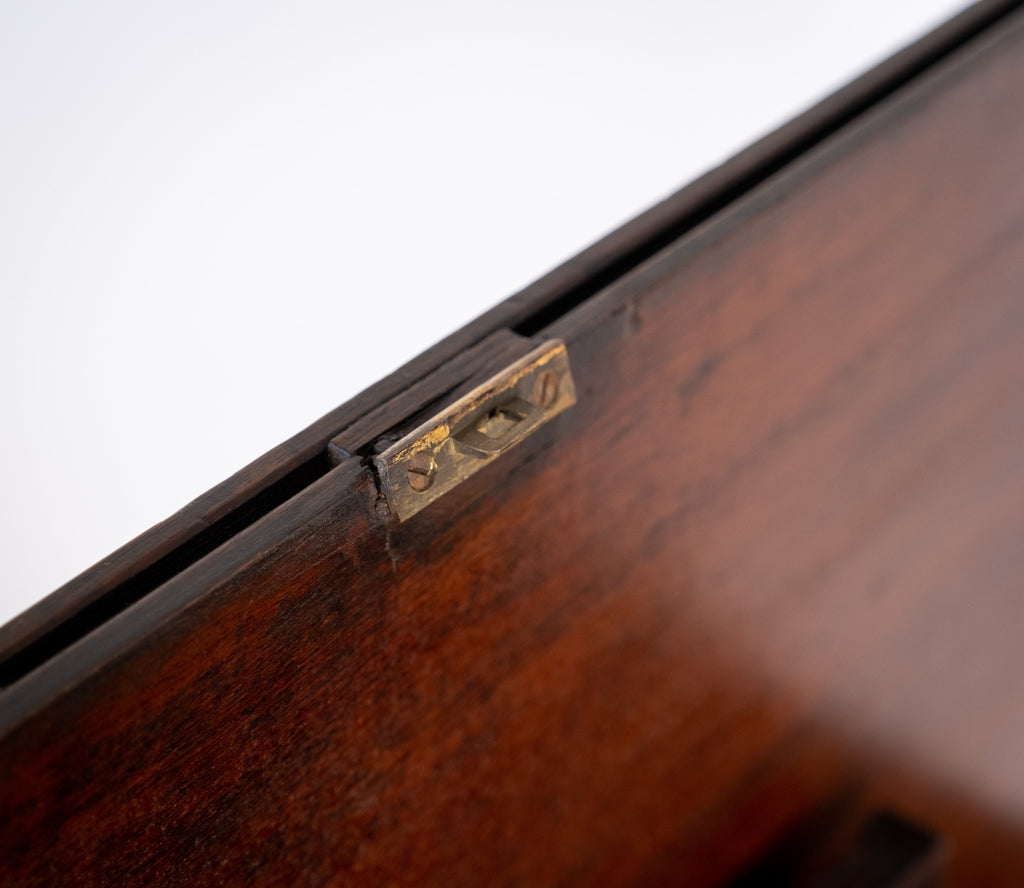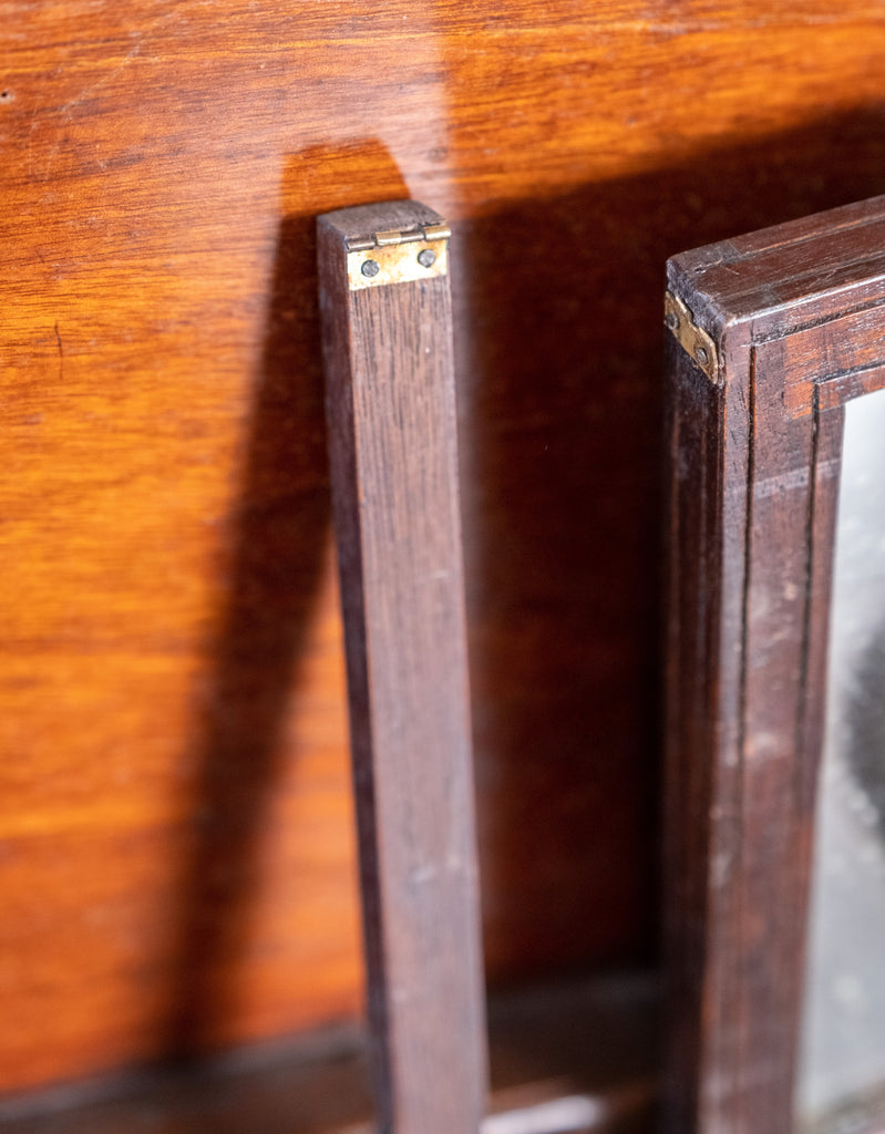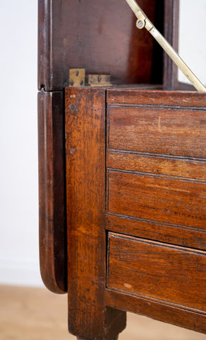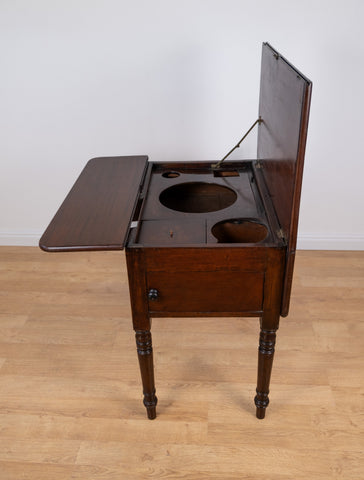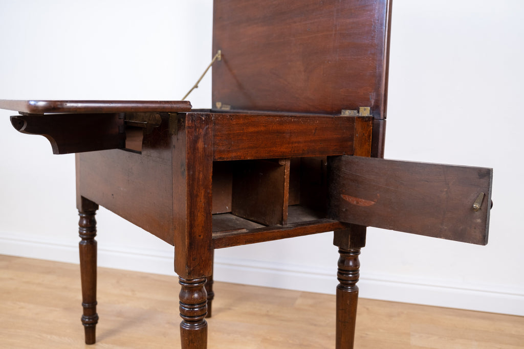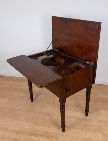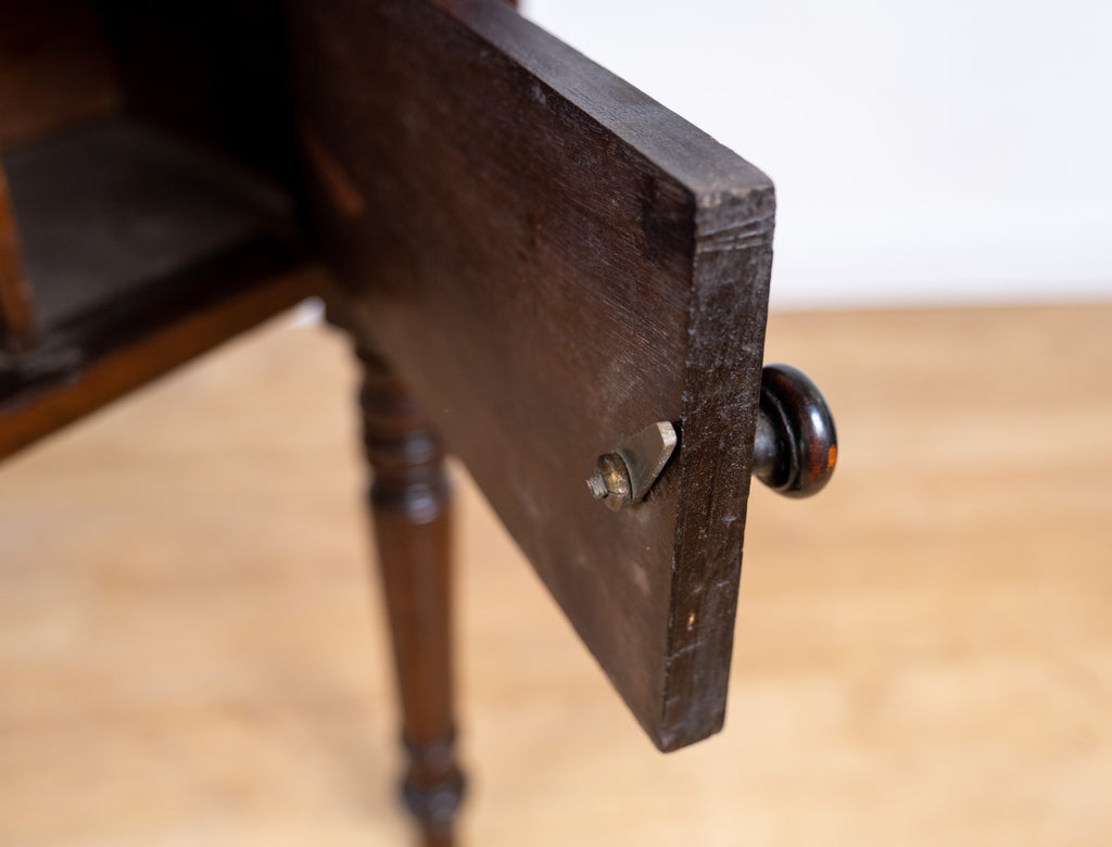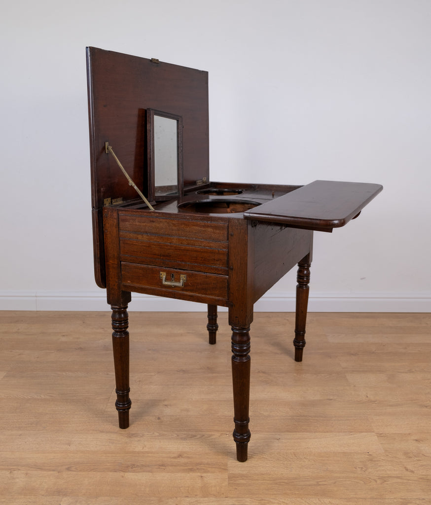 When in the washstand position, a mirror can be lifted from the back. The original hinge is present but broken which prevents the mirror from automatically standing on its own when lifted - it currently has to be rested upon the attachment manually. The washstand has recesses for various dressing pots, wash bowl and jug. A small cupboard is revealed to the rear when the knob is twisted, revealing a double compartment.
