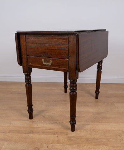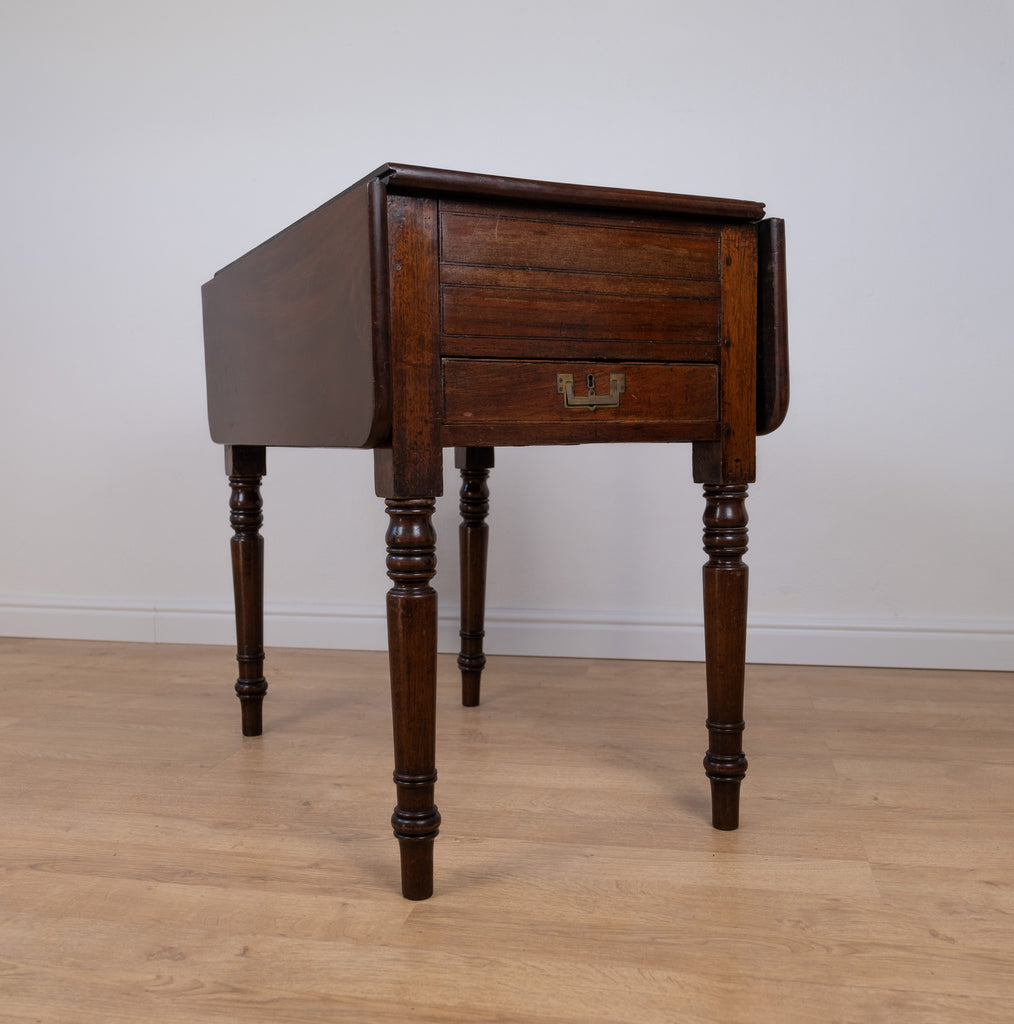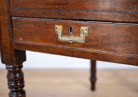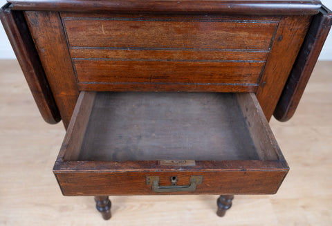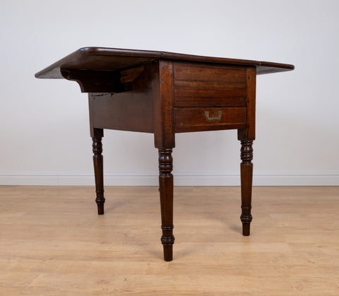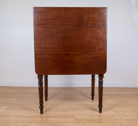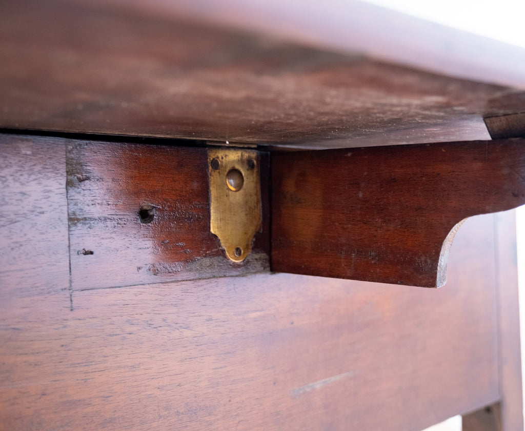 The drop leaf table can have a single leaf opened for use as a desk, both leaves opened for use as a dining table, or the top lifted for use as a washstand and dressing table. The washstand is revealed by pressing a brass button to the underside of a table leaf. The click and release mechanism functions perfectly.