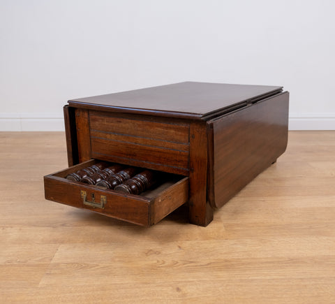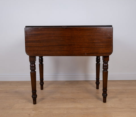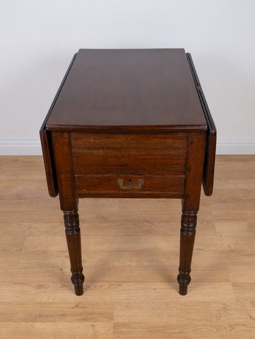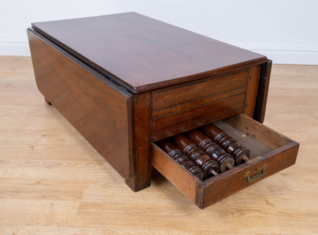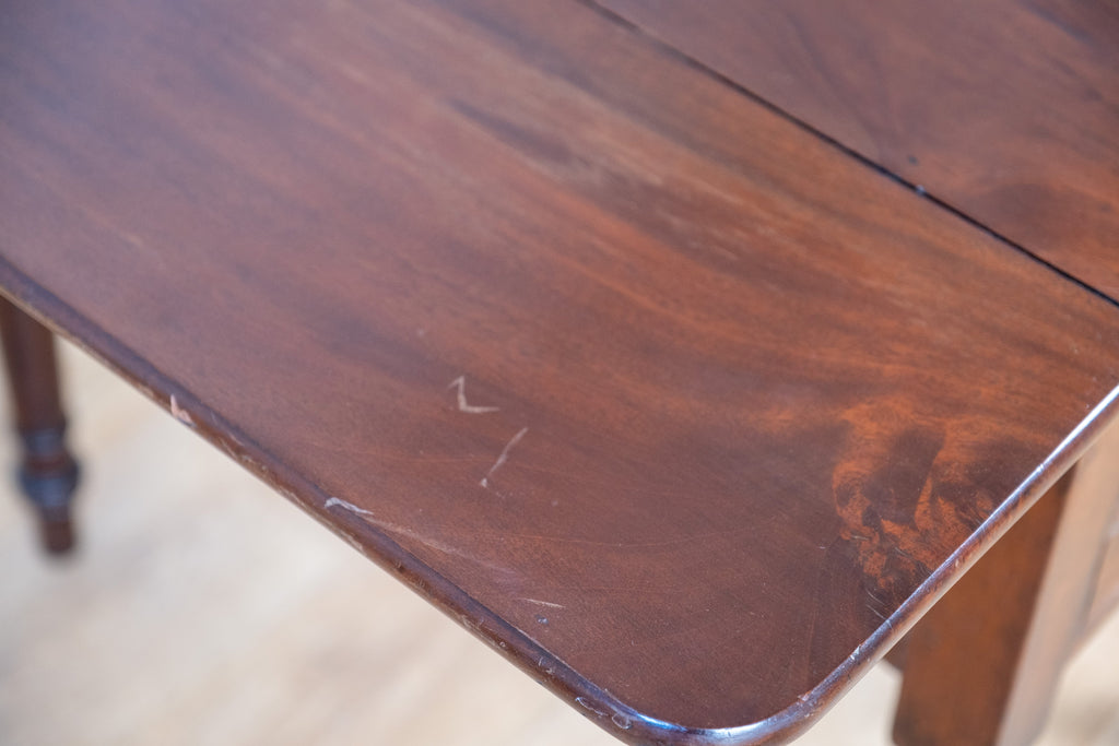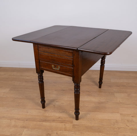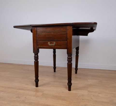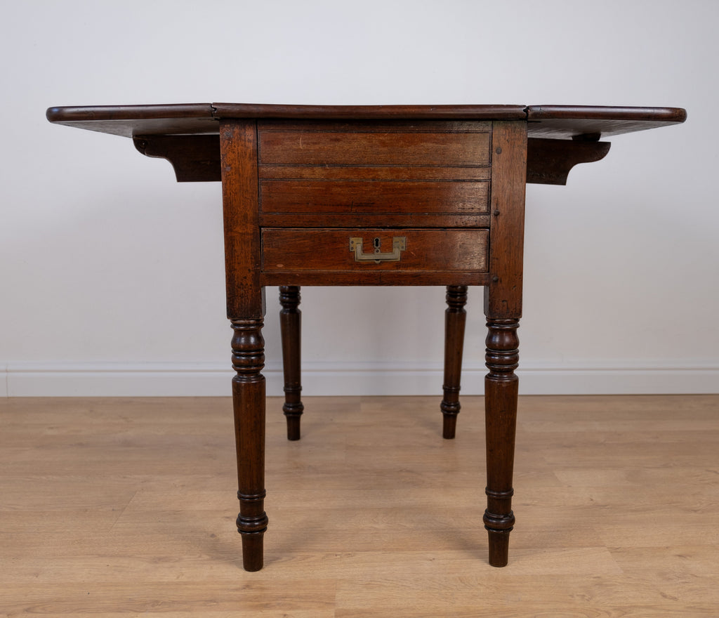 The drop leaf table can have a single leaf opened for use as a desk, both leaves opened for use as a dining table, or the top lifted for use as a washstand and dressing table. The washstand is revealed by pressing a brass button to the underside of a table leaf. The click and release mechanism functions perfectly.