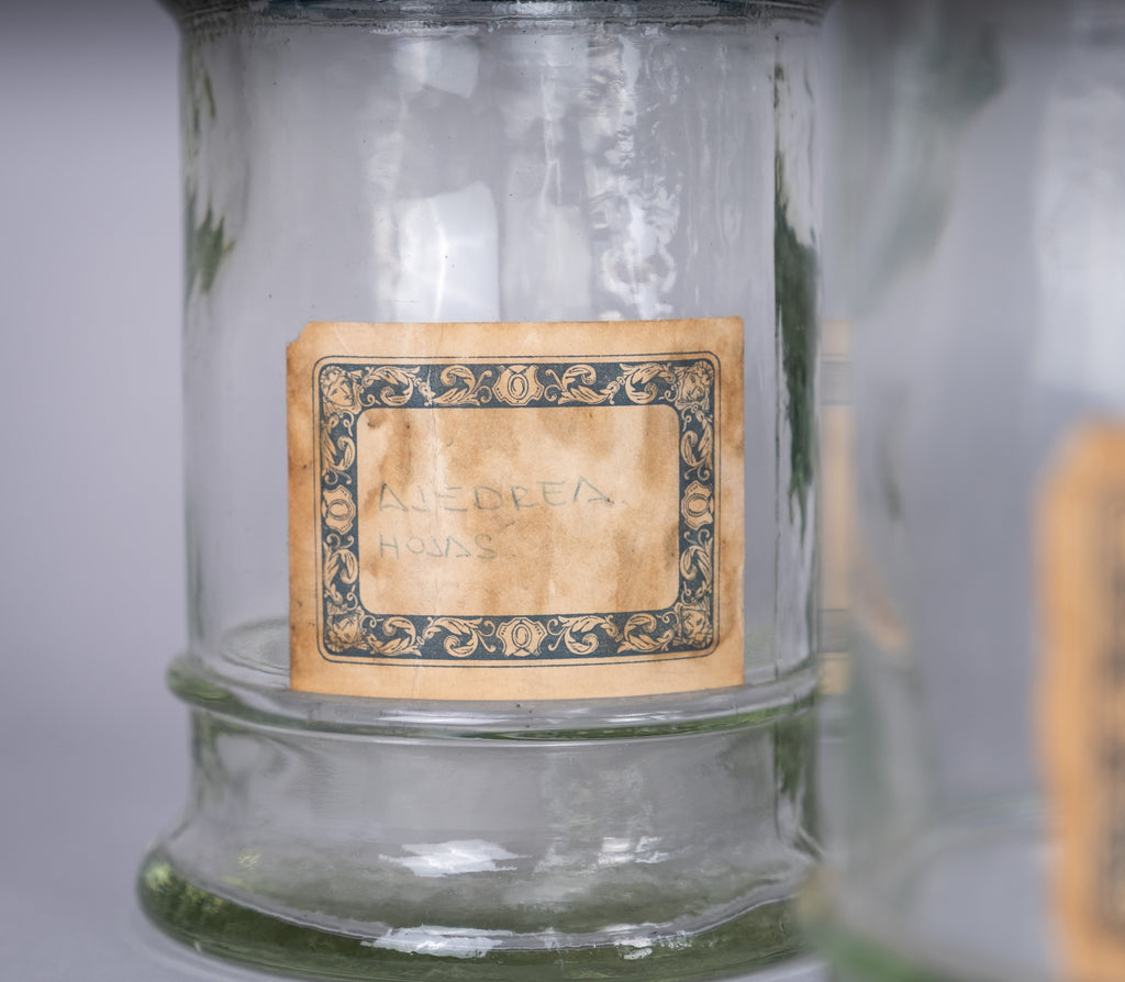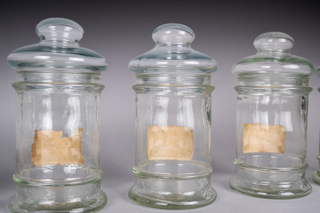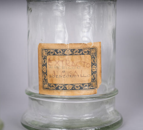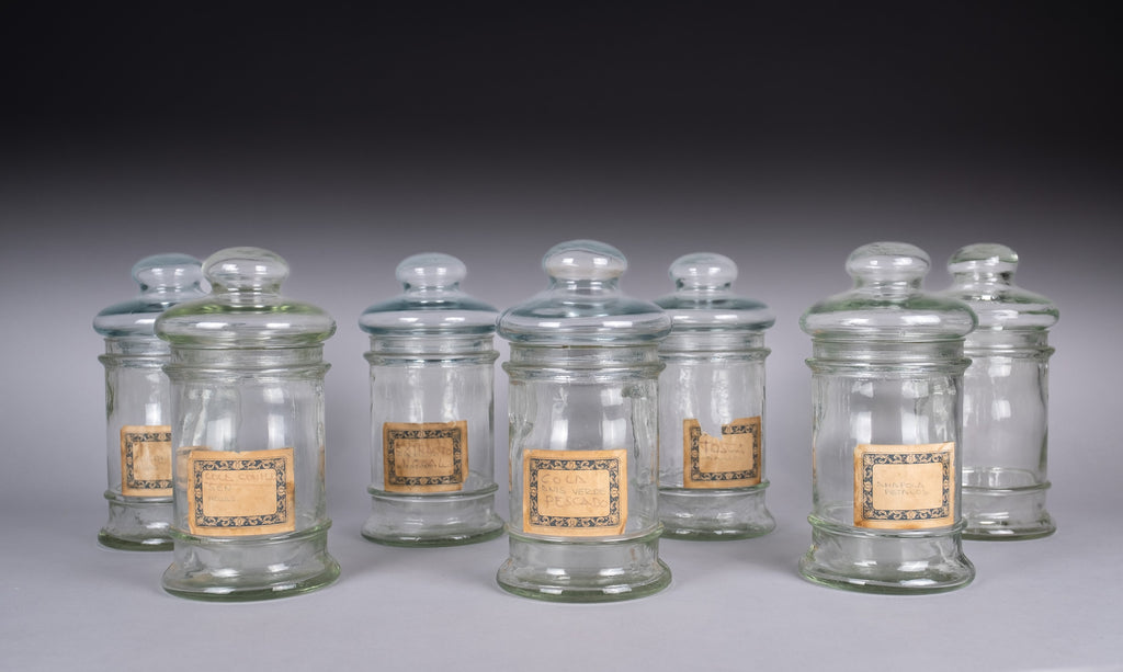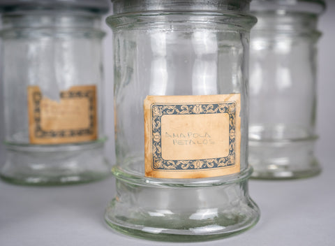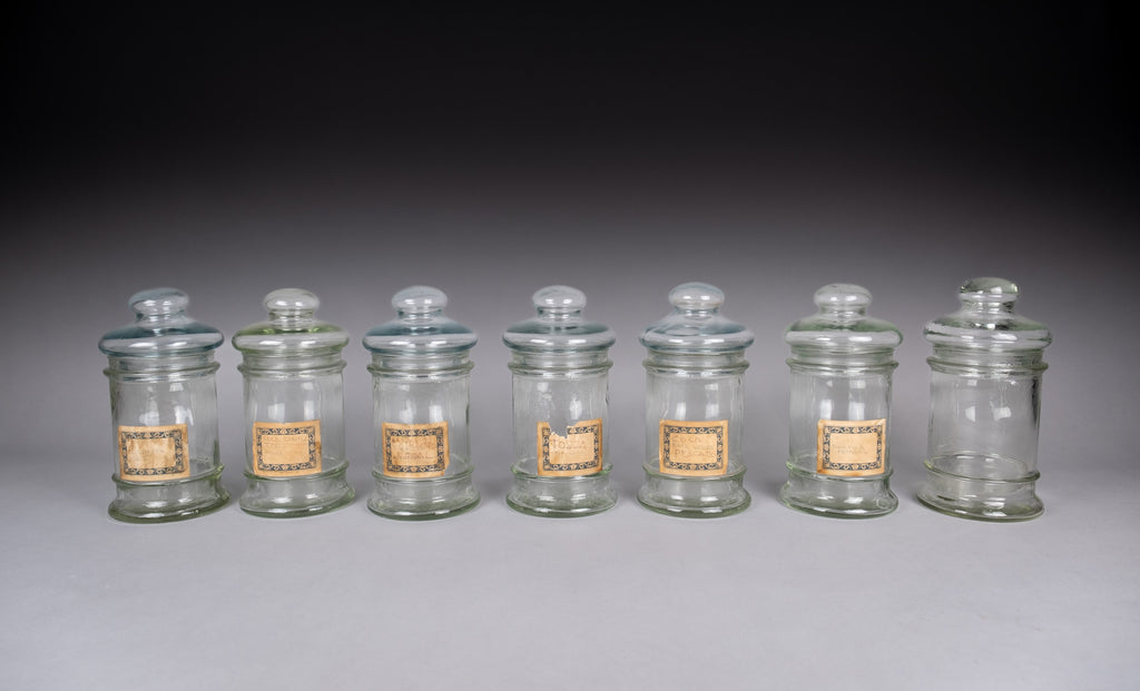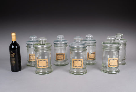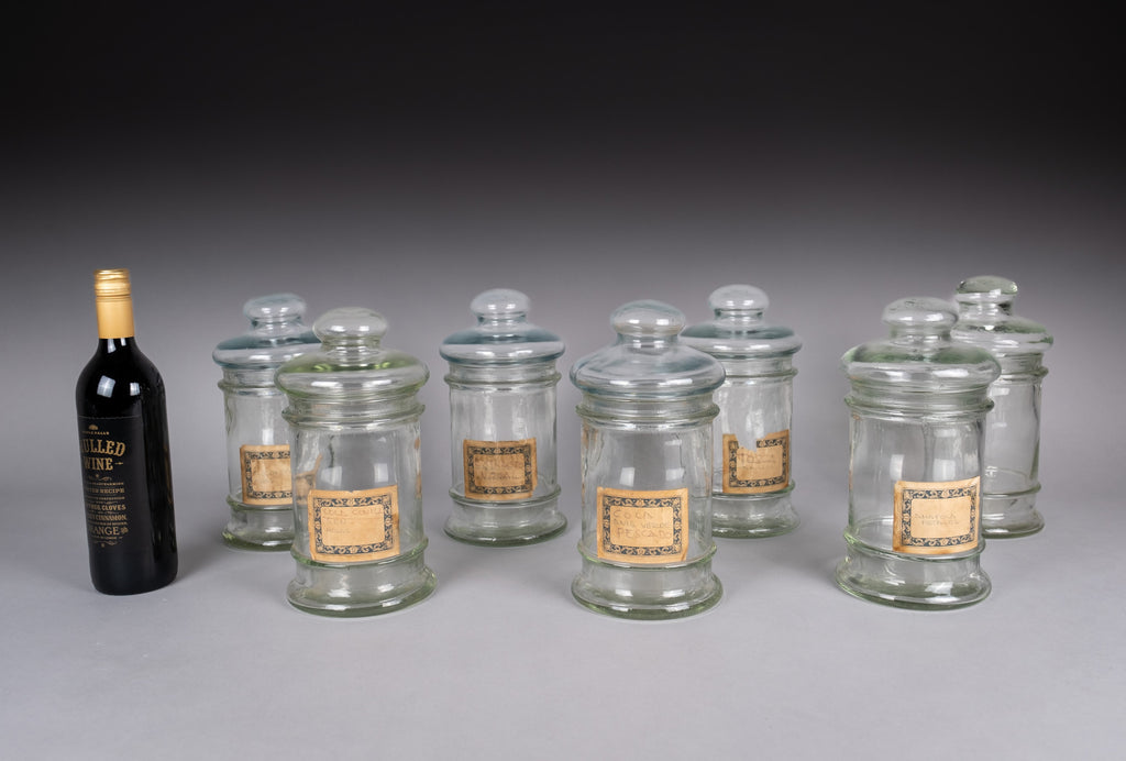 A lovely set of substantial hand blown glass Victorian apothecary / sweet jars, all save one bearing Spanish apothecary labels.