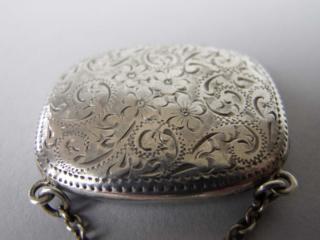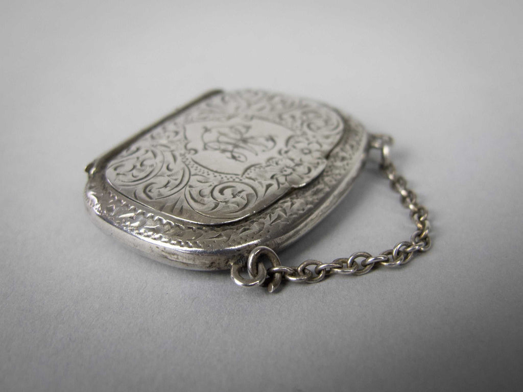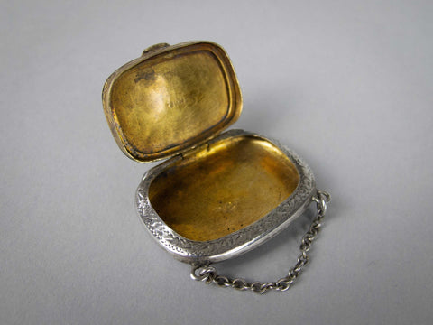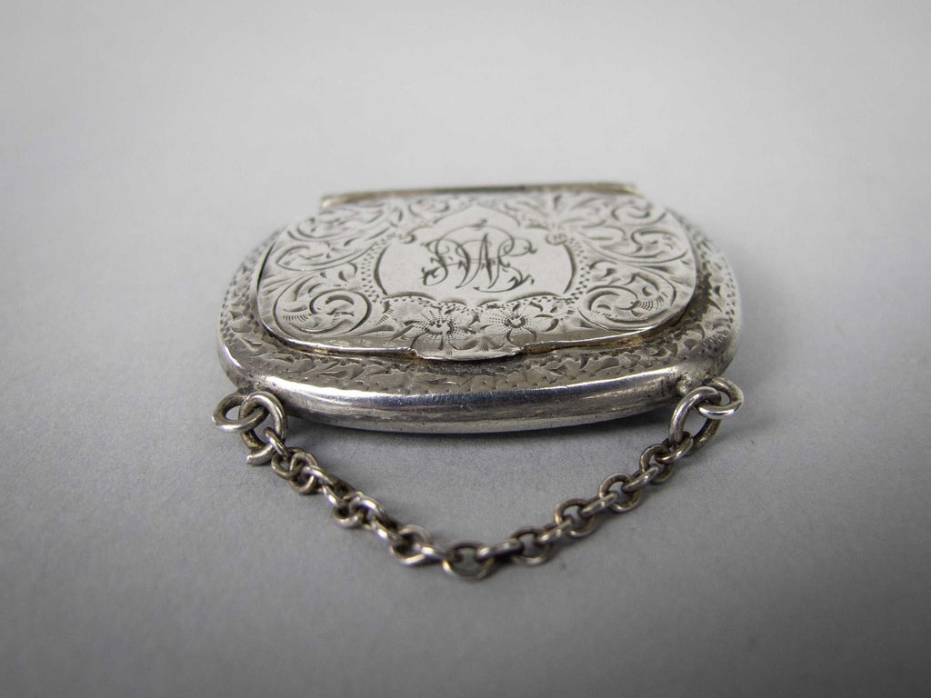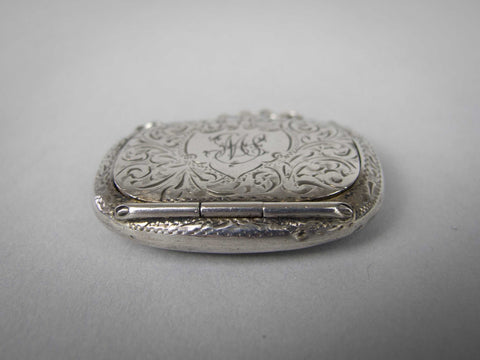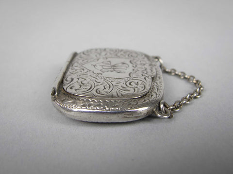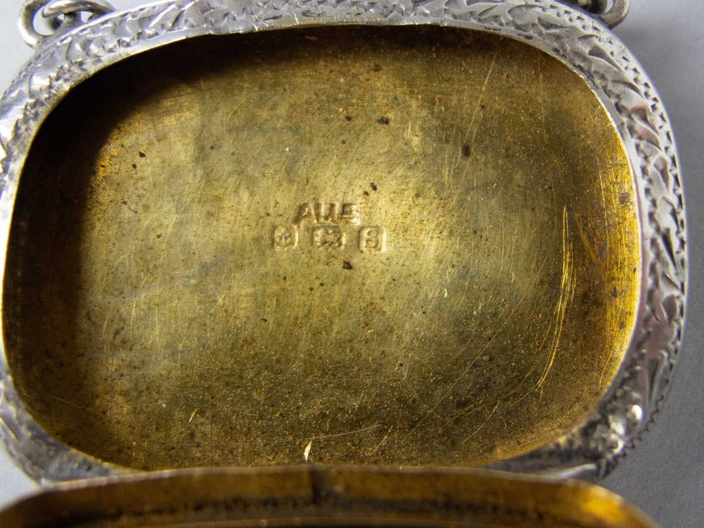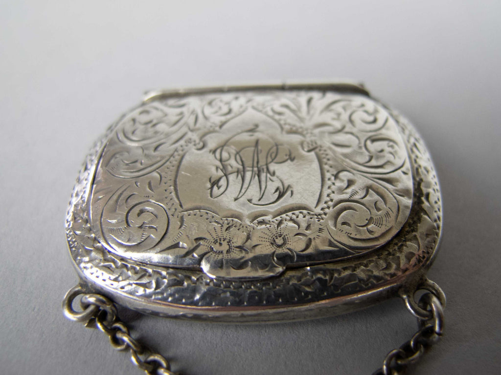 The snuff box is of purse form and compete with hanging chain. The box is embossed with an ornate foliate design throughout, with a monogram to the top of the lid. The hinged lid lifts and clicks shut with ease. The top of the lid is slightly depressed from years of being clicked shut and the bottom of the case protrudes slightly, likely a result of repeated snuff pinching.