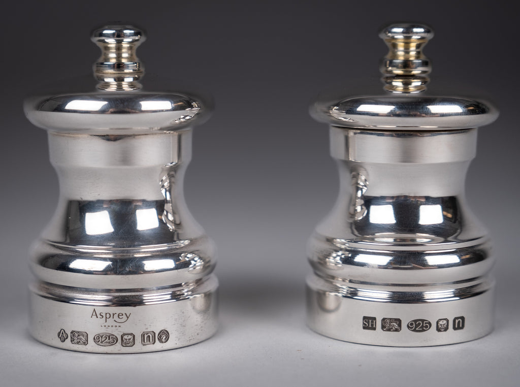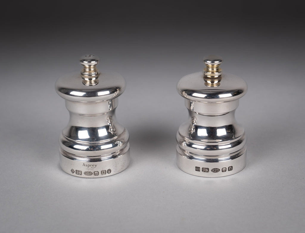 The Asprey salt bears a stamped 'S' to the top of the mill and the Hersey pepper has a gilt band. Both mills remain in an immaculate condition internally and look to have never been used. There is some light wear to the silver externally (please see photographs) but generally both mills remain in a very good condition.