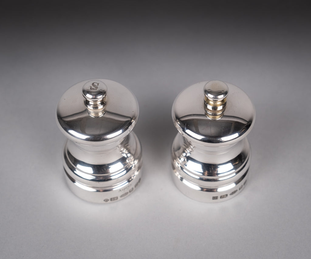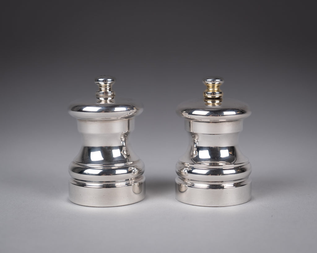 A very attractive near pair of silver capstan mills of identical size; the salt mill fully hallmarked for Asprey, London, 2012 and the near matching pepper mill, fully hallmarked for Hersey & Son, London, 2012.