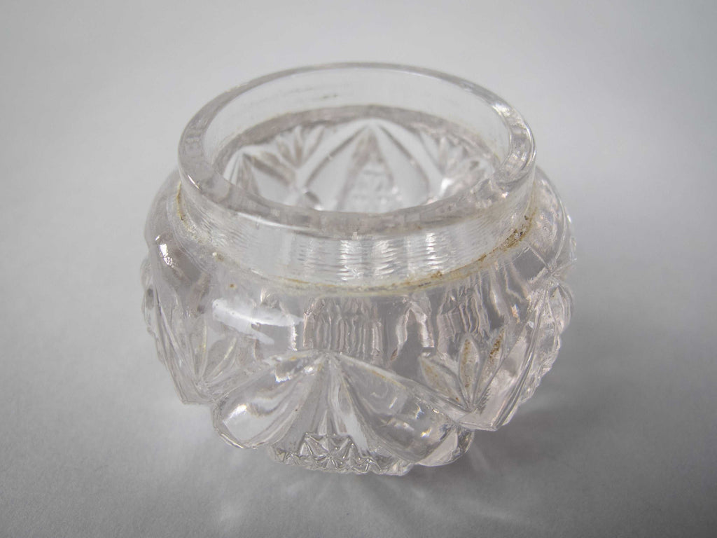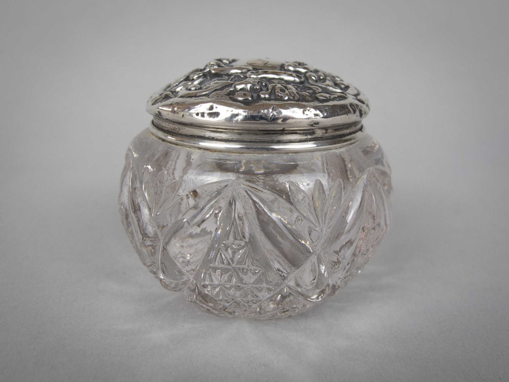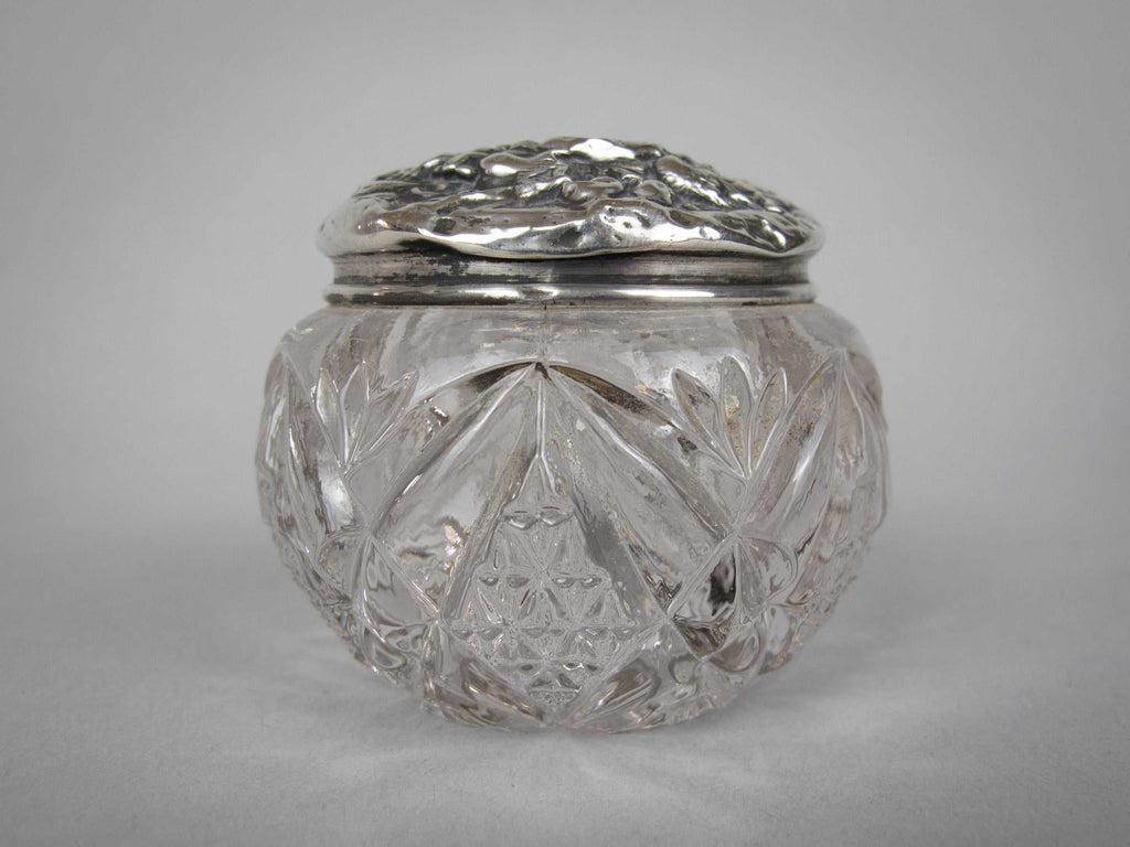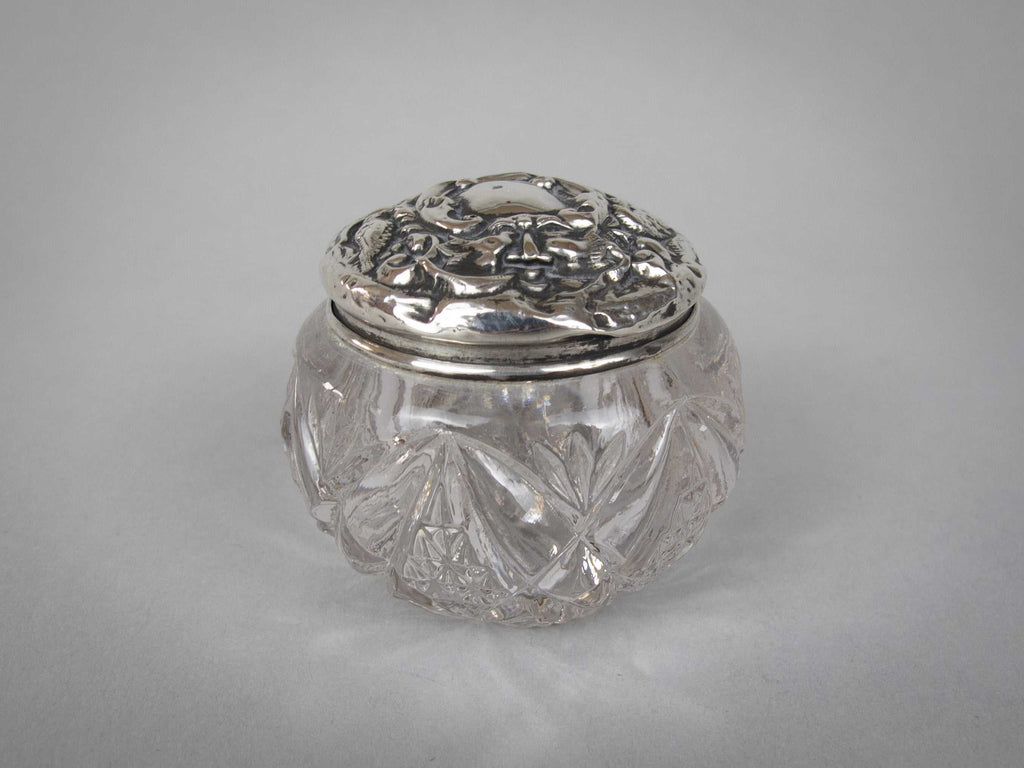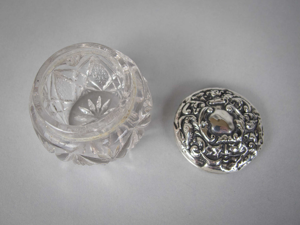 A charming small sterling silver and cut glass jar, fully hallmarked for Boots Pure Drug Company, Birmingham, 1905.