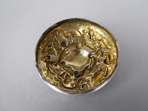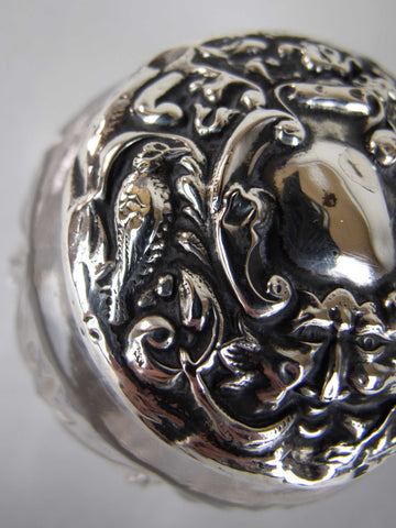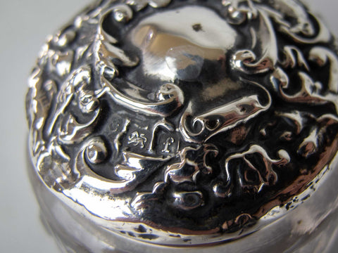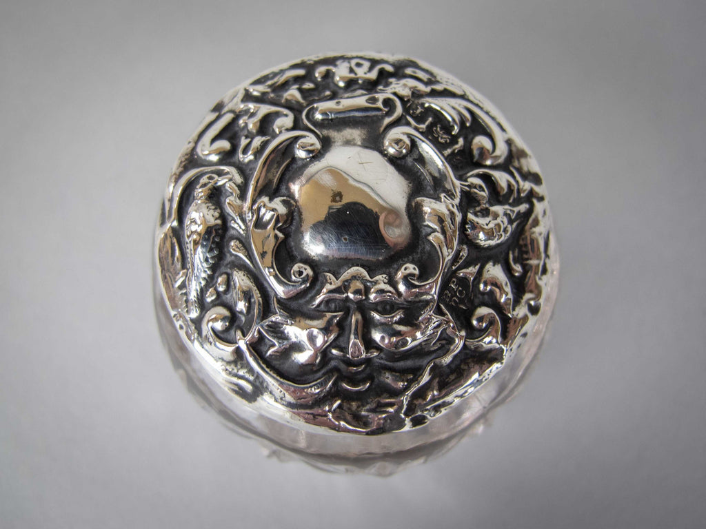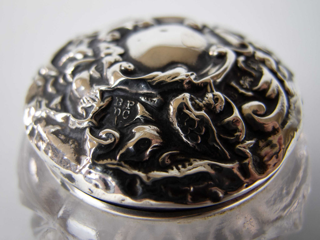 The silver lid boasts stunning foliate detail with a bird and a depiction of the 'green man', all surrounding a blank armorial cartouche. There is some denting in places to the edges of the silver lid (please see photographs), but otherwise it remains in a good condition. The cut glass jar remains in an excellent condition.