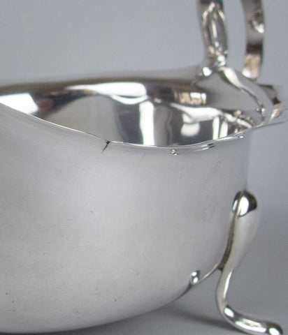 There is one very small split to the silver at the rim (please see photographs), however as it follows the scroll edge it is barely perceptible. Otherwise, the sauce boat remains in an excellent with clear hallmarks.