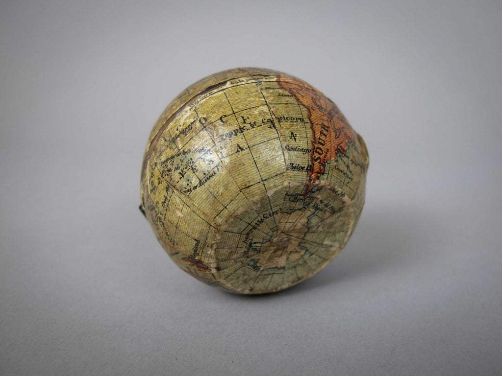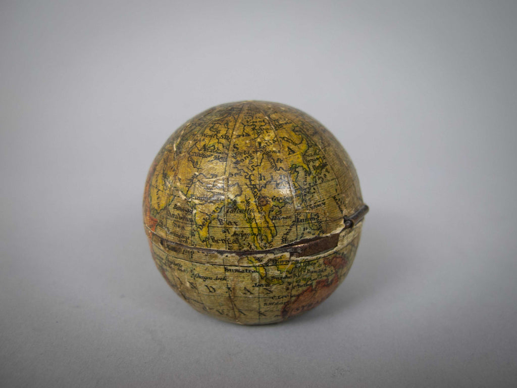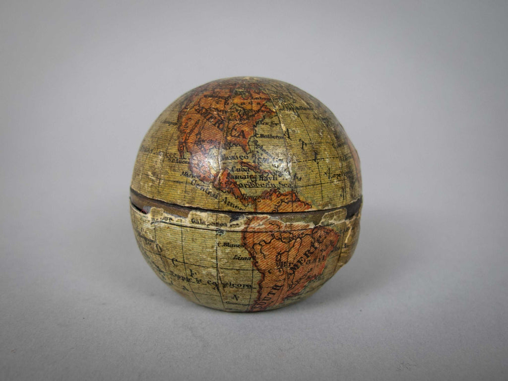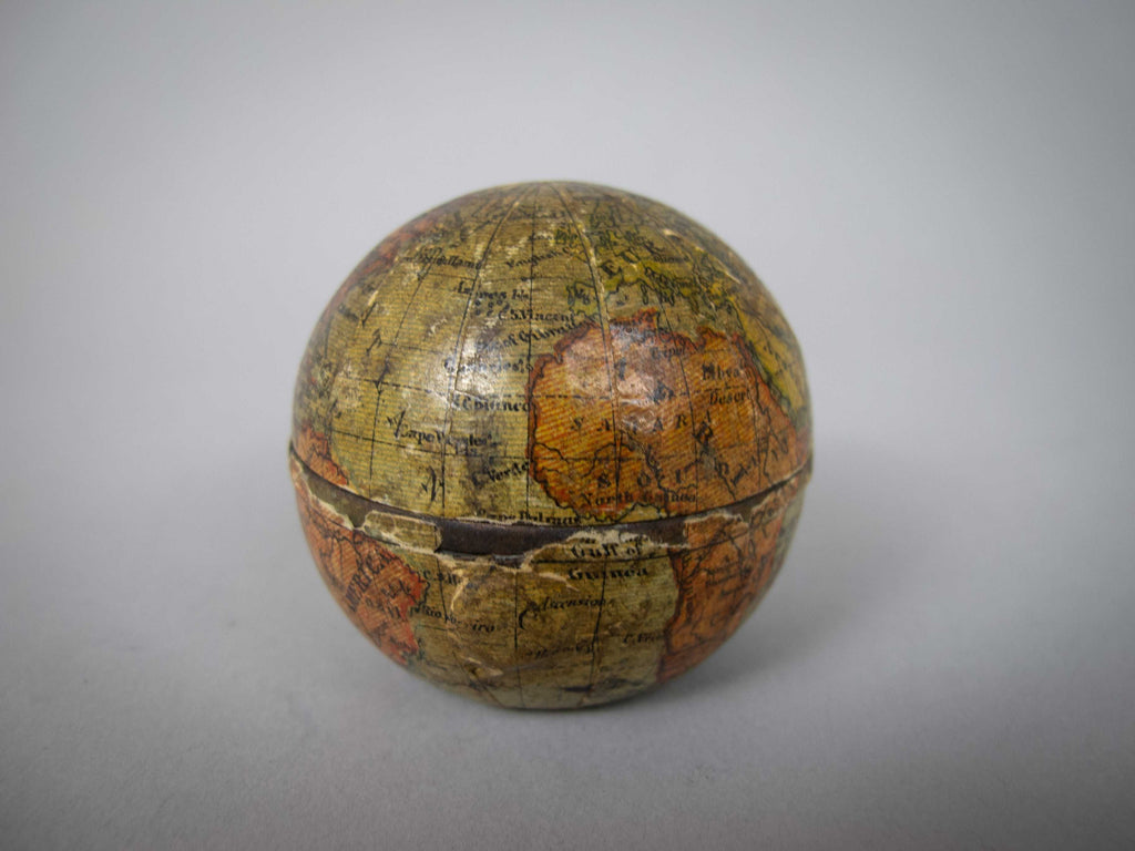 The globe remains in a rarely found condition with only minor deterioration to the lithograph map, and the concealed button remaining concealed under the lithograph.