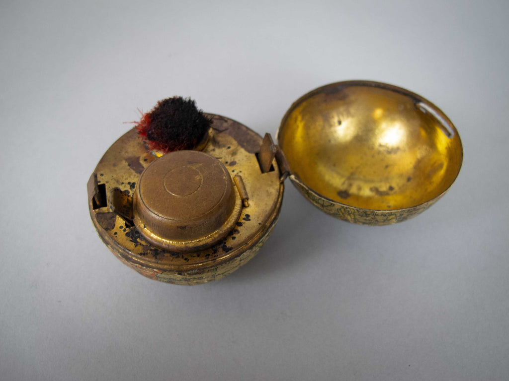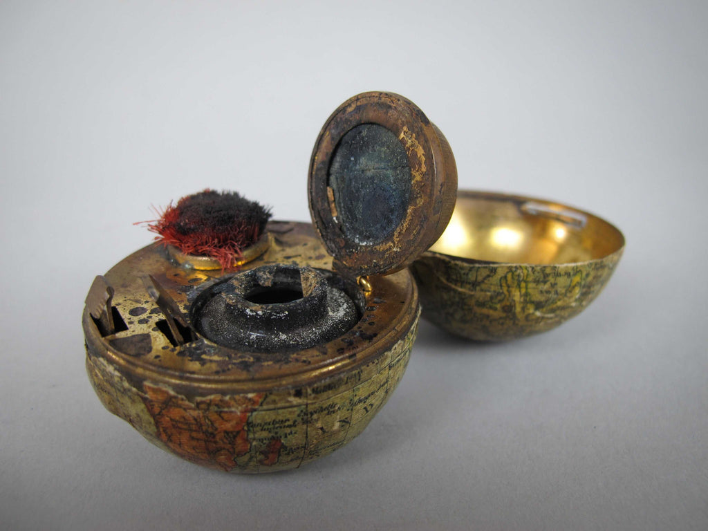 The inkwell boasts a sprung lid which is operated by a concealed button to the front of the globe.