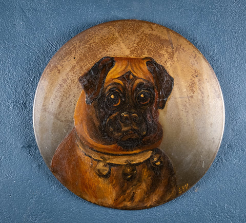 Pug With Bell Collar - Oil on Tin. Naive School. C.1900.
