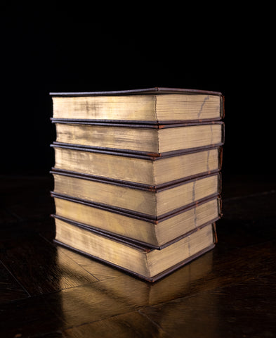 Each volume is fully bound in a rich brown leather with five raised bands to the spine. Title and date of publication gilt stamped to spine. All page edges gilt. All volumes show shelf wear. There is degradation to the leather binding in areas, most notably to the hinge joints of some volumes. There is some marking to the top gilt page edge of all volumes.