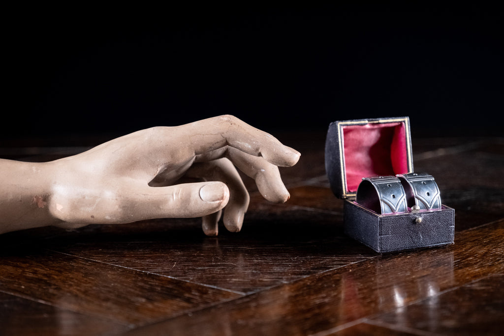A charming cased pair of novelty silver napkin rings in the form of belts, fully and clearly hallmarked for James Dixon & Sons, Sheffield, 1894.