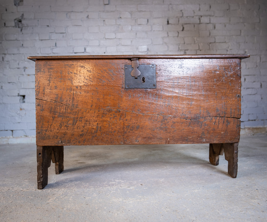 A charming Charles II 17th century oak six plank coffer of pegged construction, c.1650.