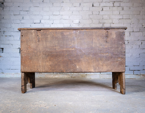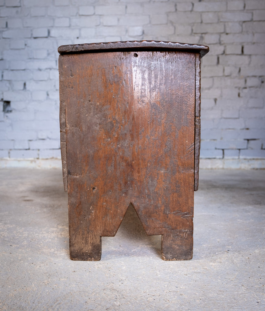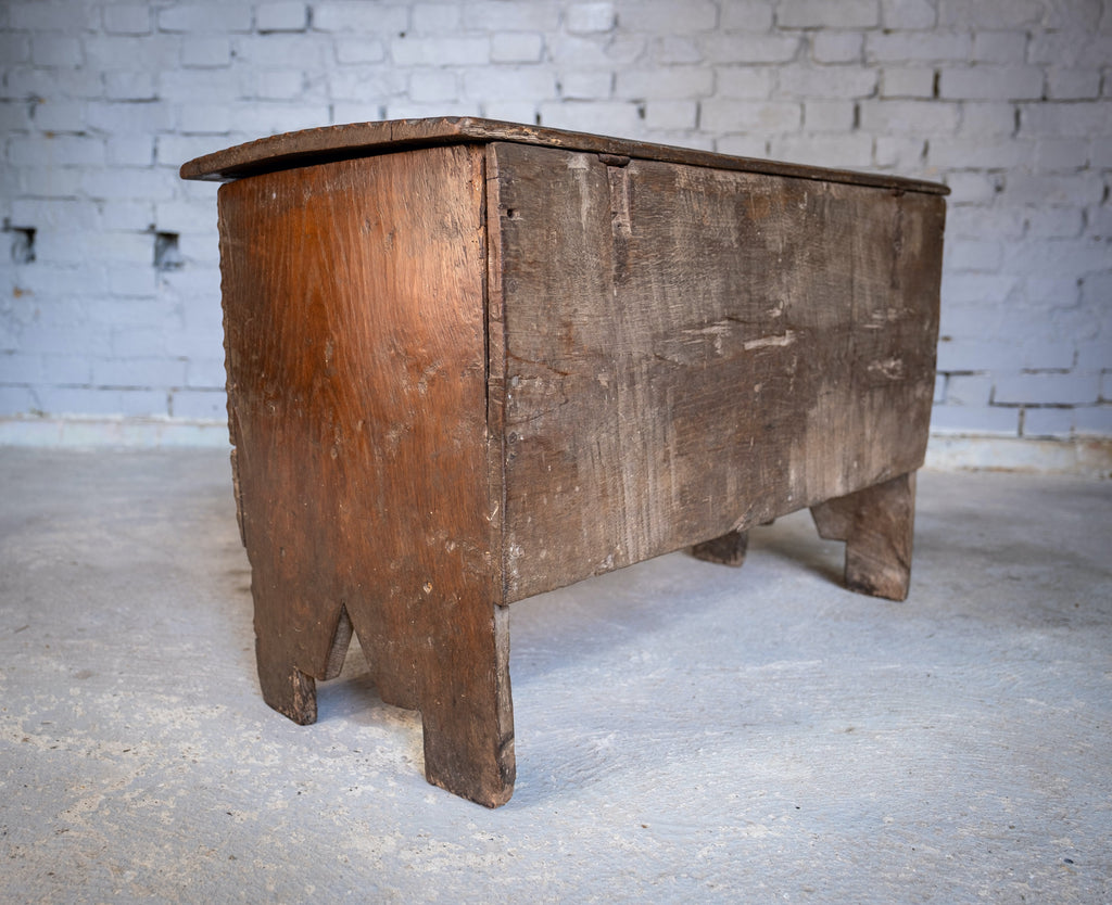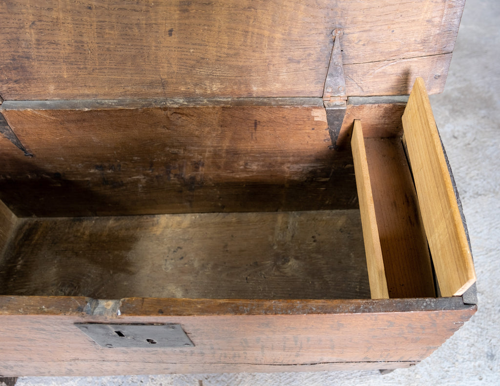 The coffer has a wonderful colour throughout and is very tactile. There is a wood shrinkage split across the front left of the coffer, and an area of warping to rear left joint. The lid has later replacement hinges and opens and closes with ease. The interior has a later candle box.