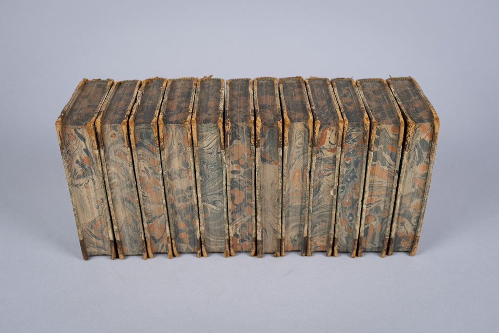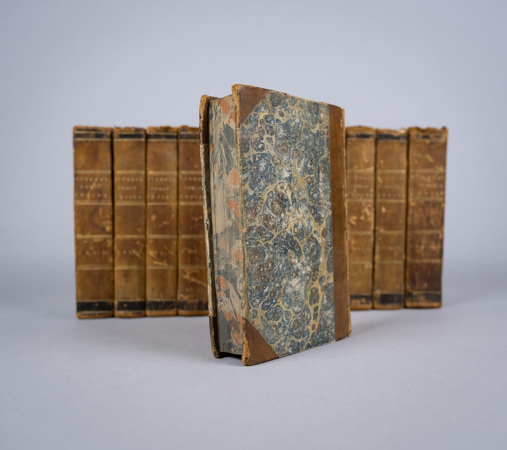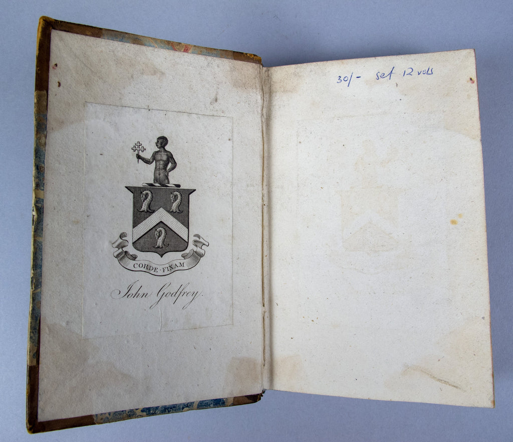 Boards measure 6.75" x 4". All boards are three-quarter bound in tan calf leather with marbled boards and gilt stamped titles to the spine. Shelf wear is evident to the extremities of all volumes. Bookplate and crest of 'John Godfrey' to the front pastedown of each volume. Frontispiece to Volume I. Small ink inscription to the front flyleaf of Volume I, otherwise all volumes are internally clean, bright and free from inscription.