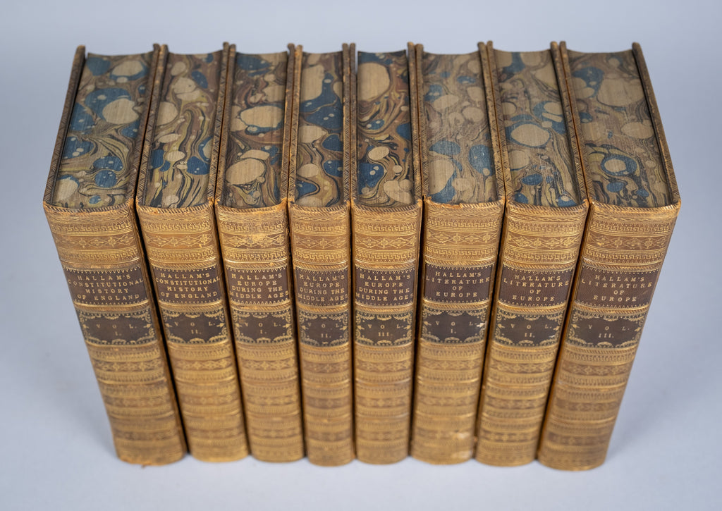 Marbled endpapers to each volume. Bookplate reading 'Drayton Manor - Sir Robert Peel Bar't' to the front pastedown of Hallam's Literature of Europe only. The front flyleaf of Hallam's Europe In The Middle Ages has a small pencil inscription citing the complete set. All pages are clean and bright.
