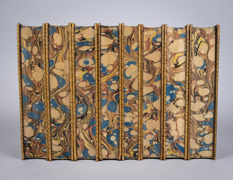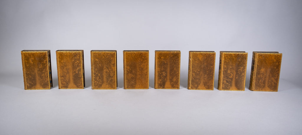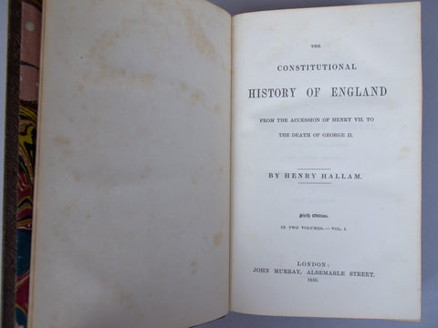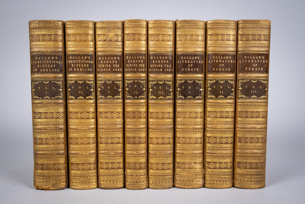 Octavo. All boards are uniformly bound in a fine tree calf leather gilt stamped foliate borders to the boards. The spines have five bands, intricate gilt stamped decoration, a maroon leather gilt stamped title panel and a dark brown leather gilt stamped volume panel. Page edges marbled. Some volumes show some rubbing to the extremities in areas, most notably Vol I of Hallam's Literature Of Europe and Vol I of Hallam's Europe In The Middle Ages. Generally all volumes remain in a very good condition overall.