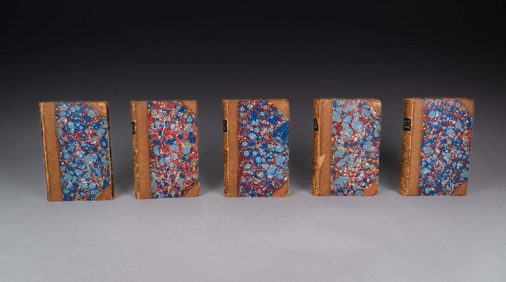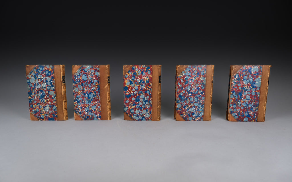 Each volume is three quarter bound in a tan leather with five raised bands and black leather title panels to the spine. Marble boards. All volumes show signs of shelf wear, volume V showing more wear than others, with some losses and tears to the leather at the spine. The boards remain firmly attached.