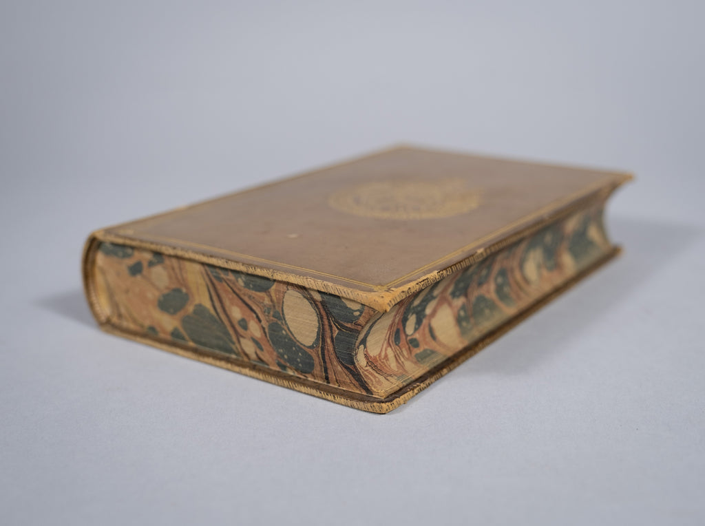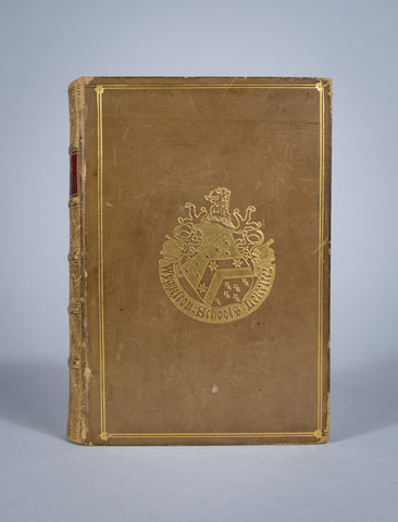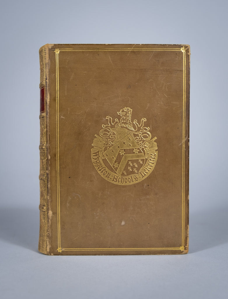 Fully bound in tan calf leather prize binding with gilt stamped decoration to the boards. The spine boasts five raised bands, red leather title panel and ornate gilt stamped decoration. There is shelf wear present to the extremities and back board.