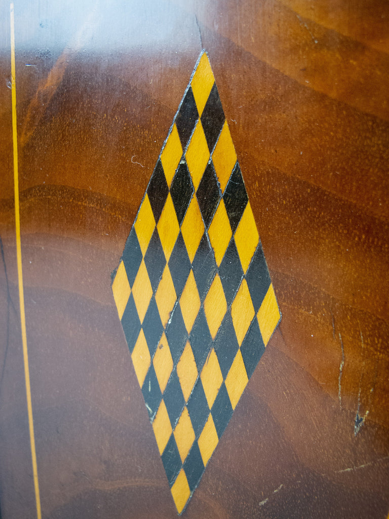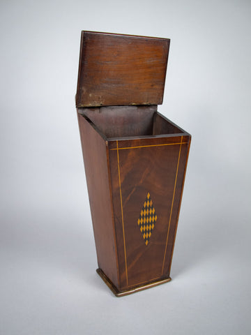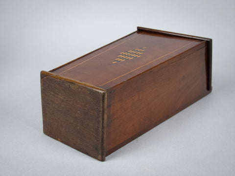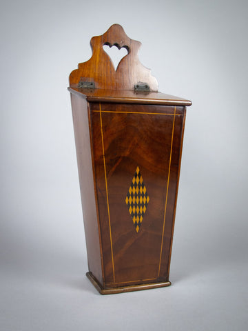 A charming George III mahogany candle box with an unusual central parquetry design.